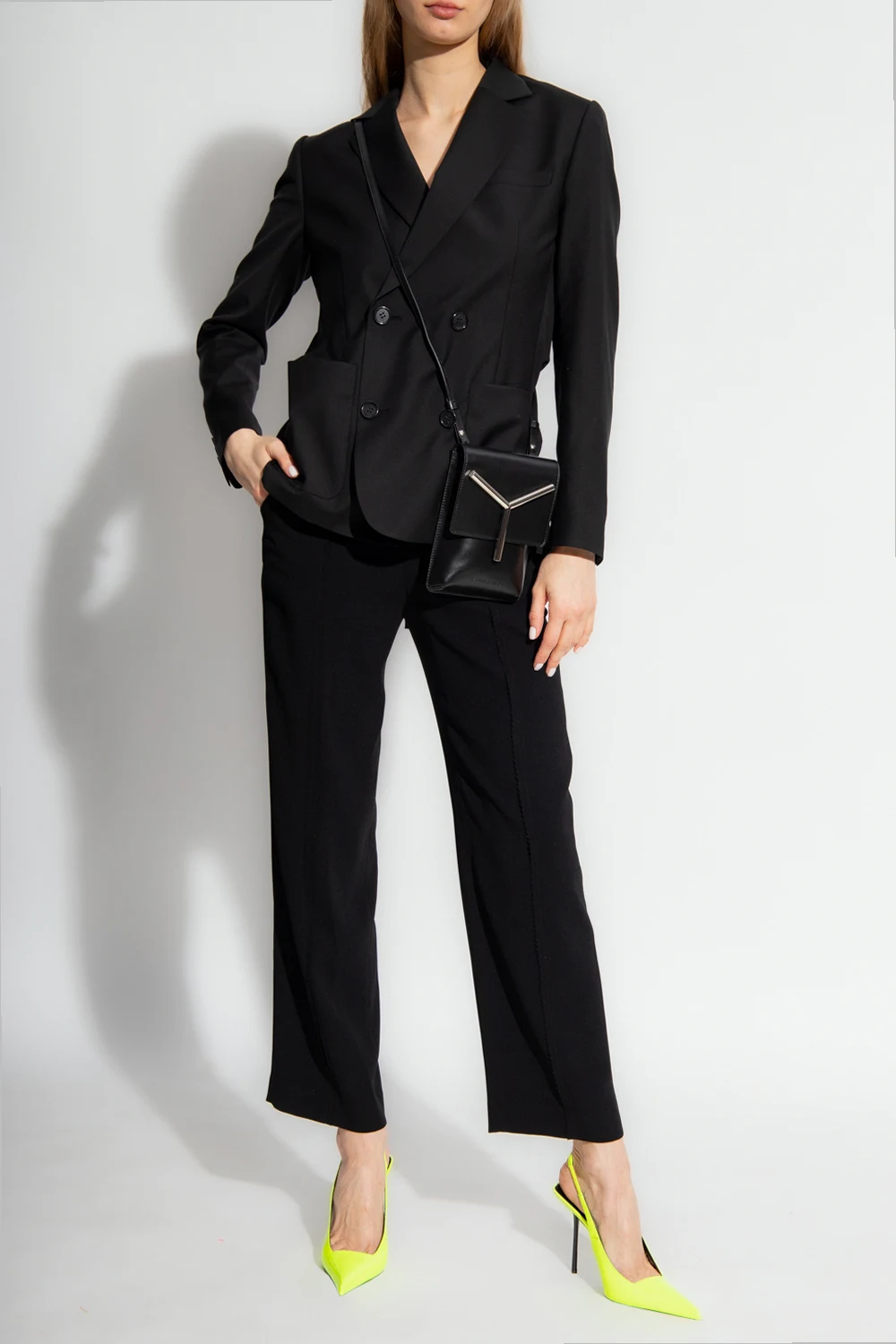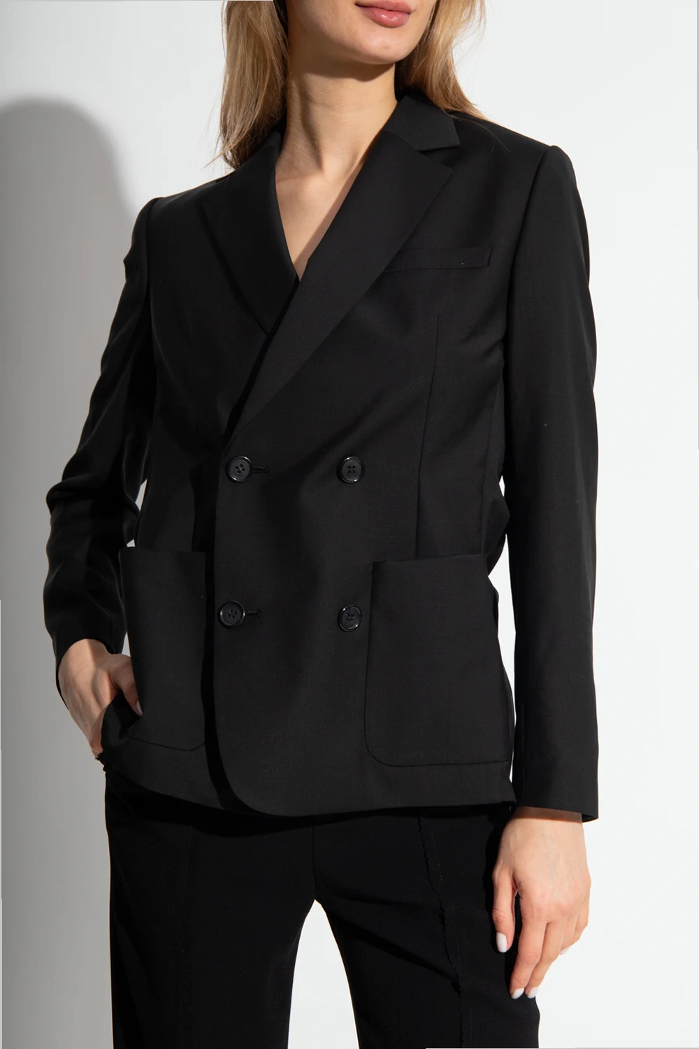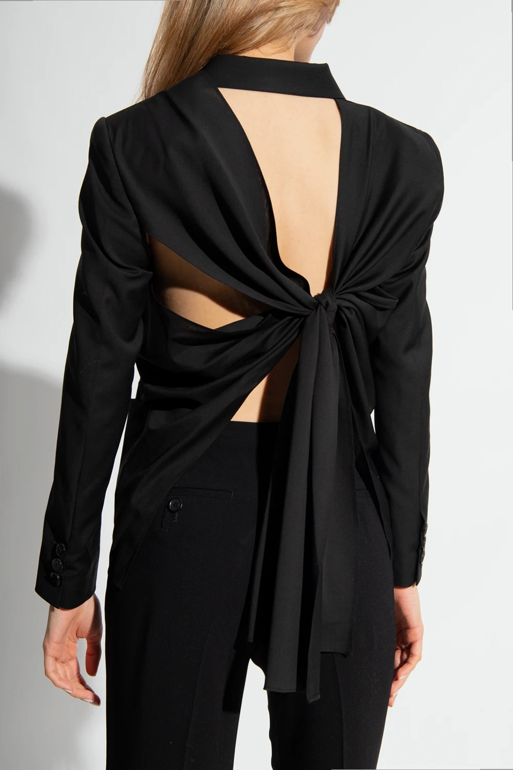 Black double-breasted blazer from Undercover. Crafted from wool, this design features button fastenings, decorative bow with cut-outs at the back, two slip pockets, notch lapels and long sleeves with buttoned cuffs.