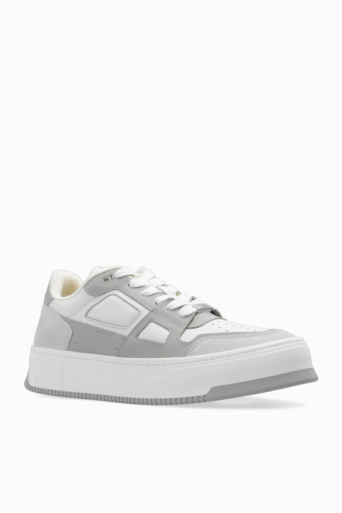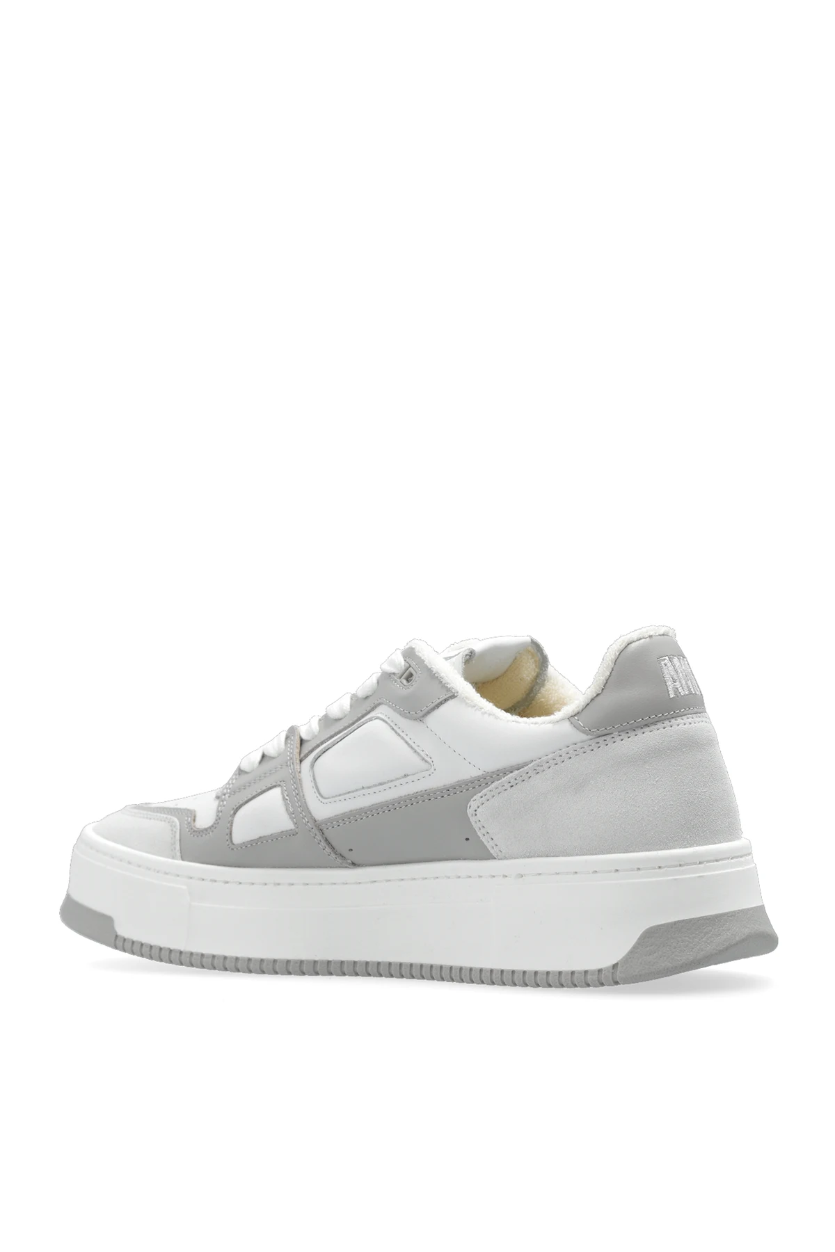 White and grey ‘New Arcade’ sneakers from Ami Alexandre Mattiussi. Made from leather and suede, this lace-up pair features perforations on the front, a logo detail and rubber sole in grey and white.
