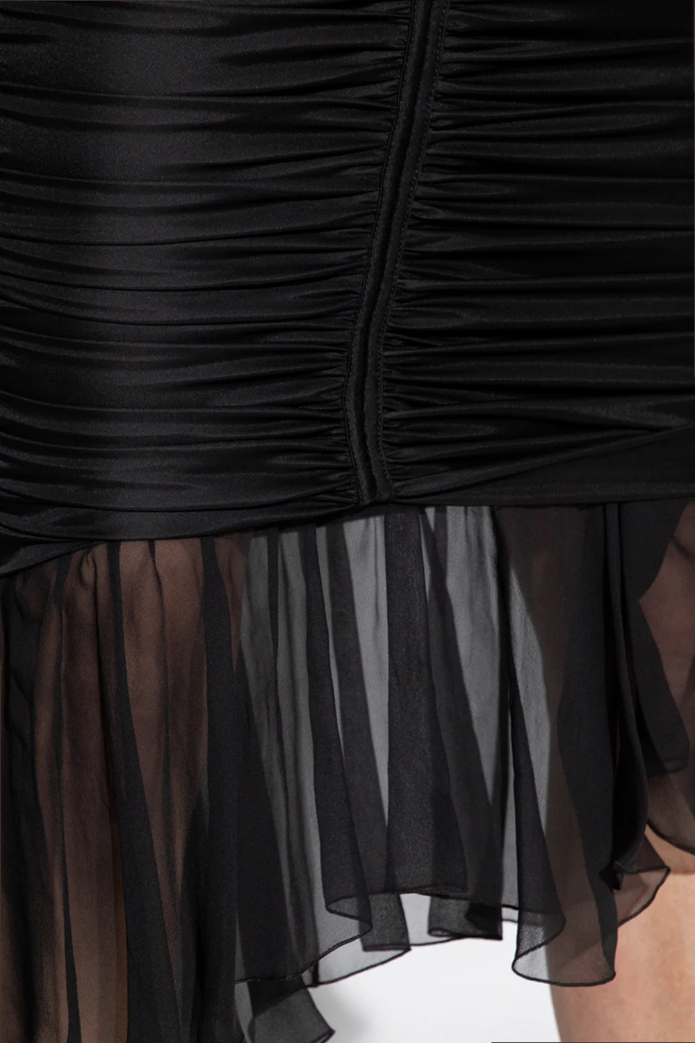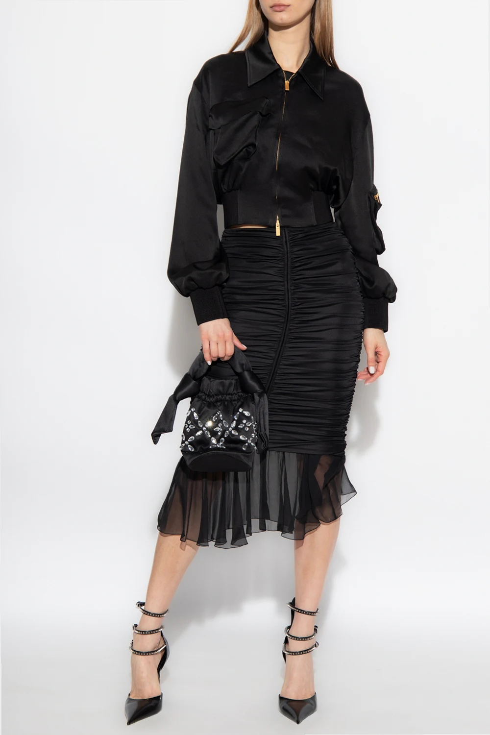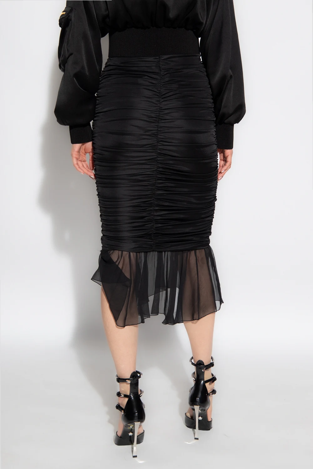 Black skirt from Blumarine. Crafted from stretchy material with a glossy texture, this style features a form-fitting silhouette, gathered detailing and a chiffon ruffle at the hem.