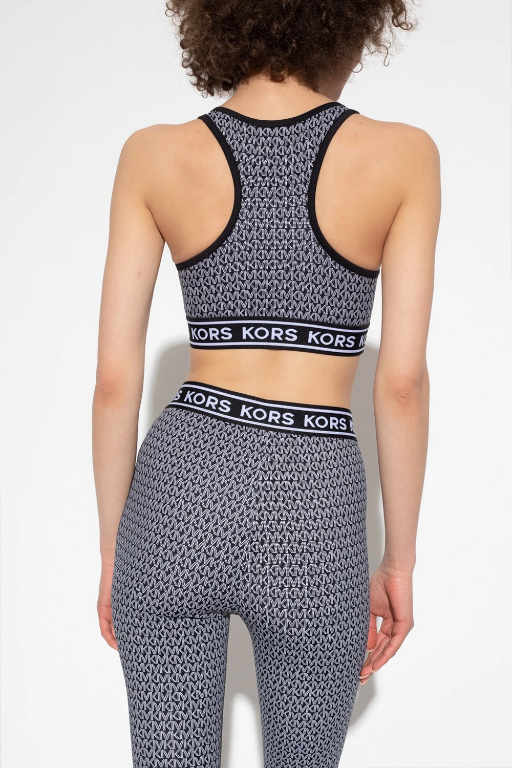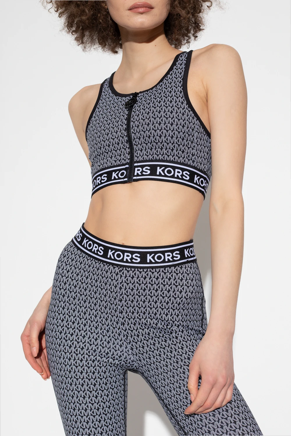 Black and white sleeveless training top from Michael Michael Kors. Crafted in part from recycled material, this style showcases a monogram pattern, a cropped fit, a front zipper with a logo puller and an elasticated waistband with a logo.