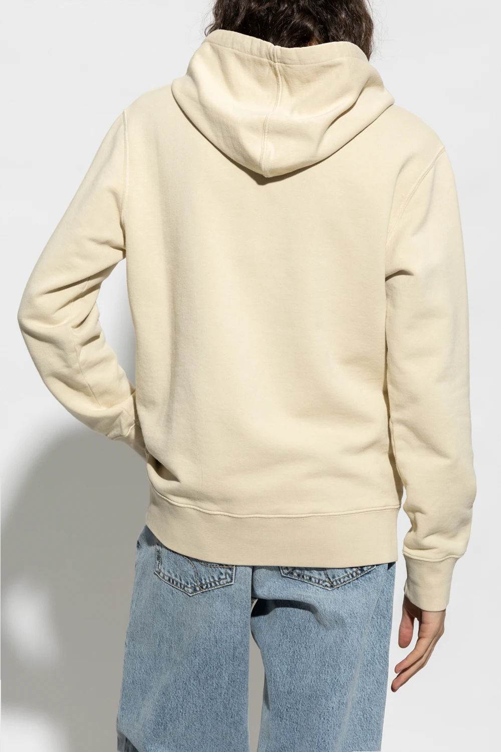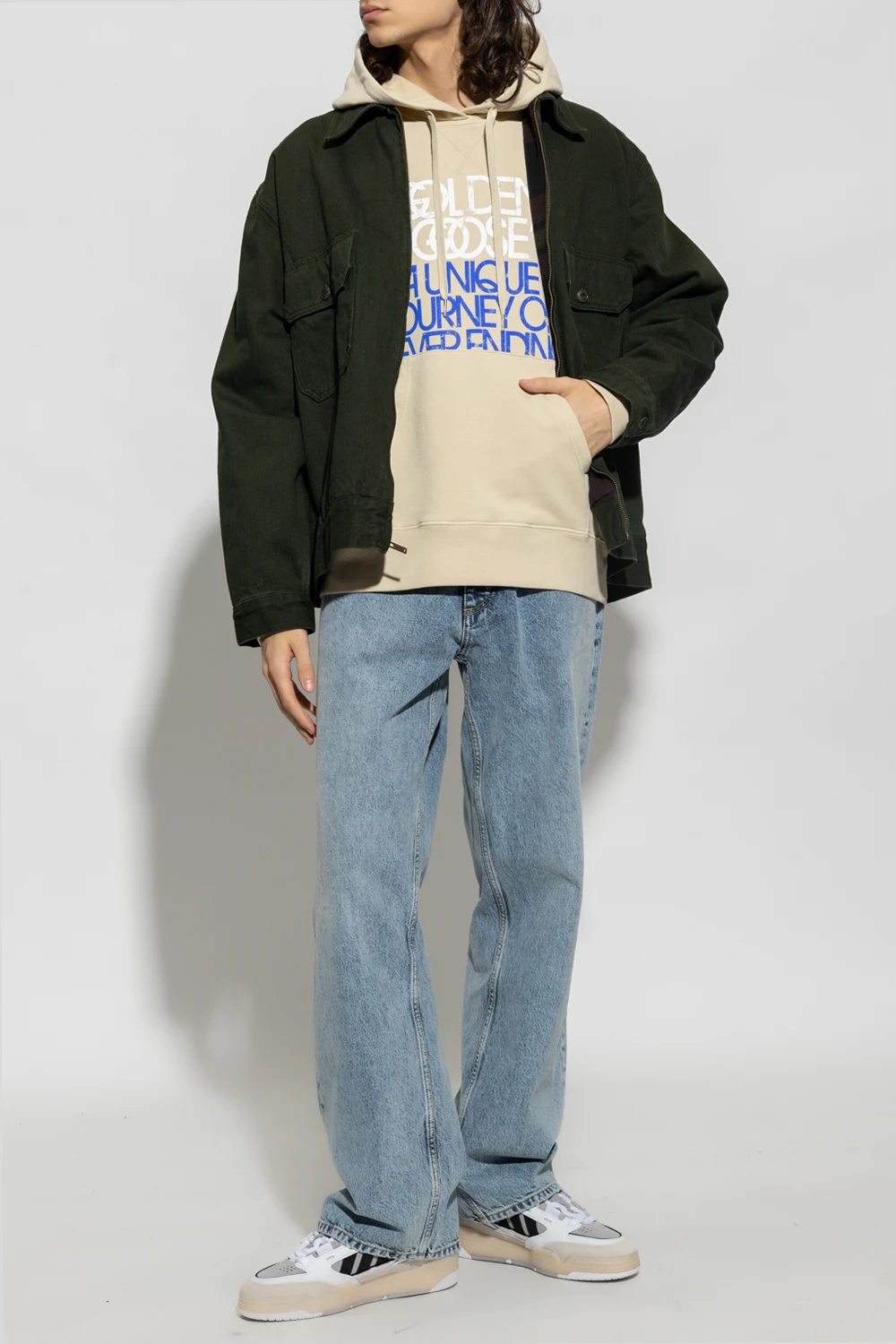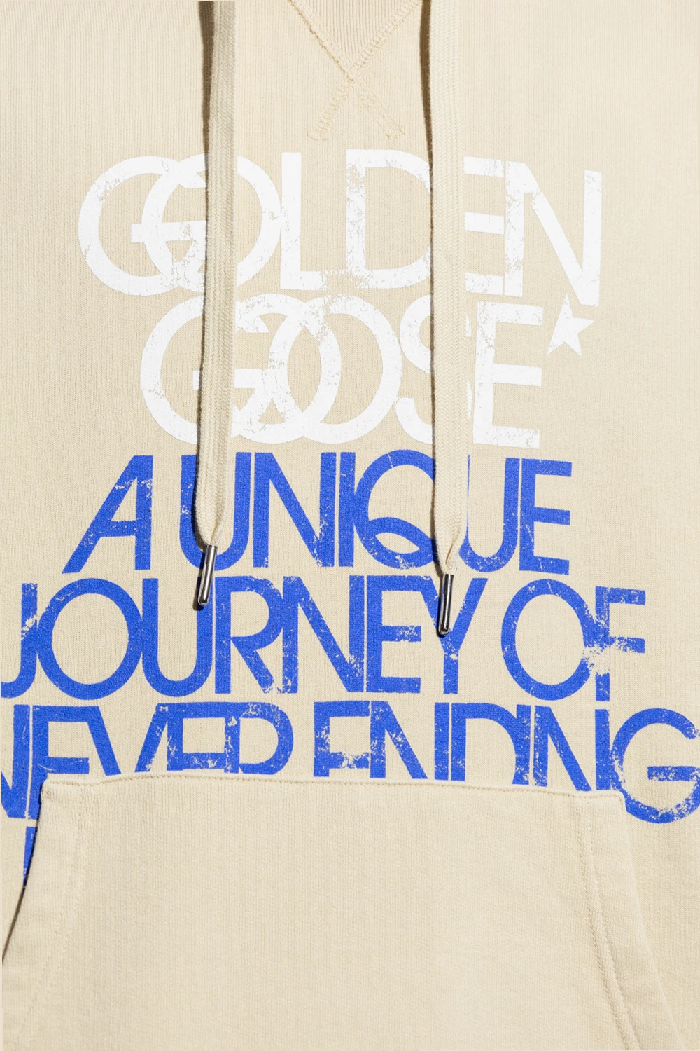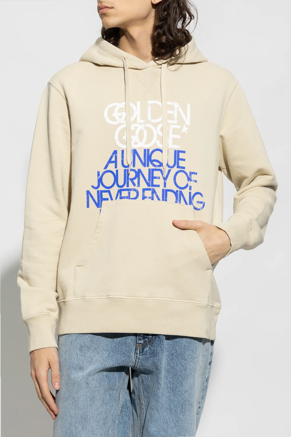 Beige sweatshirt with a drawcord-adjustable hood from Golden Goose. Crafted from cotton jersey, this style features a white and blue graphic print with the brand's logo, a kangaroo pocket, long sleeves and a ribbed bottom hem and cuffs.
