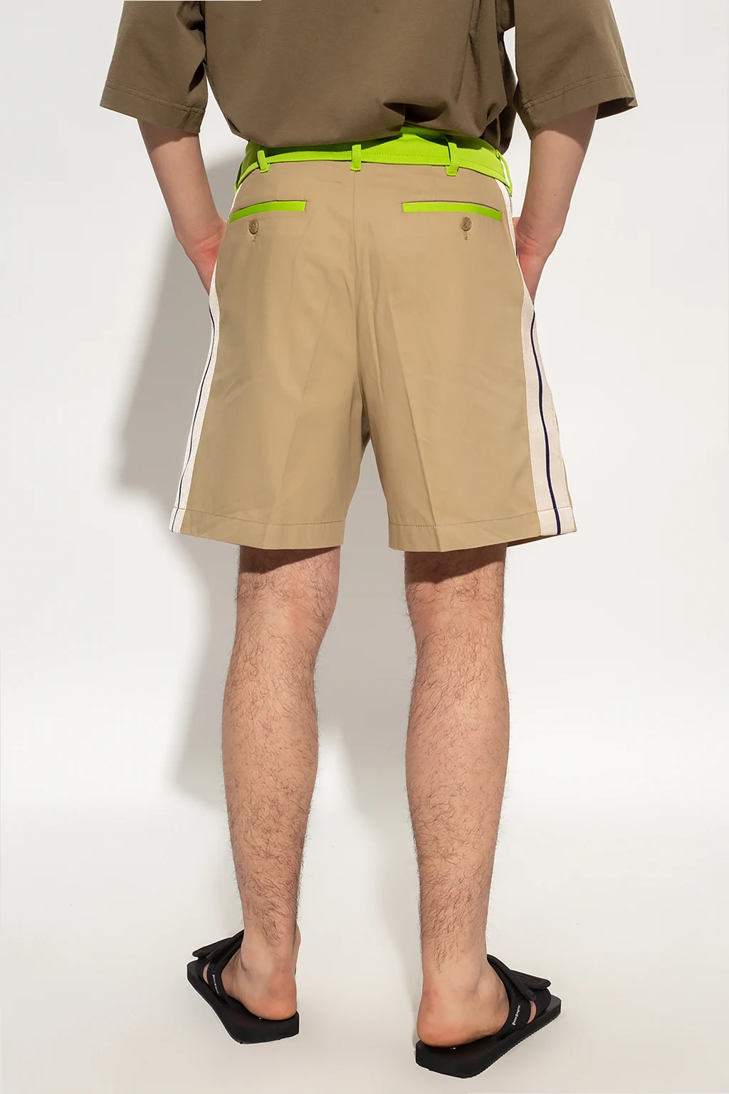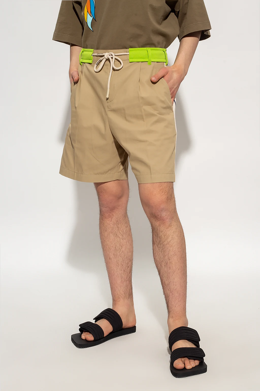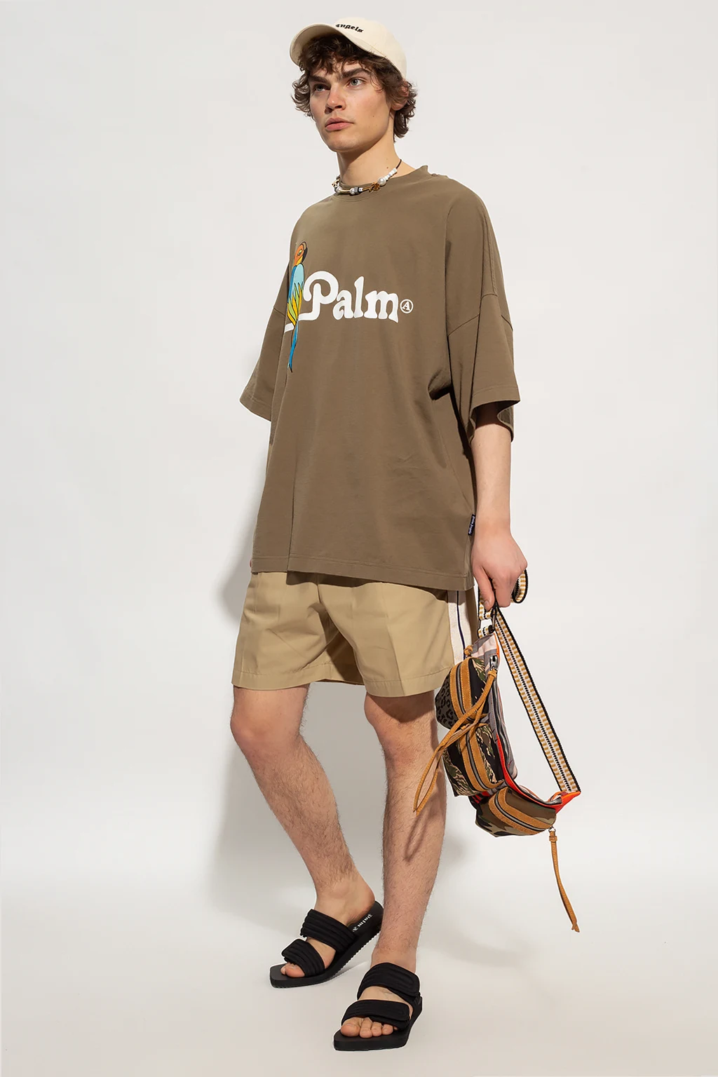 Beige shorts from Palm Angels. Made of cotton, this pair features a zip fly with a hook, branded drawstrings, a light green insert at the waist, two frontal slip pockets, two back button pockets and beige and navy blue panels on the sides.