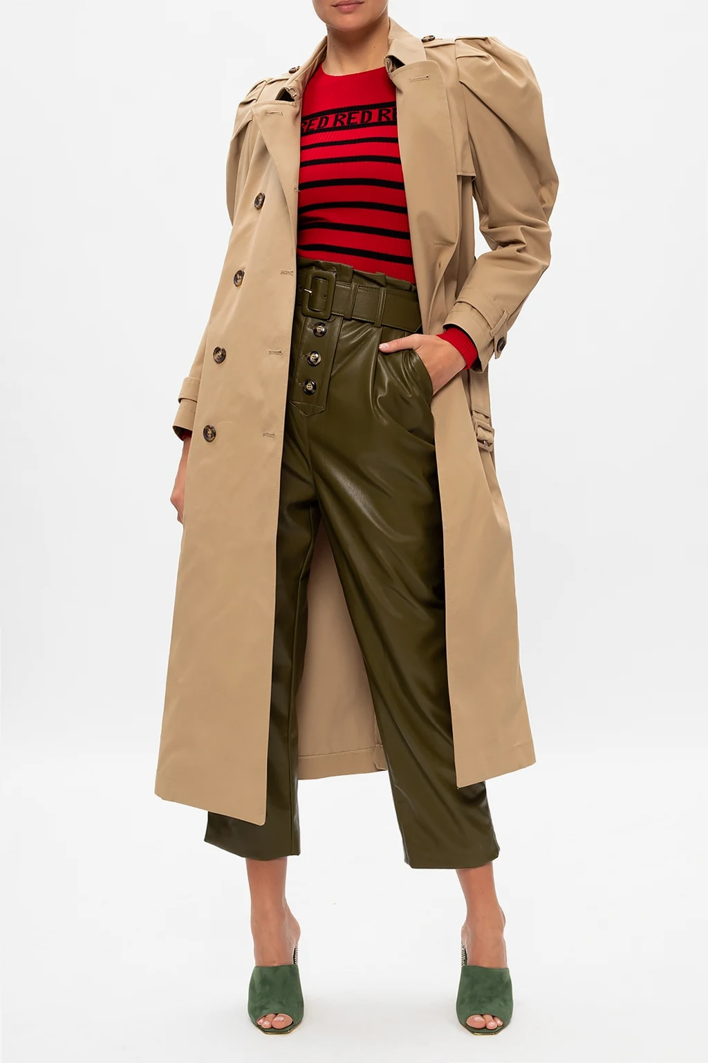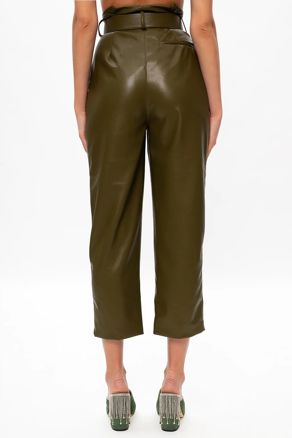 Green trousers from Self-Portrait. Tailored from eco-leather to a slender silhouette sitting high on the waist, this pair features button fastening, two side seam pockets, one welt back pocket, frontal darts, a buckle belt and cropped legs which taper toward the ankles.