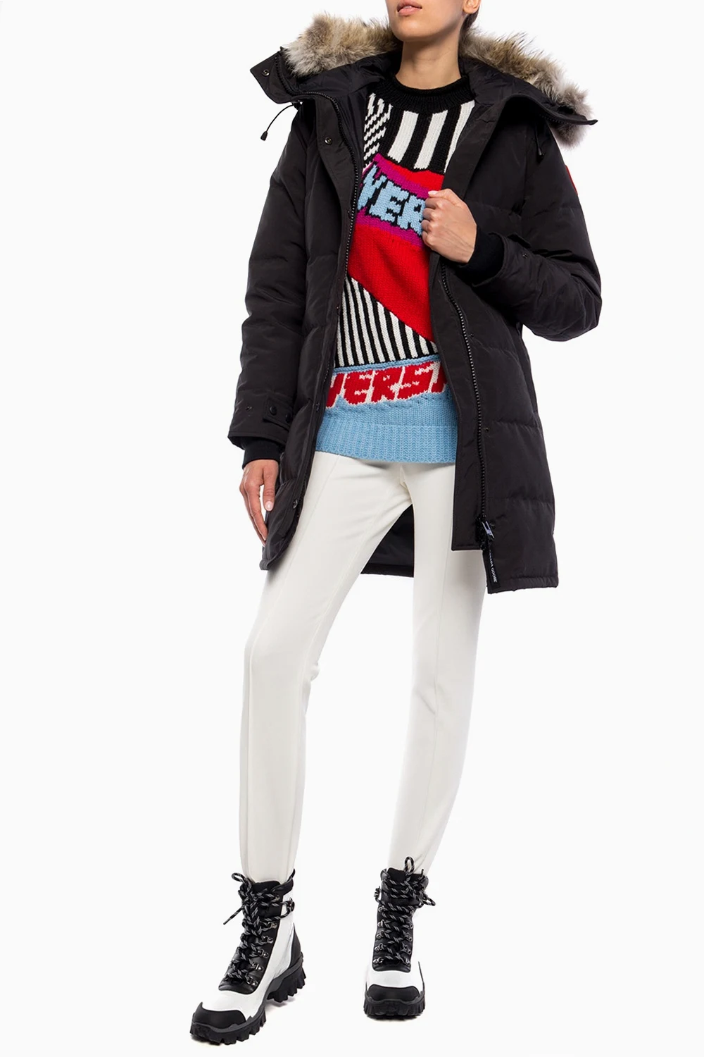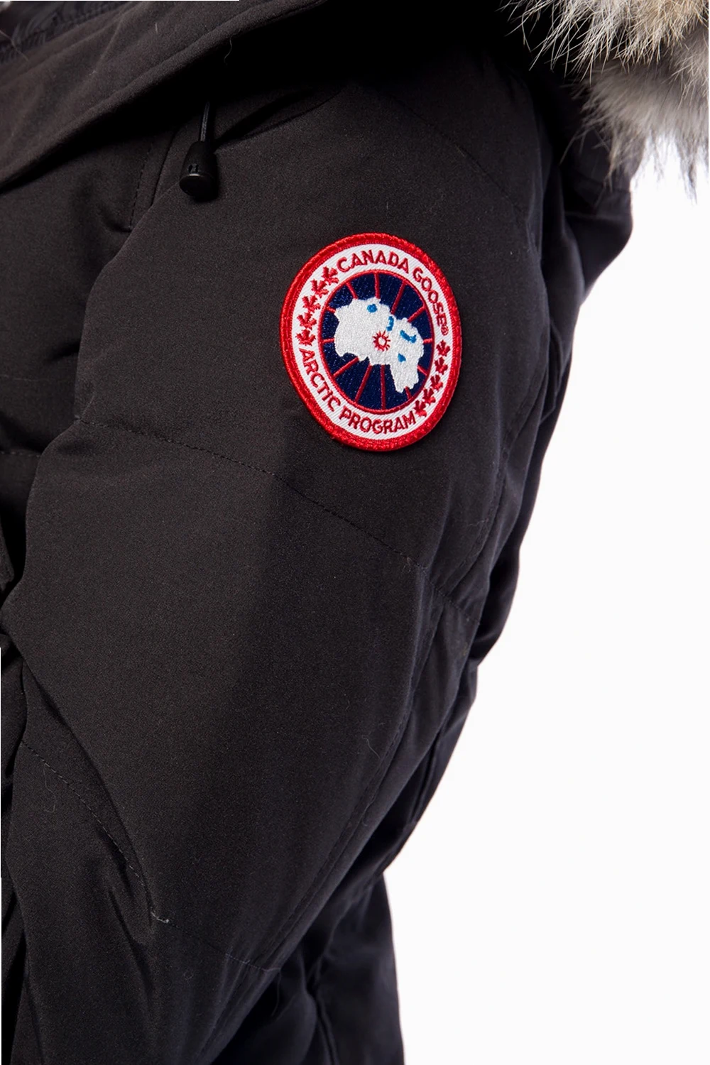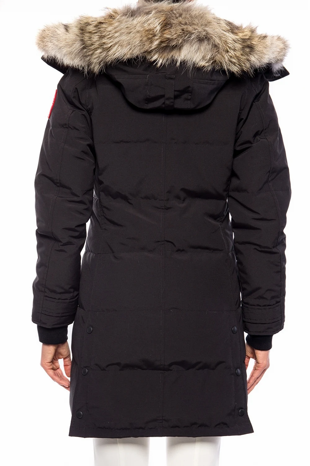 Black ‘Shelburne’ hooded jacket from Canada Goose. Fastened with two-way zip and snap-buttons. Embellished with red-blue-white logo patch. It features grey and beige fur trimming, 2 snap-fastened pockets on the front, single split vent on the back, elasticated cuffs and drawstring ties to the hood.