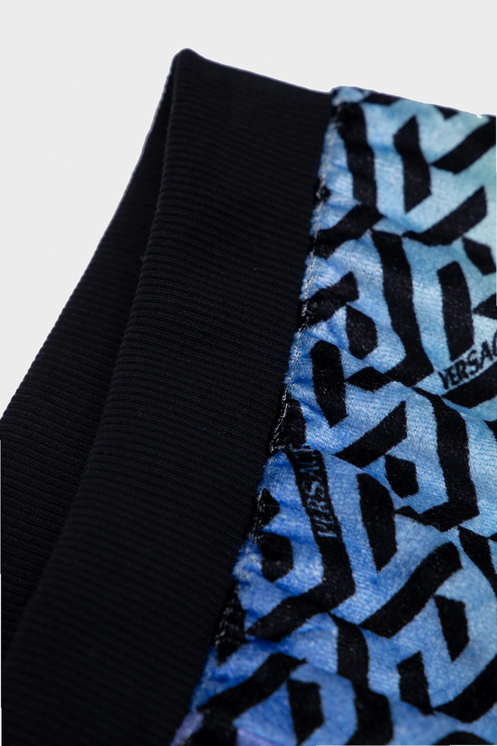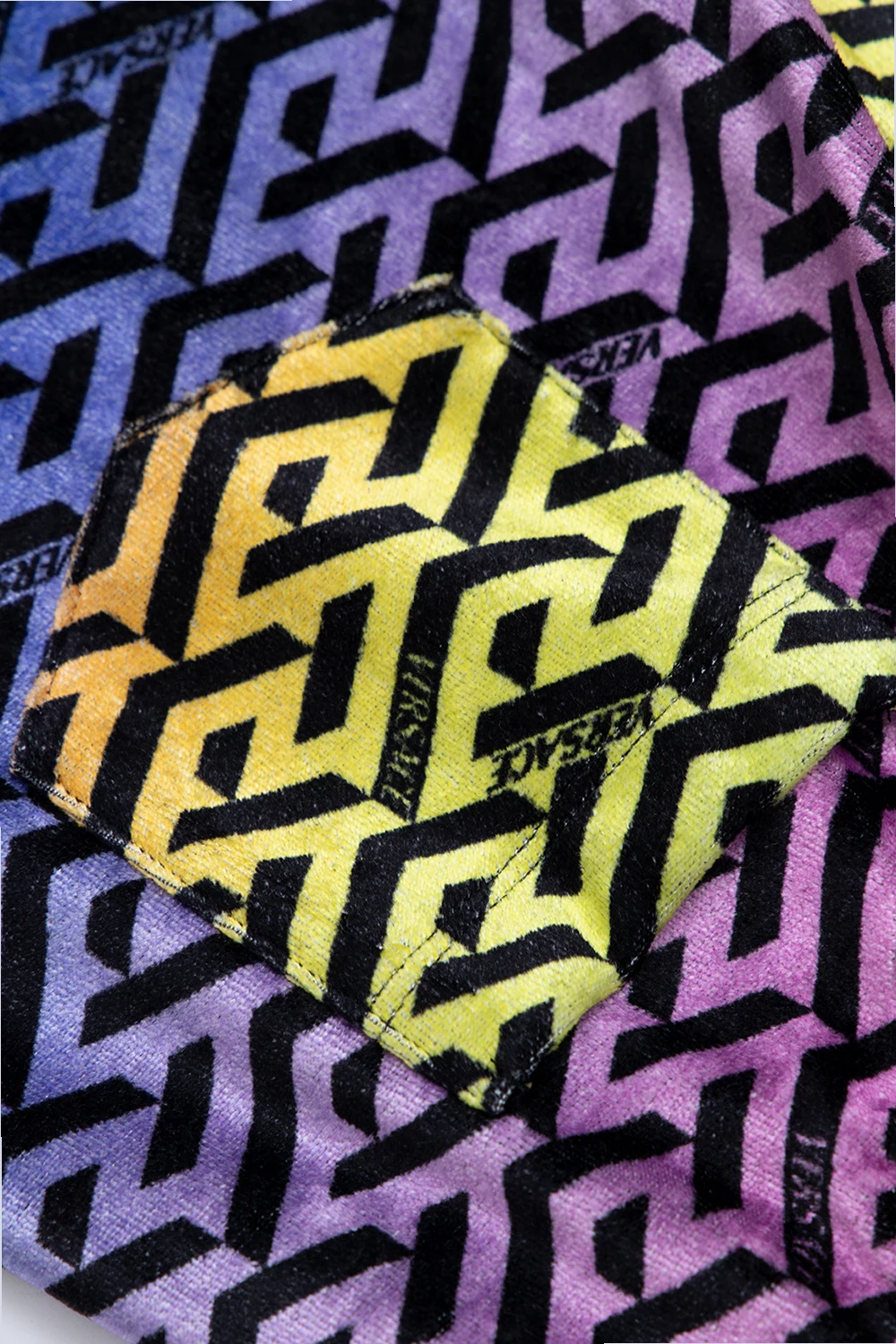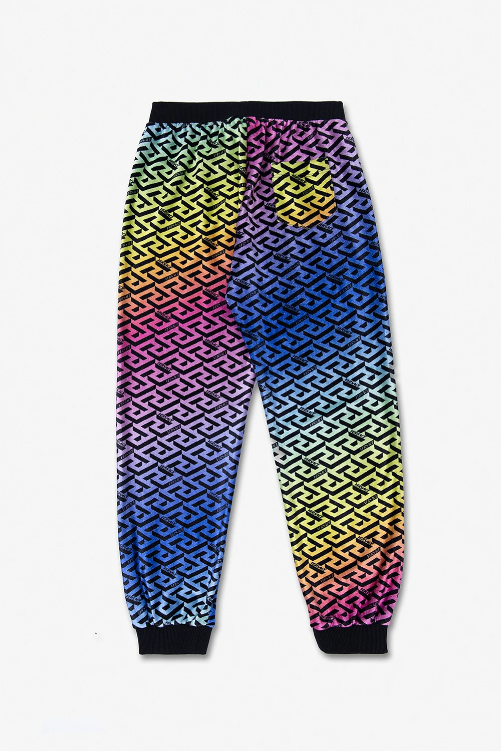Multicolored trousers from Versace Kids. This pair features a velour finish, elastic waistband, La Greca pattern, decorative gradient effect, back pocket and elasticated cuffs.