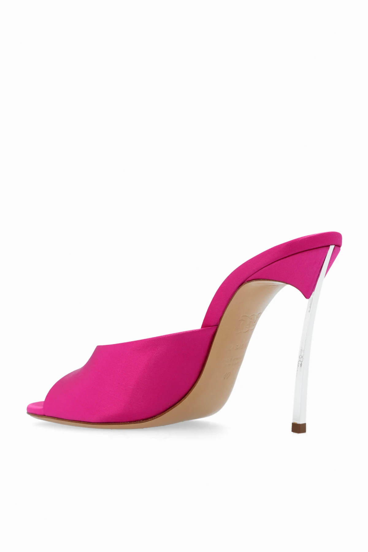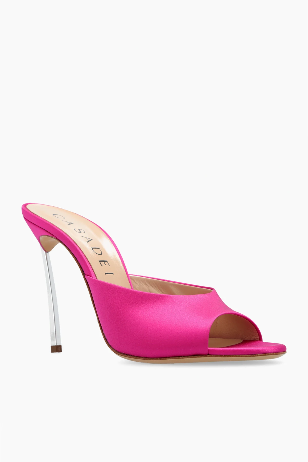 Dark pink ‘Blade’ heeled mules from Casadei. Crafted from silk satin, this almond toe pair features the brand’s signature stainless steel heel and beige leather sole.