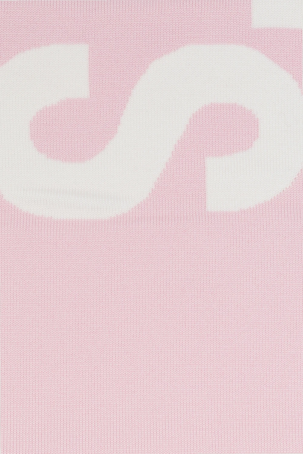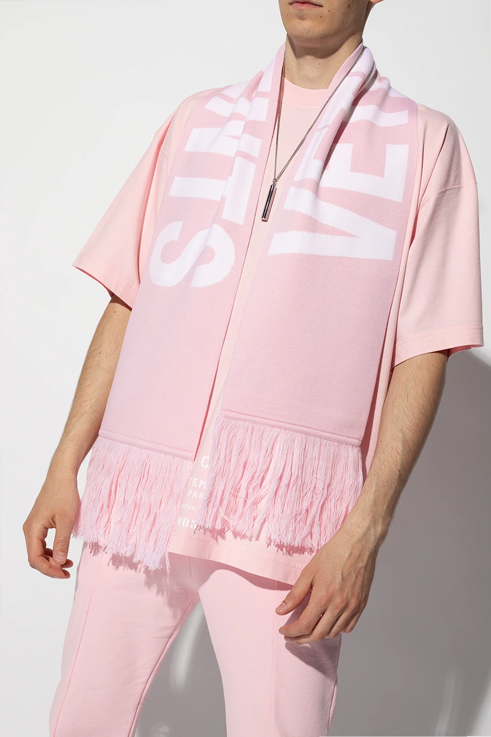 Pink and white scarf from VETEMENTS. Made of wool, this design features a logo embroidery and fringe ends.