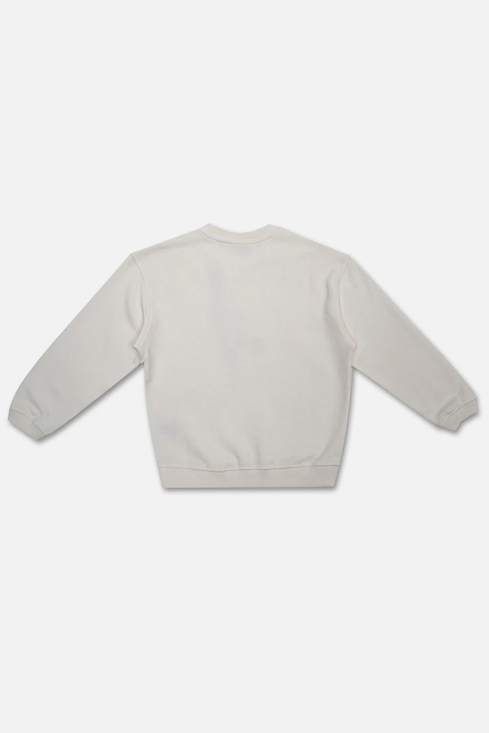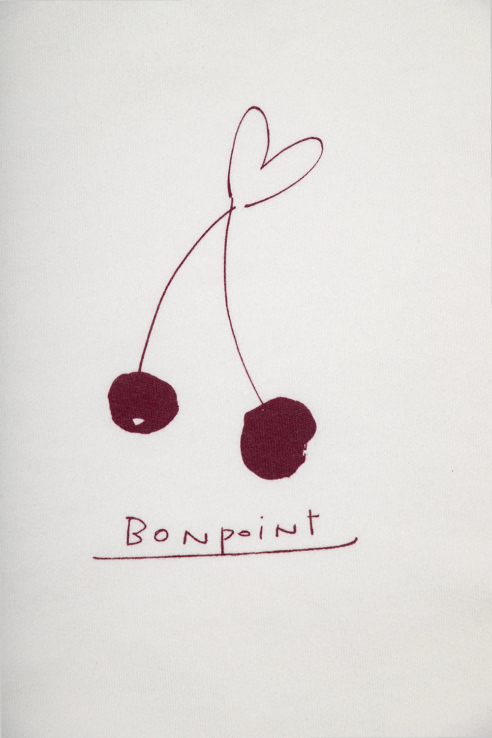 White crewneck sweatshirt from Bonpoint. Made of cotton, this long sleeve design features the brand’s signature cherry motif in maroon and ribbed trims at the hem nad cuffs.