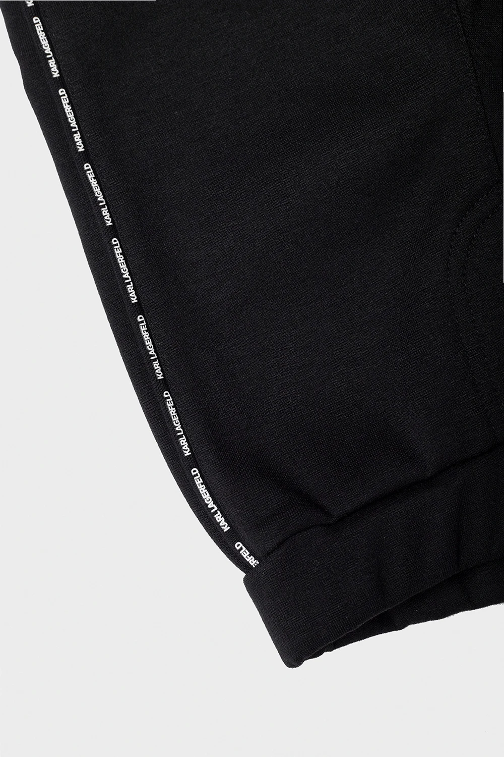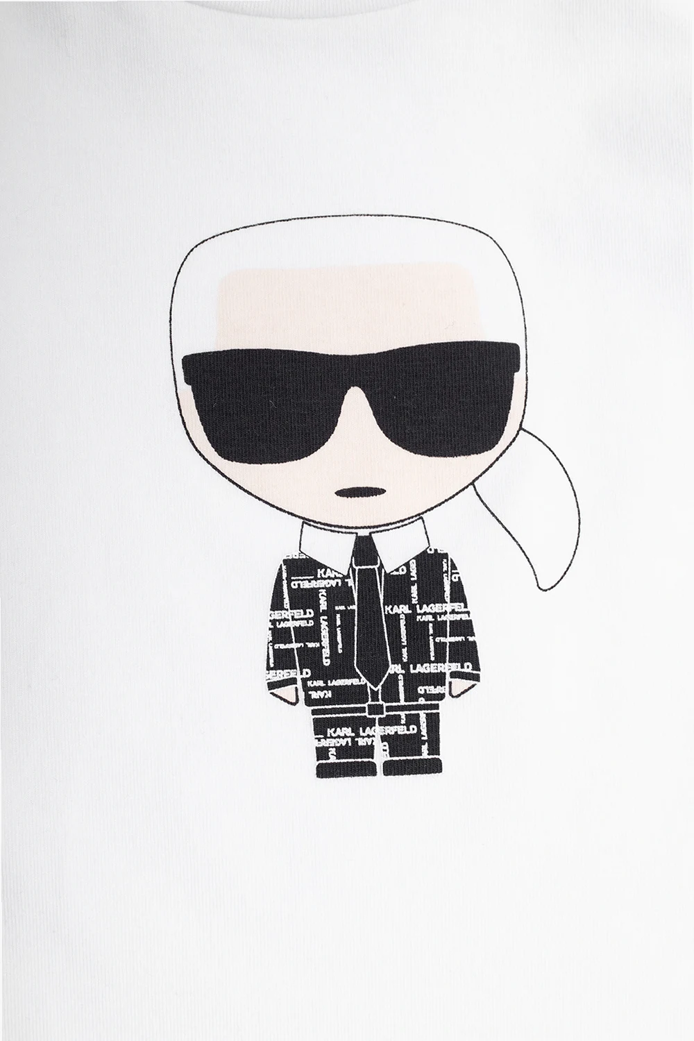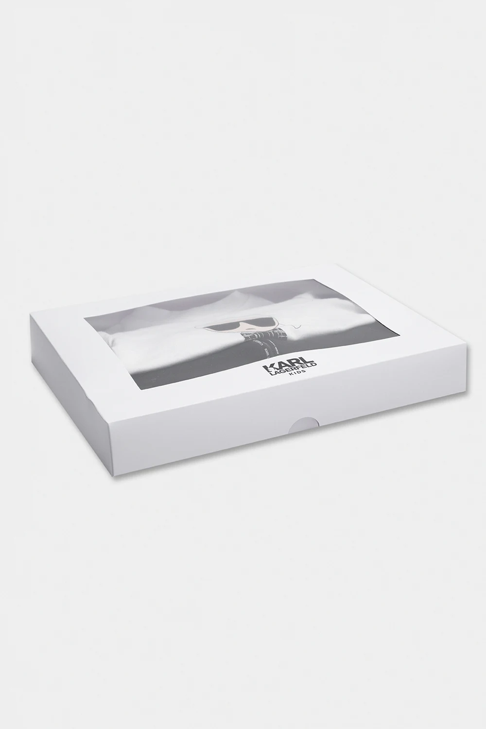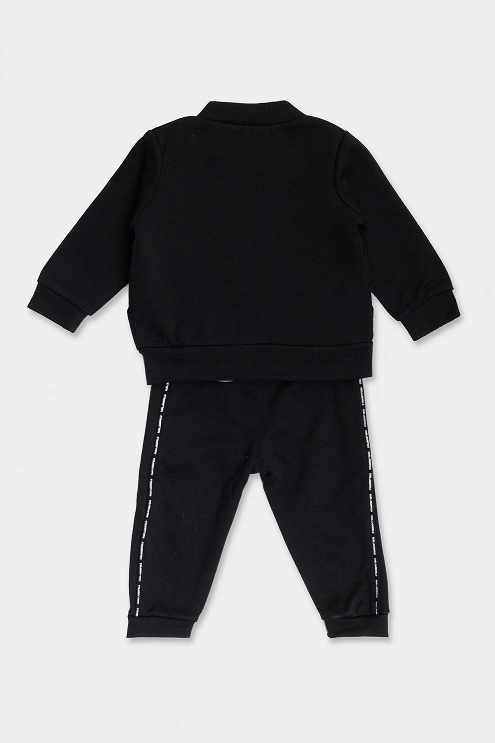 Apparel set from Karl Lagerfeld Kids. It includes a black sweatshirt made of a fabric blend featuring a logo patch, two frontal pockets and long sleeves; a white crewneck T-shirt made of 95% cotton with snap closures, long sleeves and a colourful logo print on the front; black sweatpants made of fabric blend featuring an elasticated waistband and cuffs and a white logo print.