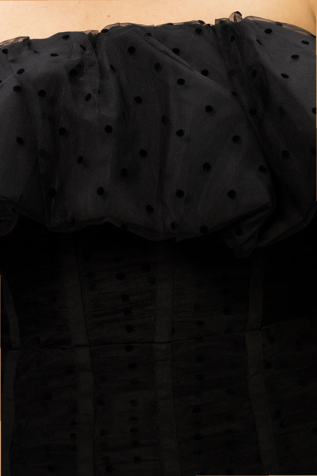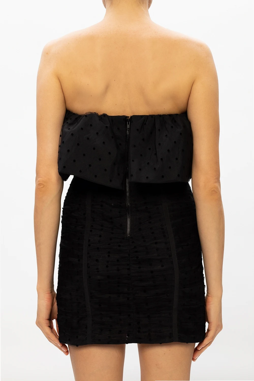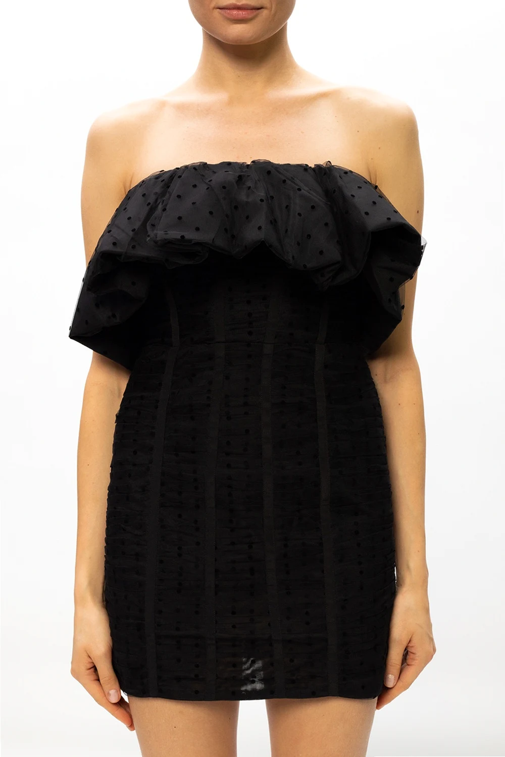 Black short dress from Self Portrait. Fastened at the back with a zip, this design features a decorative ruffle and inserts decorated with a polka dot print.