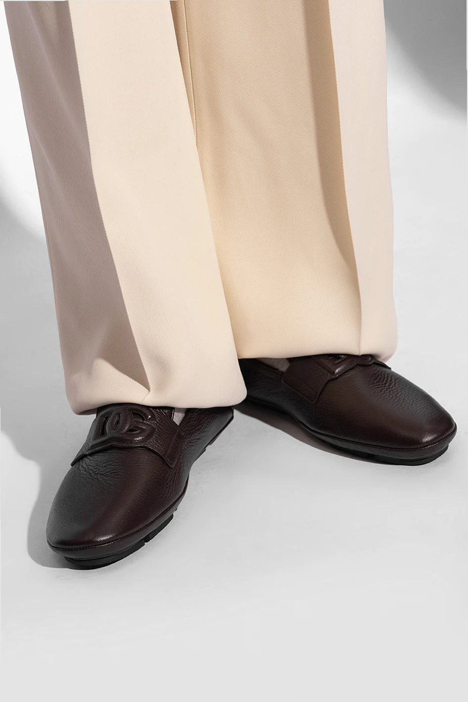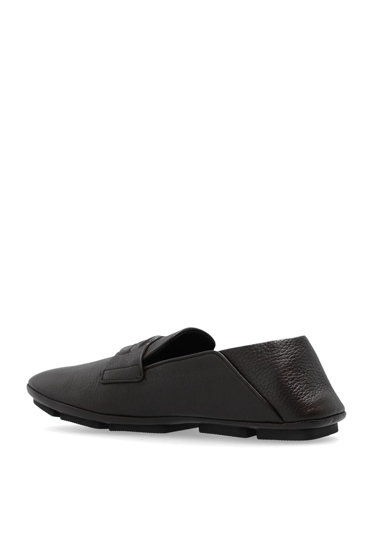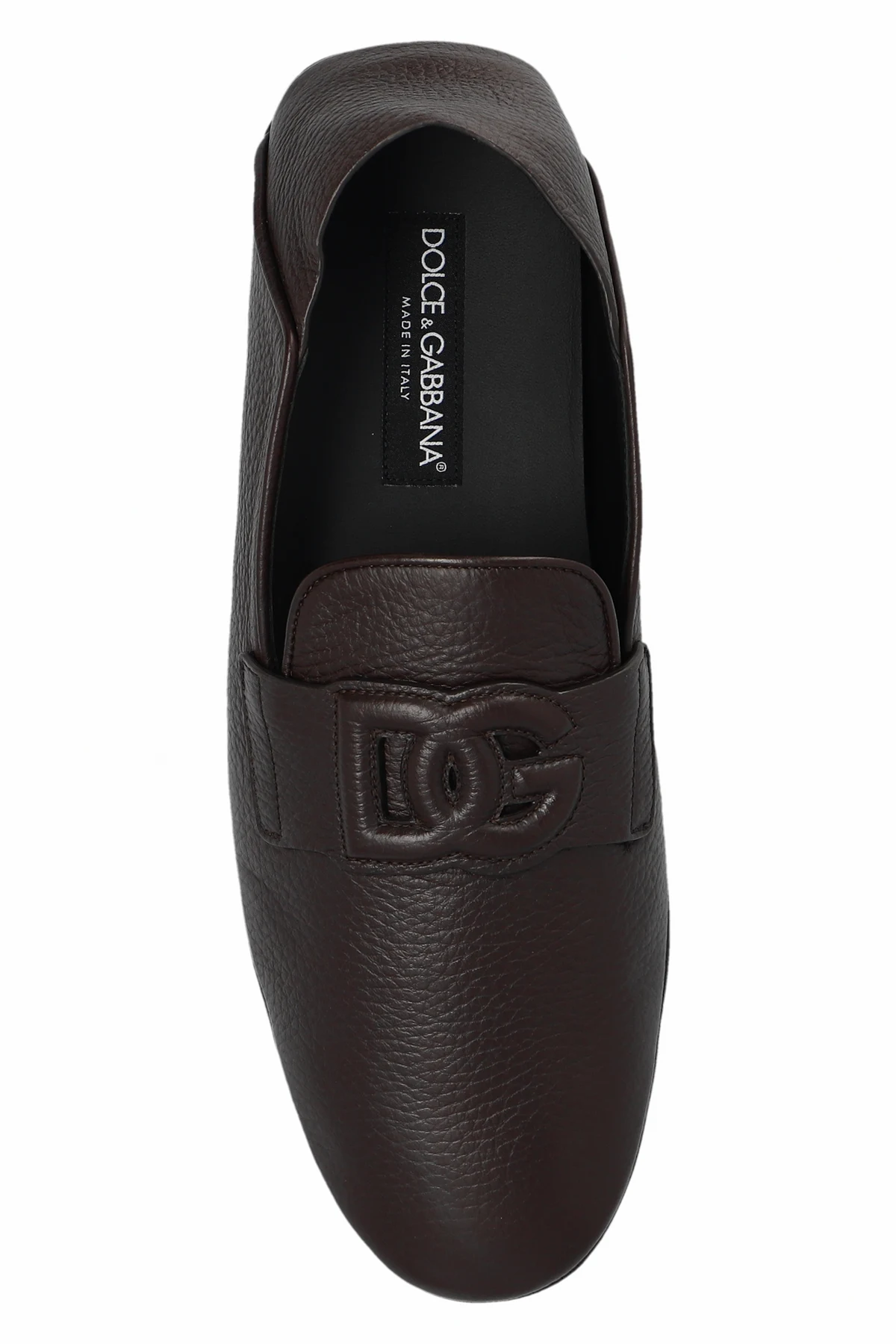 Dark brown loafers from Dolce & Gabbana. Made from grained leather, this model sits on a black rubber sole and showcases a branded strap on the front.