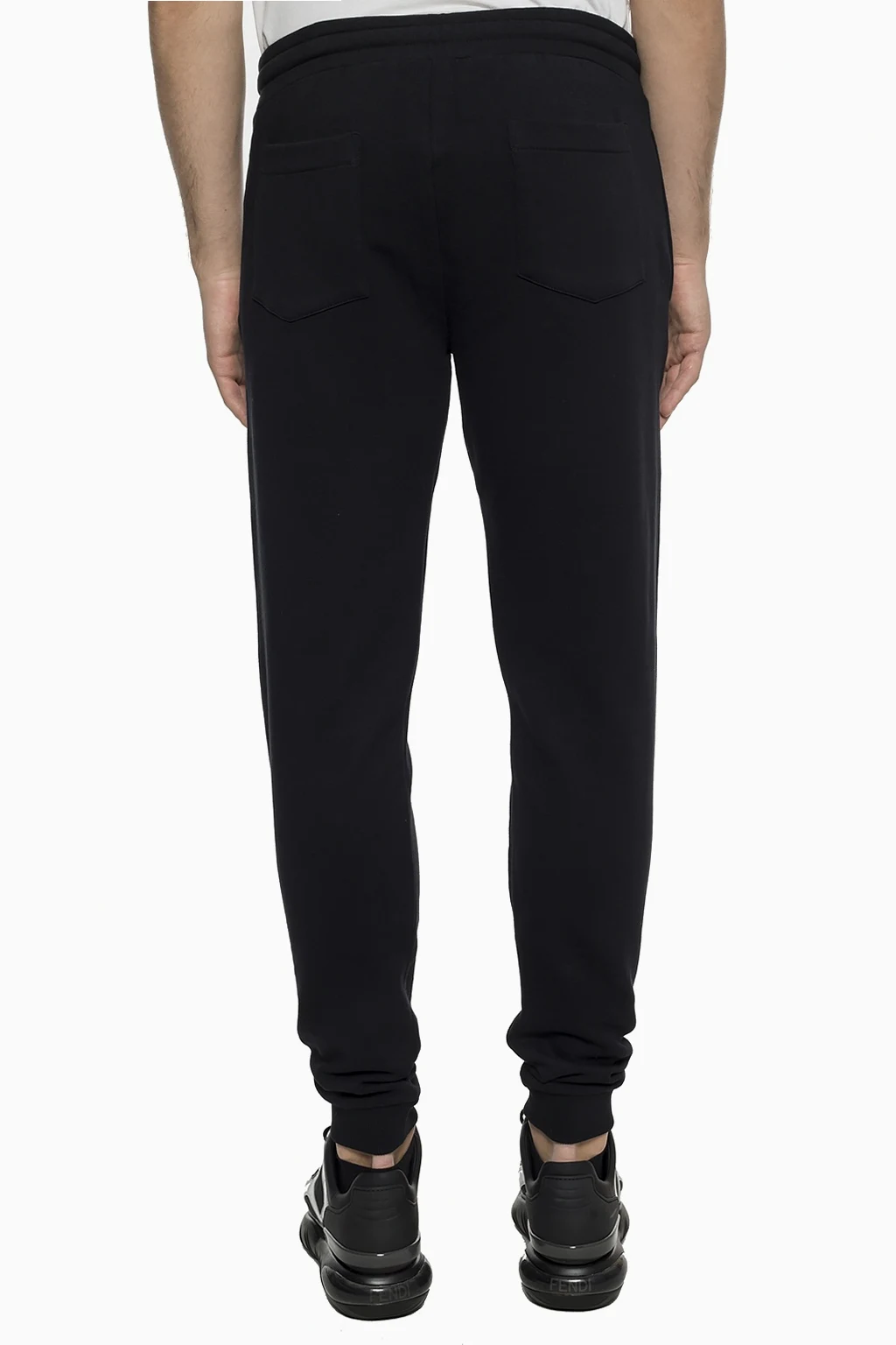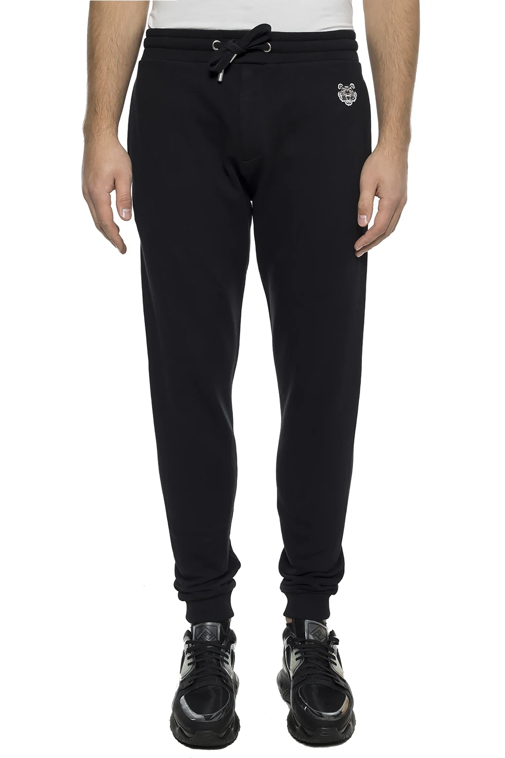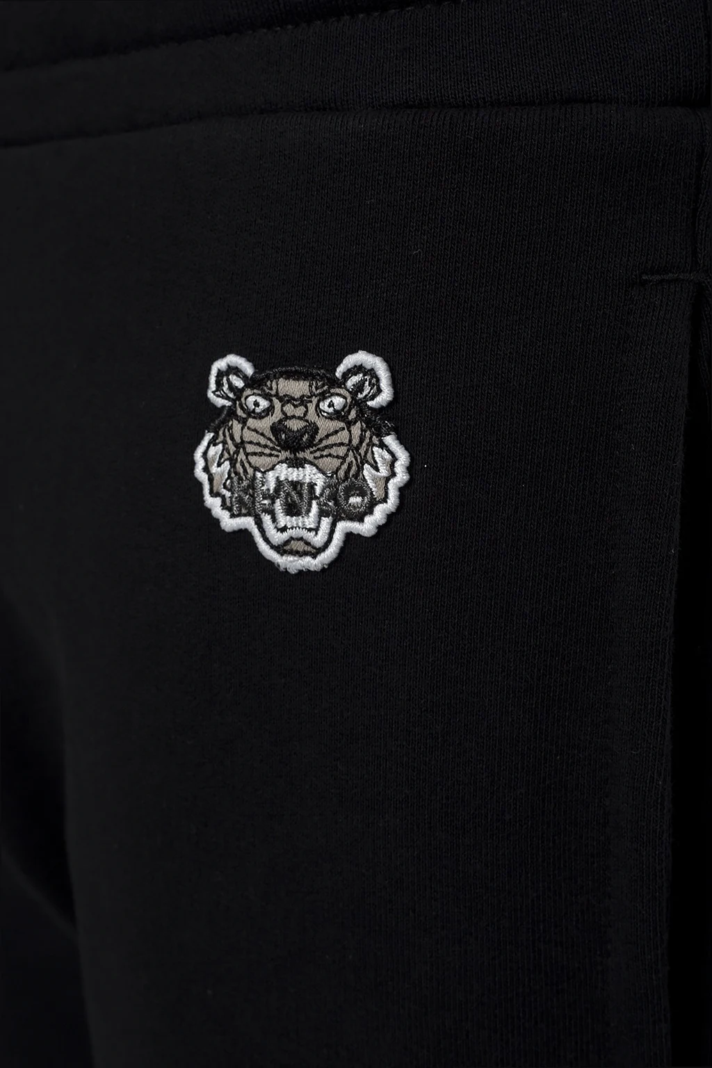 Black, cotton sweatpants from Kenzo. Pulled with straps. At the waist a sewn in elastic rubber. Four inset pockets: two on the front and back. On the front a sewn on application including a tiger head motif characteristic for the brand in white, black and grey. Tapered legs finished with welts.