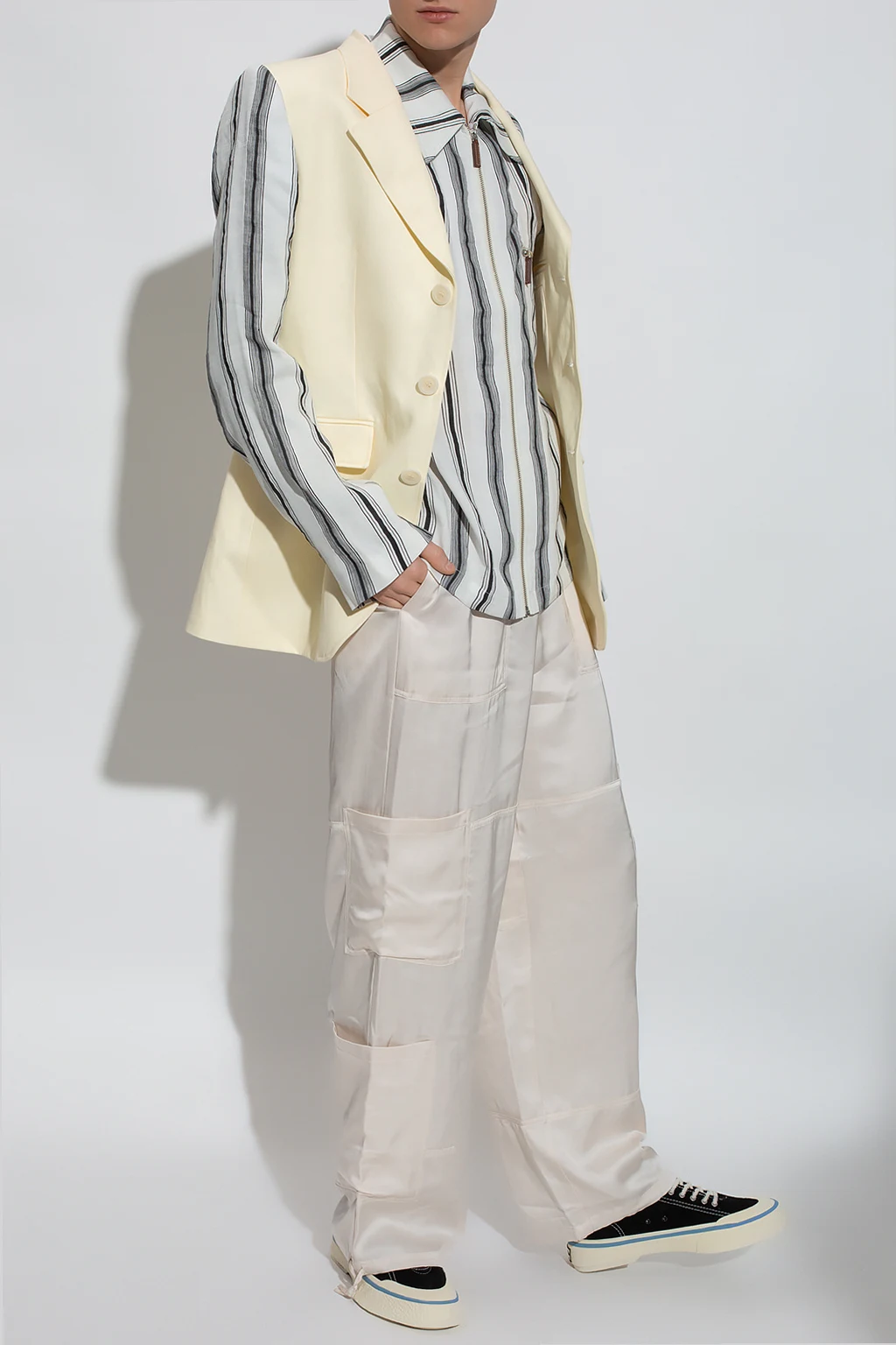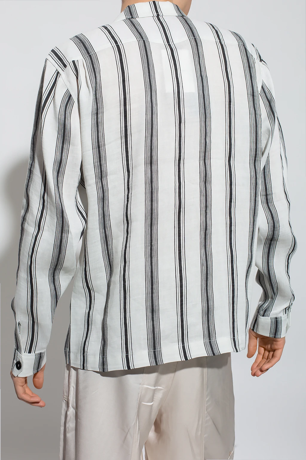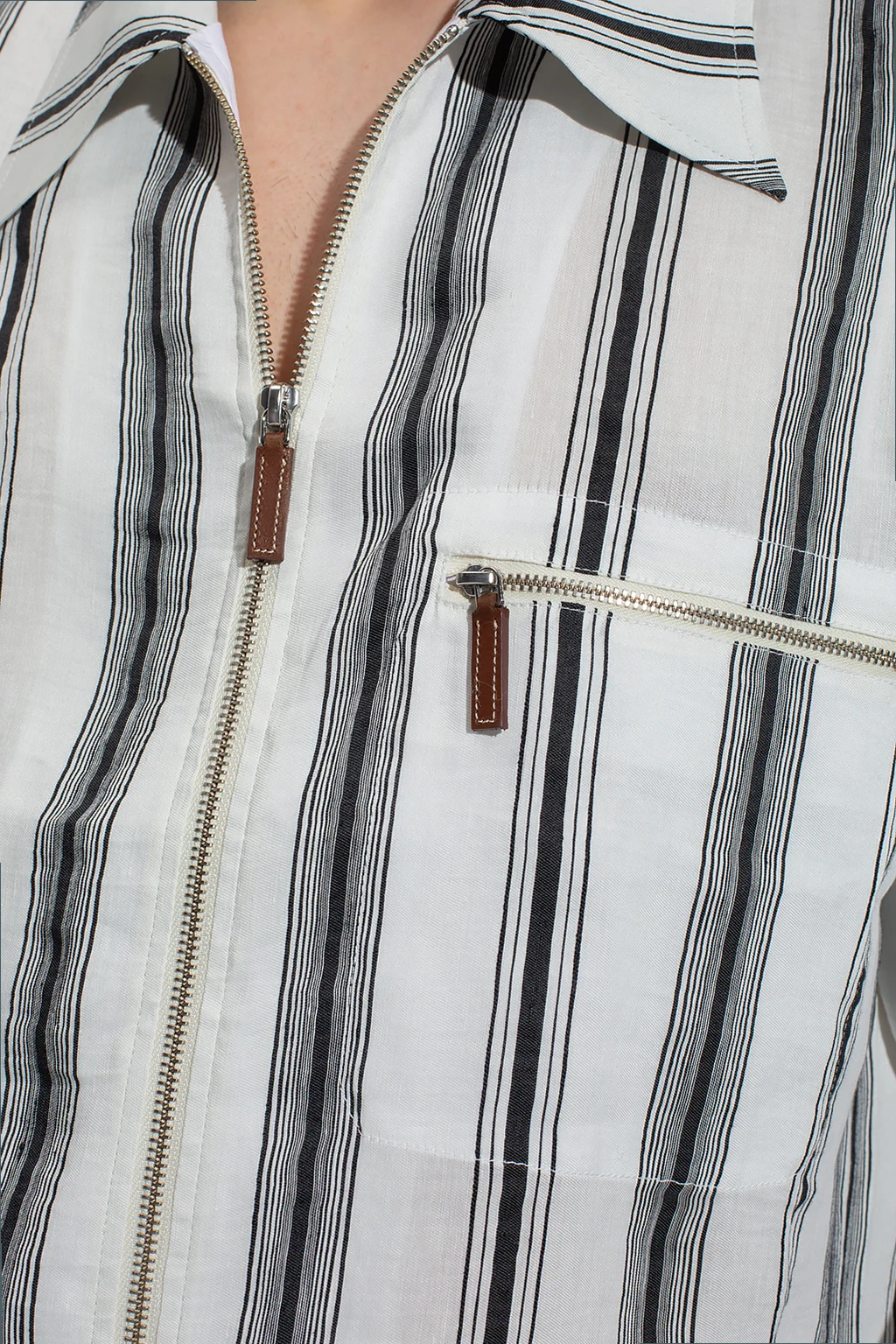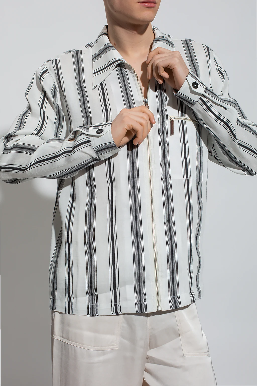 White and black ‘Depara’ shirt from Wales Bonner. Made of a linen and silk blend, this model features a zip fastening, stripe pattern, front zip pocket and button cuffs.