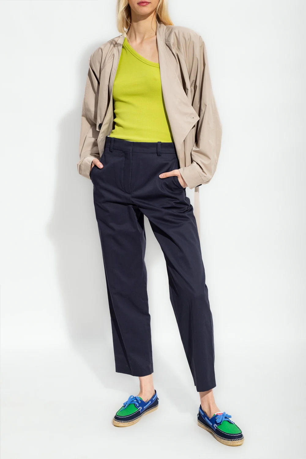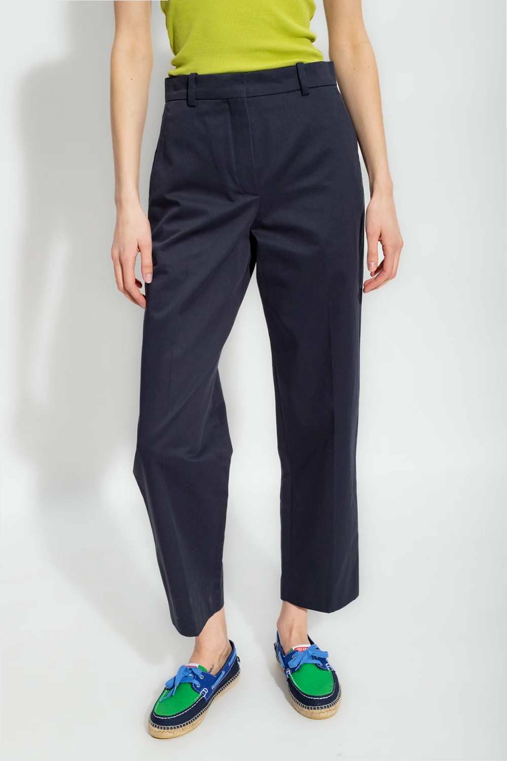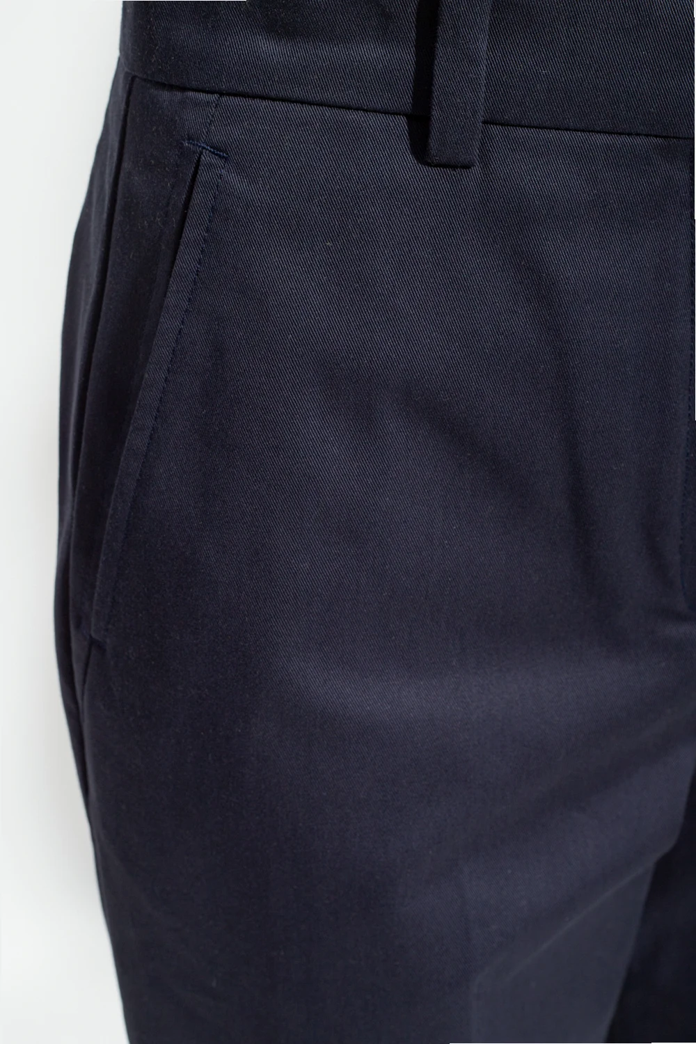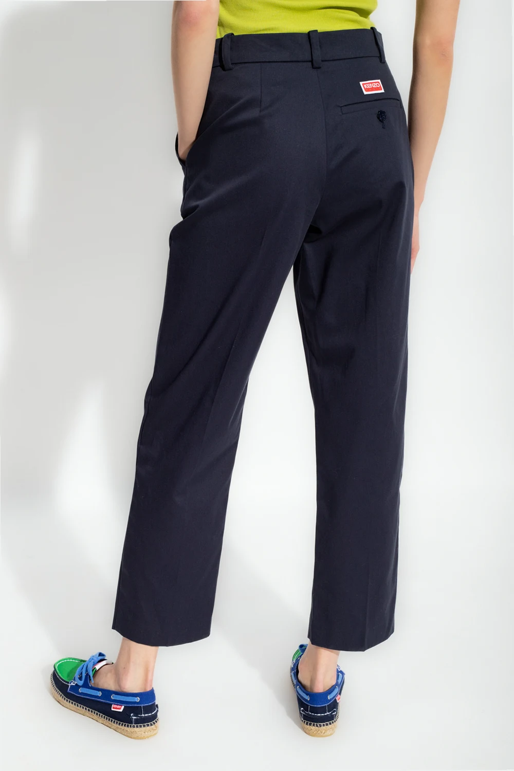 Navy pleat-front trousers from Kenzo. Made of cotton, this pair features a hook, button and zip fastening, logo patch, two front pockets and buttoned back pocket.