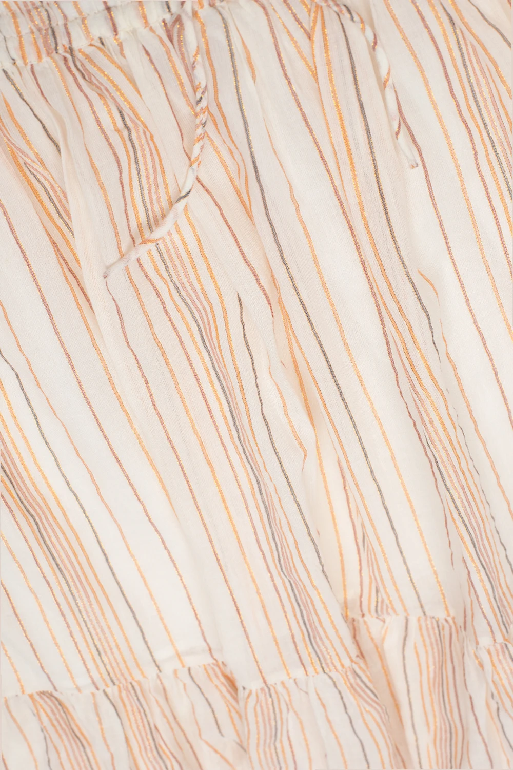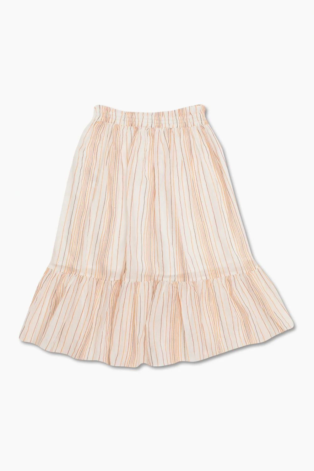 Cream, orange and brown maxi skirt from Bonpoint. Made of cotton with a stripe pattern, this style features a drawstring waistband and a flared hemline.