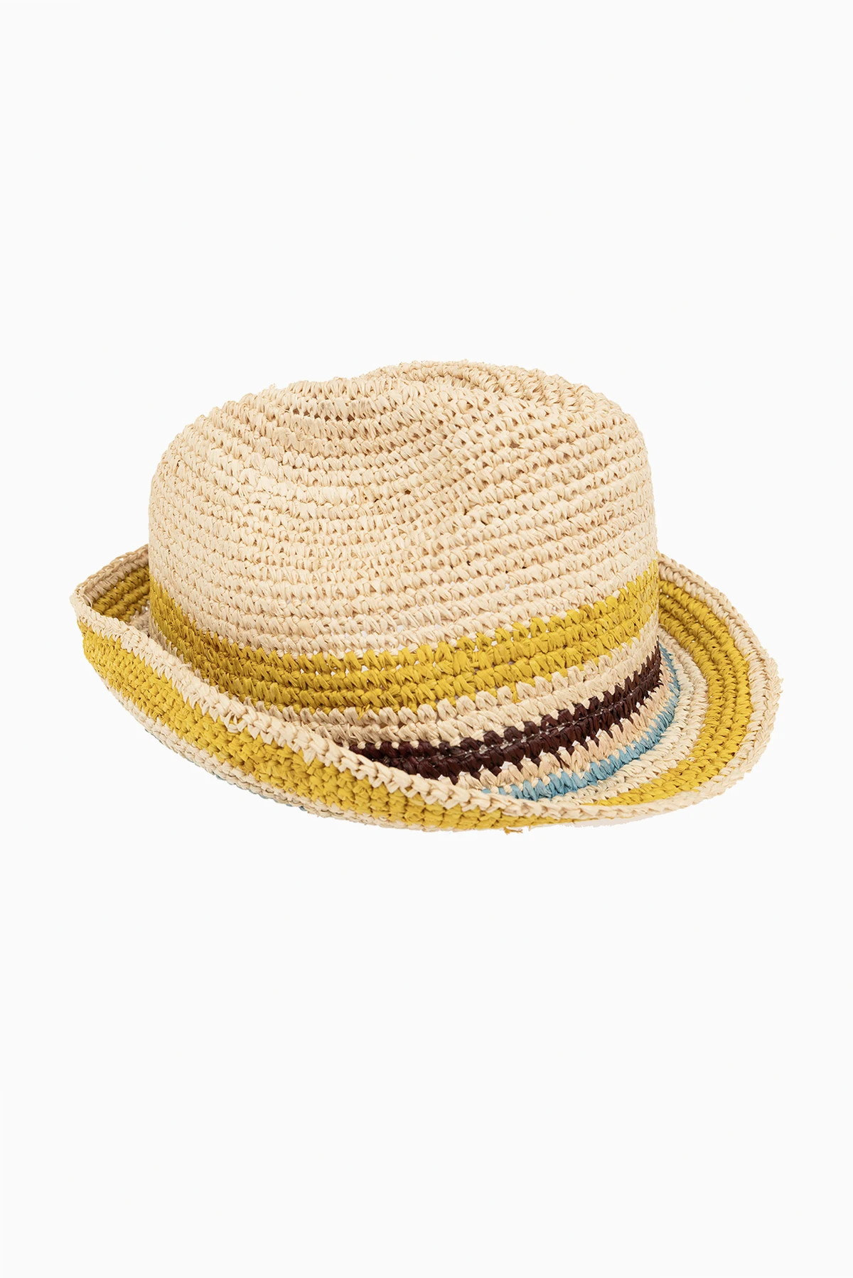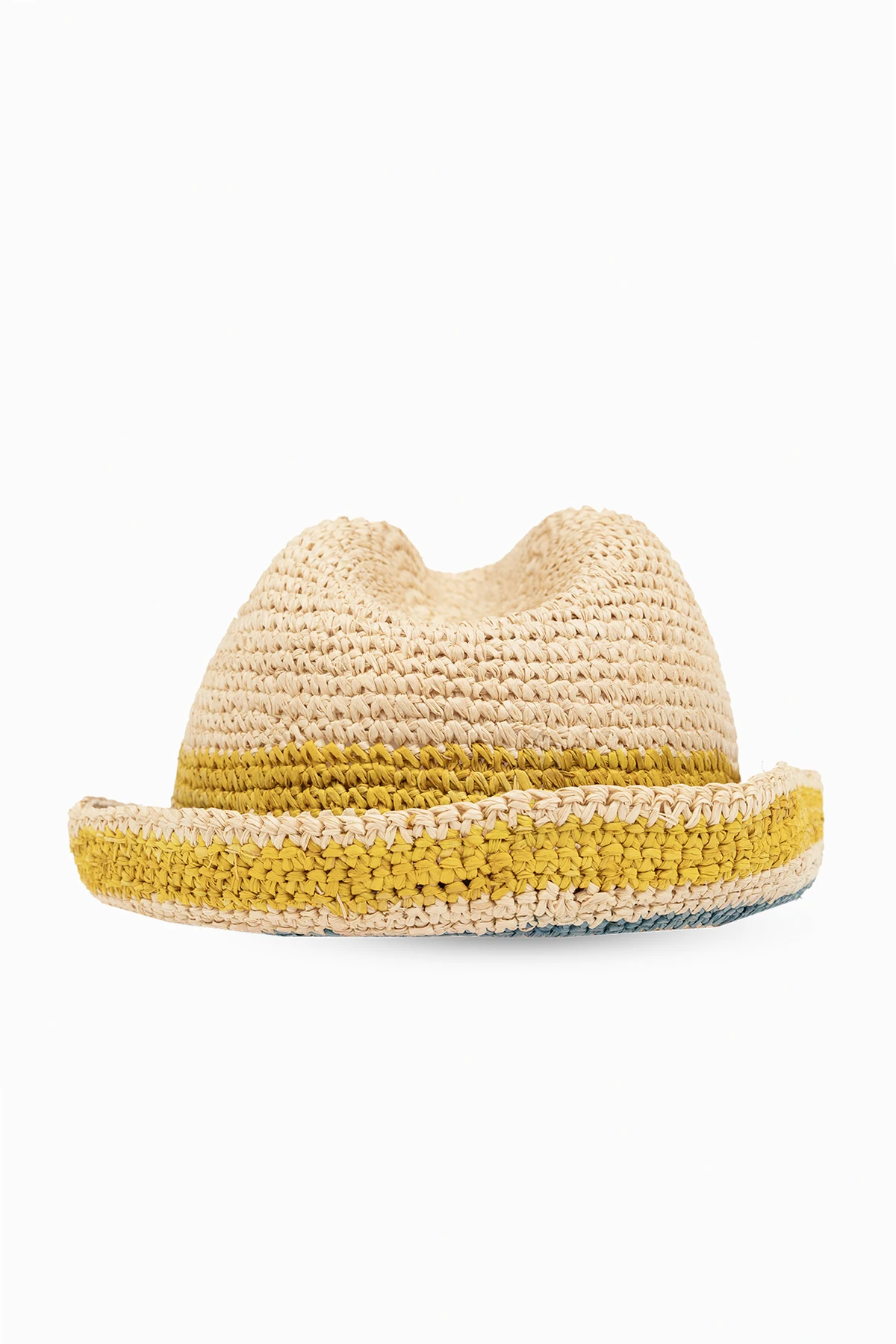 Beige ‘Aymon’ hat from Bonpoint. Made from woven raffia, this item showcases a colourful stripe motif.