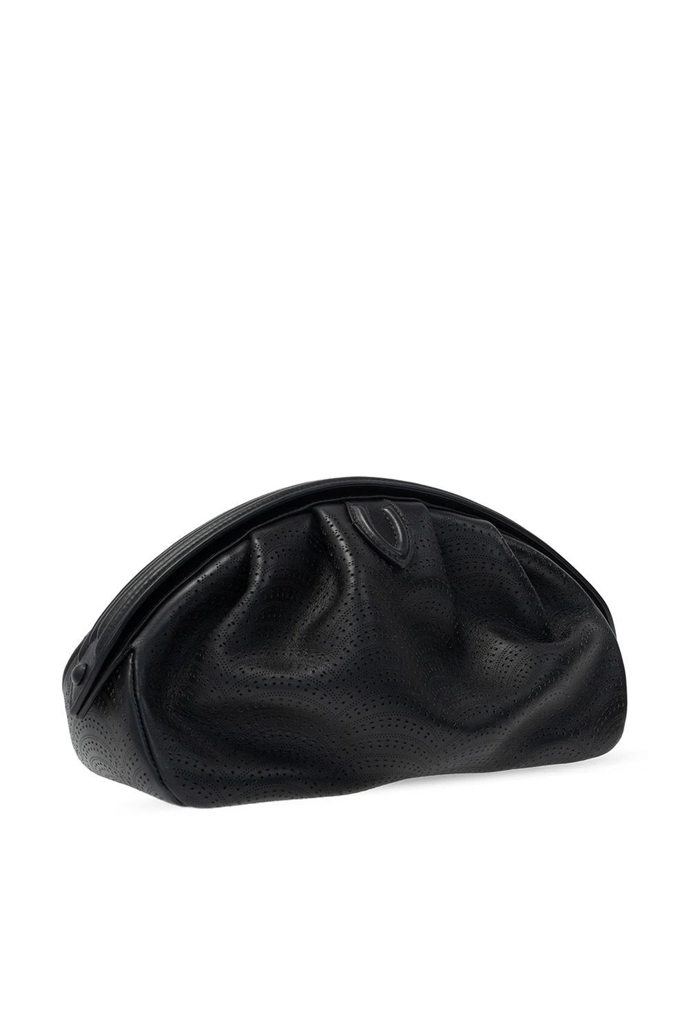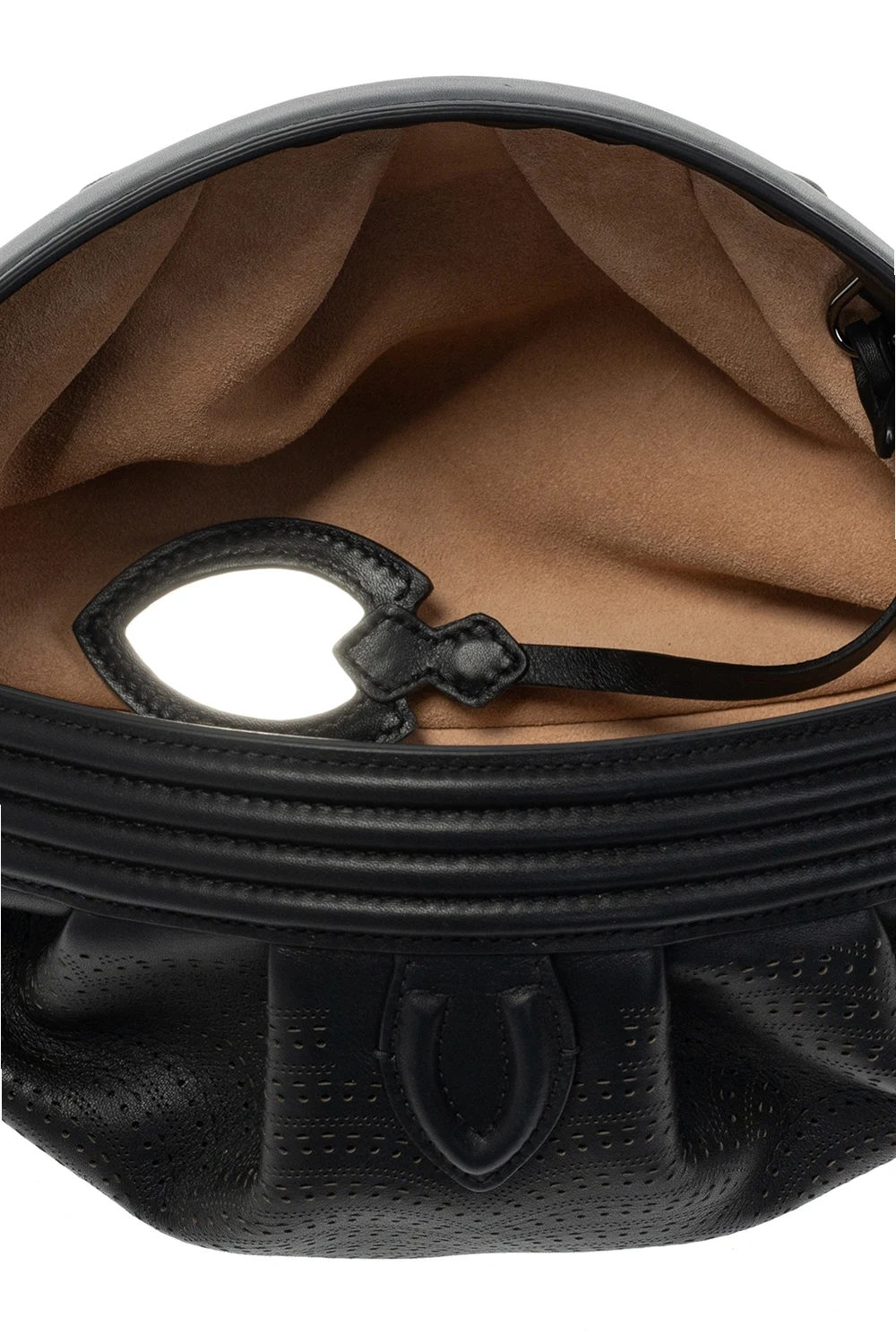 Black 'Samia 21' hand bag from Alaia. Crafted from leather, this design is enriched with decorative appliqués and perforations. The internal compartment is lined with beige fabric. It comes with a mirror pendant in leather.
