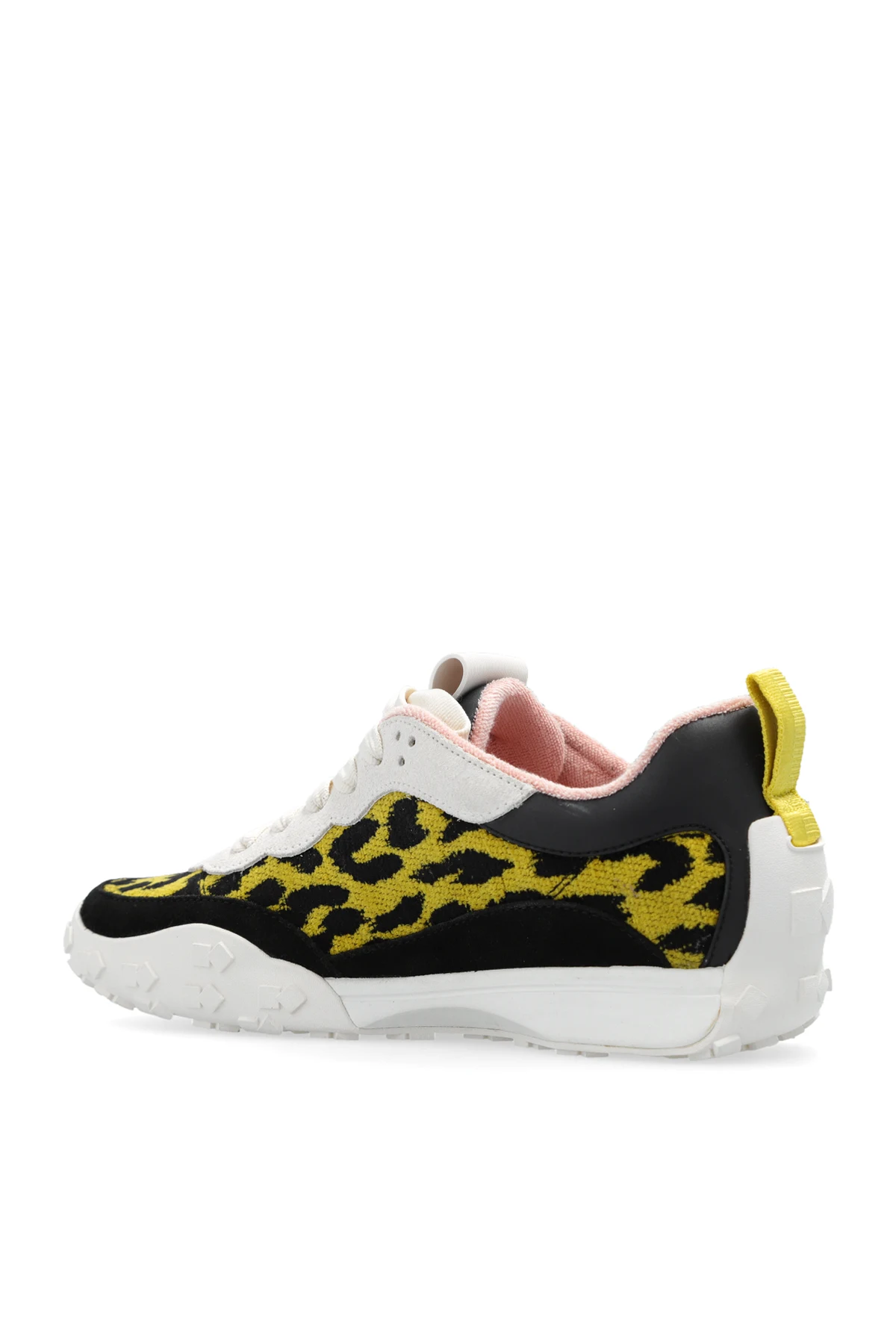 Black, yellow and white ‘K As In Kate’ sneakers from Kate Spade. Crafted from fabric with an animal motif as well as leather and suede, this lace-up pair features a logo on the tongue, monogram patch on the side, pink terry lining and white rubber sole.