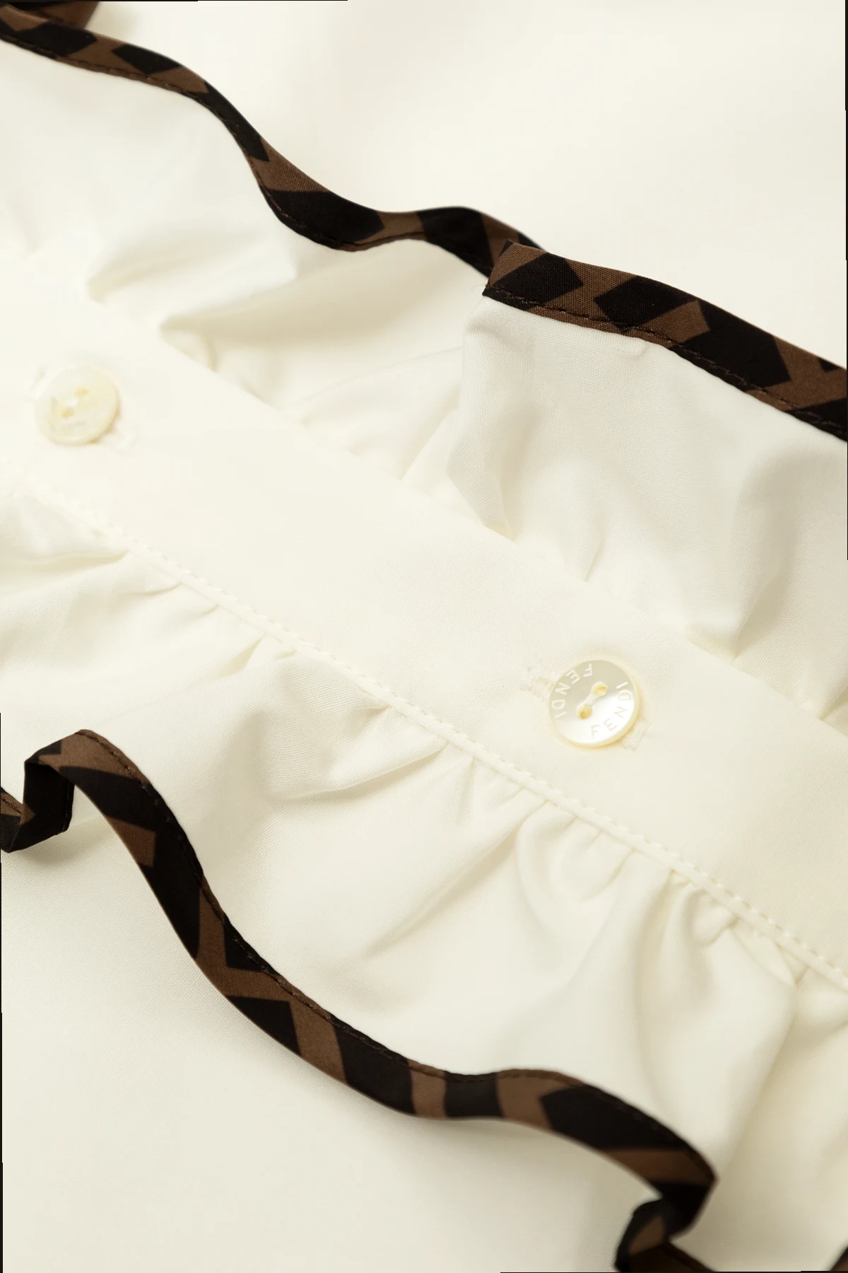 Die exklusive Baumwollbluse mit Rüschen vom renommierten Designer Fendi Kids ist die Quintessenz der Eleganz, kombiniert mit modernem Design. Hergestellt aus 100% hochwertiger Baumwolle, bietet sie nicht nur unvergleichlichen Tragekomfort, sondern präsentiert sich auch mit Klasse und Stil. Das dominierende Weiß des Materials kontrastiert perfekt mit den dunkelbraunen, geometrischen Mustern, die die Rüsche entlang der Knopfleiste sowie die dekorative Applikation am Ausschnitt zieren und der Bluse einen raffinierten Charakter verleihen.