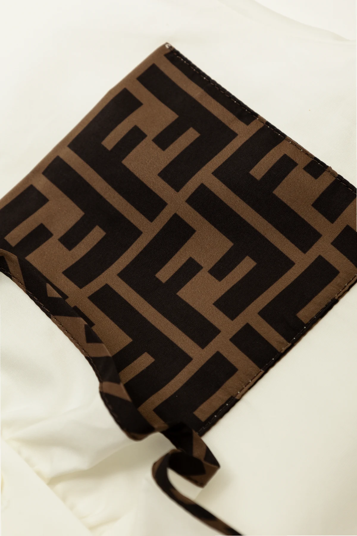 Details wie die mit einem dunkelbraunen Muster verzierte Rüsche oder die geometrischen Formen auf der Applikation am Ausschnitt unterstreichen die Einzigartigkeit des Modells und machen es zur idealen Wahl für Personen, die Wert auf Originalität und höchste Verarbeitungsqualität legen.