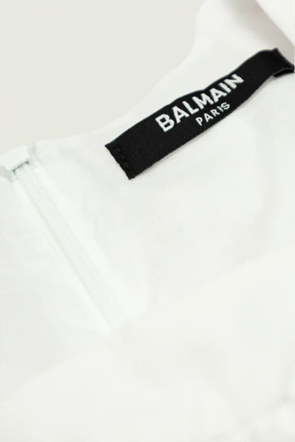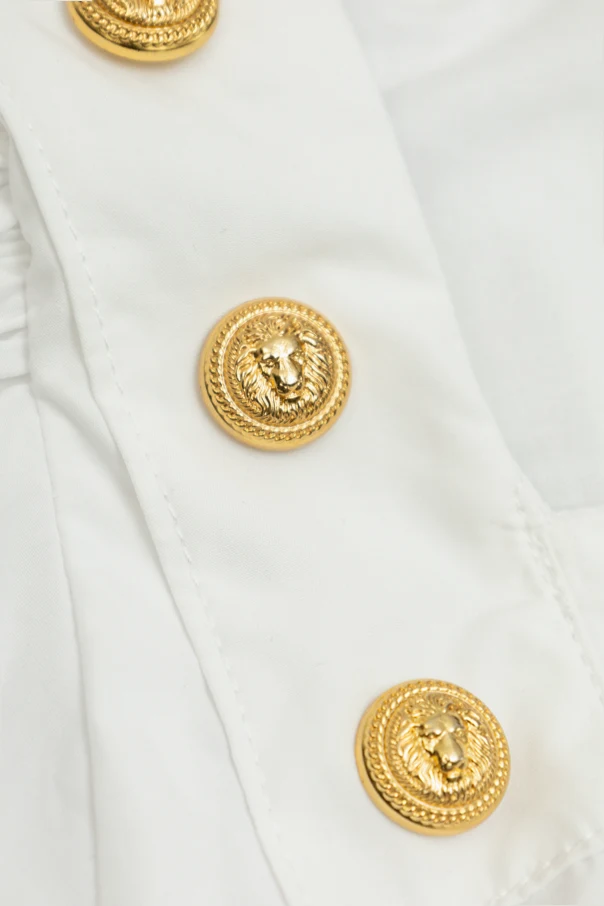 Ein einzigartiges Highlight sind die glänzenden, runden, goldfarbenen Knöpfe auf den Schultern mit erhabenem Löwenmotiv – ein Erkennungszeichen des Premium-Segments, das Modekennern nicht entgehen wird. Das klare „BALMAIN PARIS“-Logo am Innenausschnitt ist ein Garant für Authentizität und Prestige.
