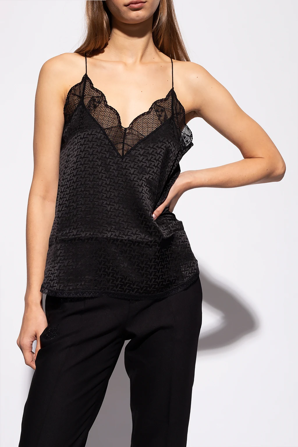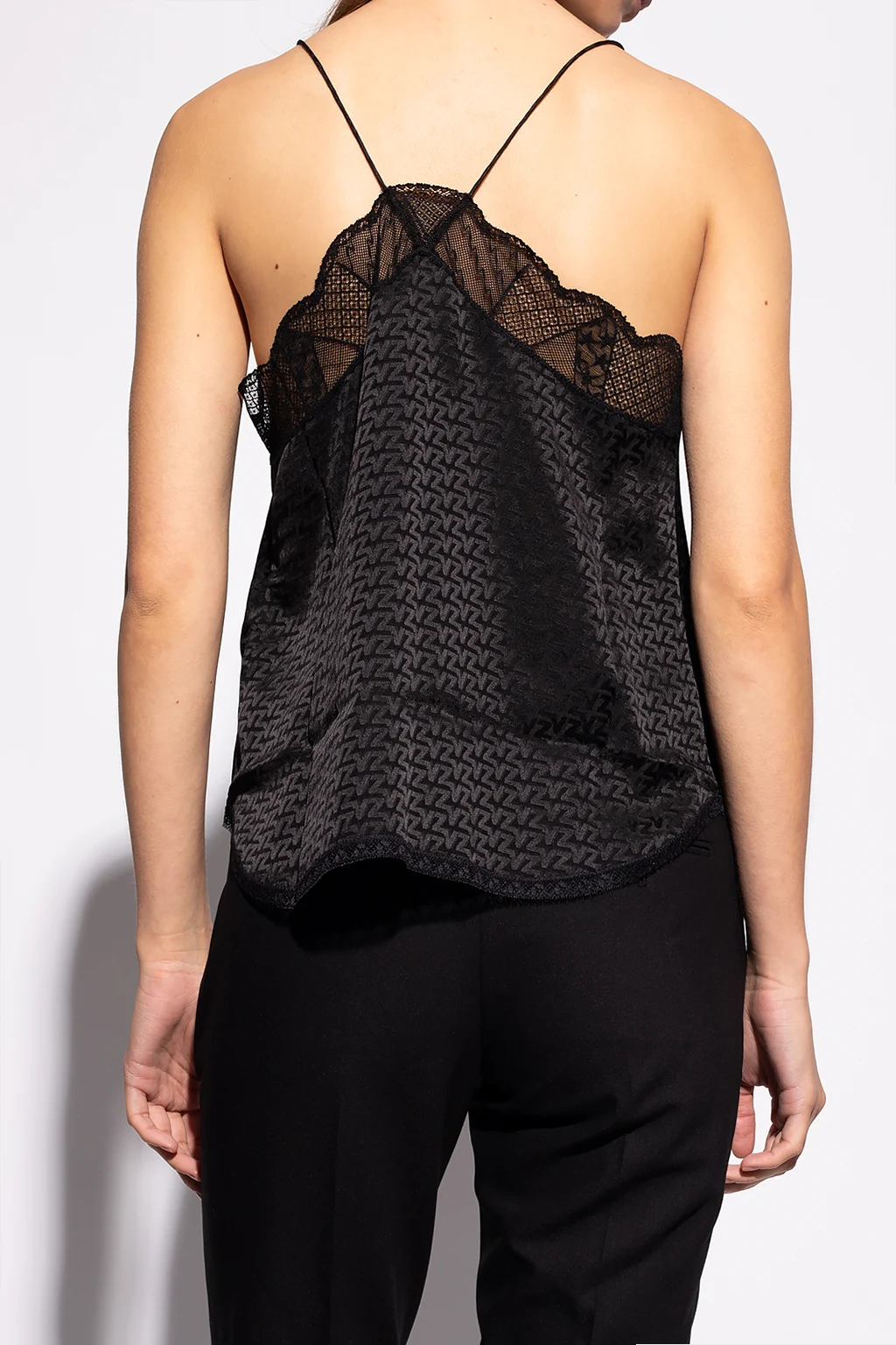 Black sleeveless top from Zadig & Voltaire. Crafted from silk, this garment features a monogram logo, lace trims and a flared silhouette.