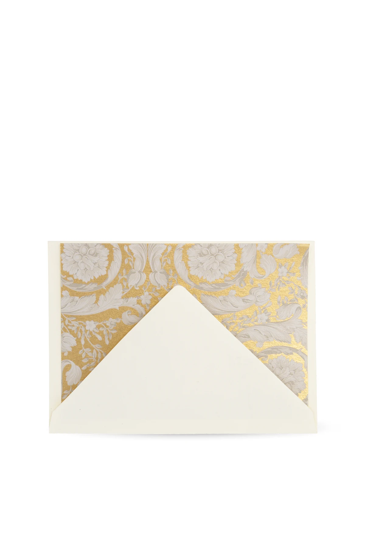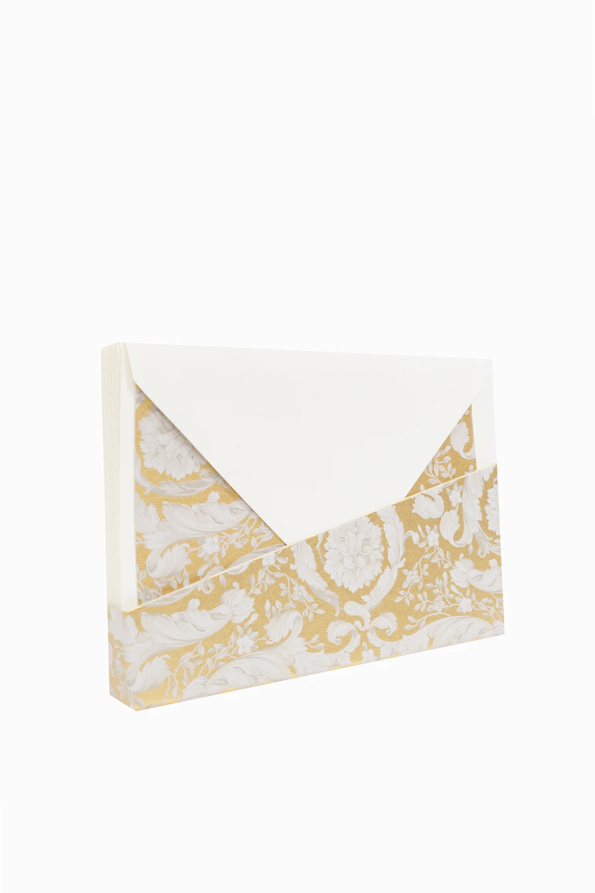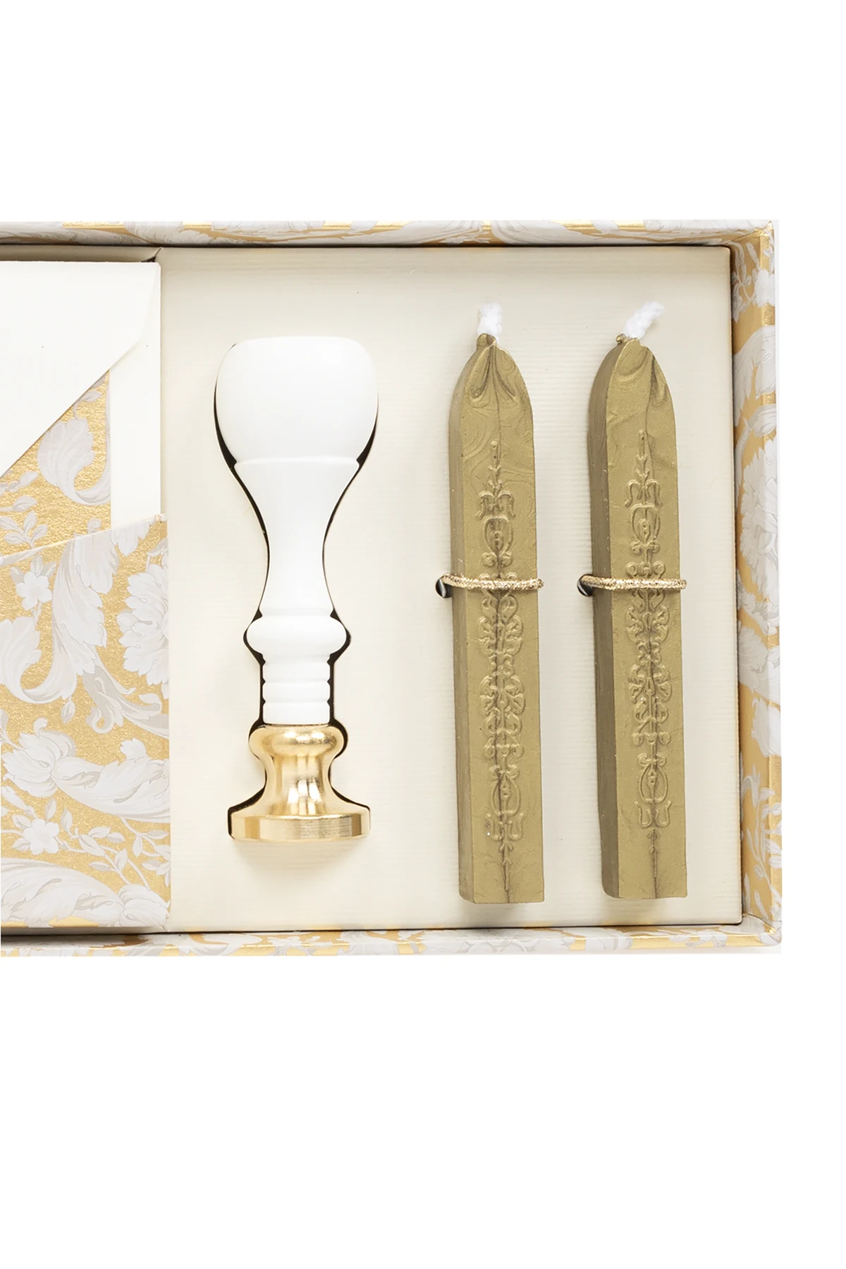 Hergestellt aus Papier höchster Qualität, sind die Umschläge ein Symbol für Luxus und Liebe zum Detail, mit einem deutlich markierten, goldenen Muster auf weißem Grund, das ihnen ein raffiniertes Aussehen verleiht. Der Siegelgriff, fertiggestellt mit weißem Lack und einem goldenen Kopf, ist nicht nur ein Werkzeug, um der Korrespondenz einen individuellen Charakter zu verleihen, sondern auch ein außergewöhnliches Dekorationselement.