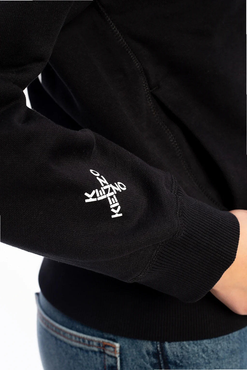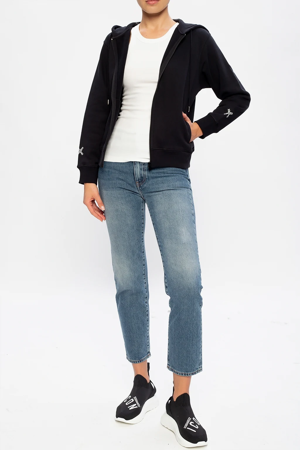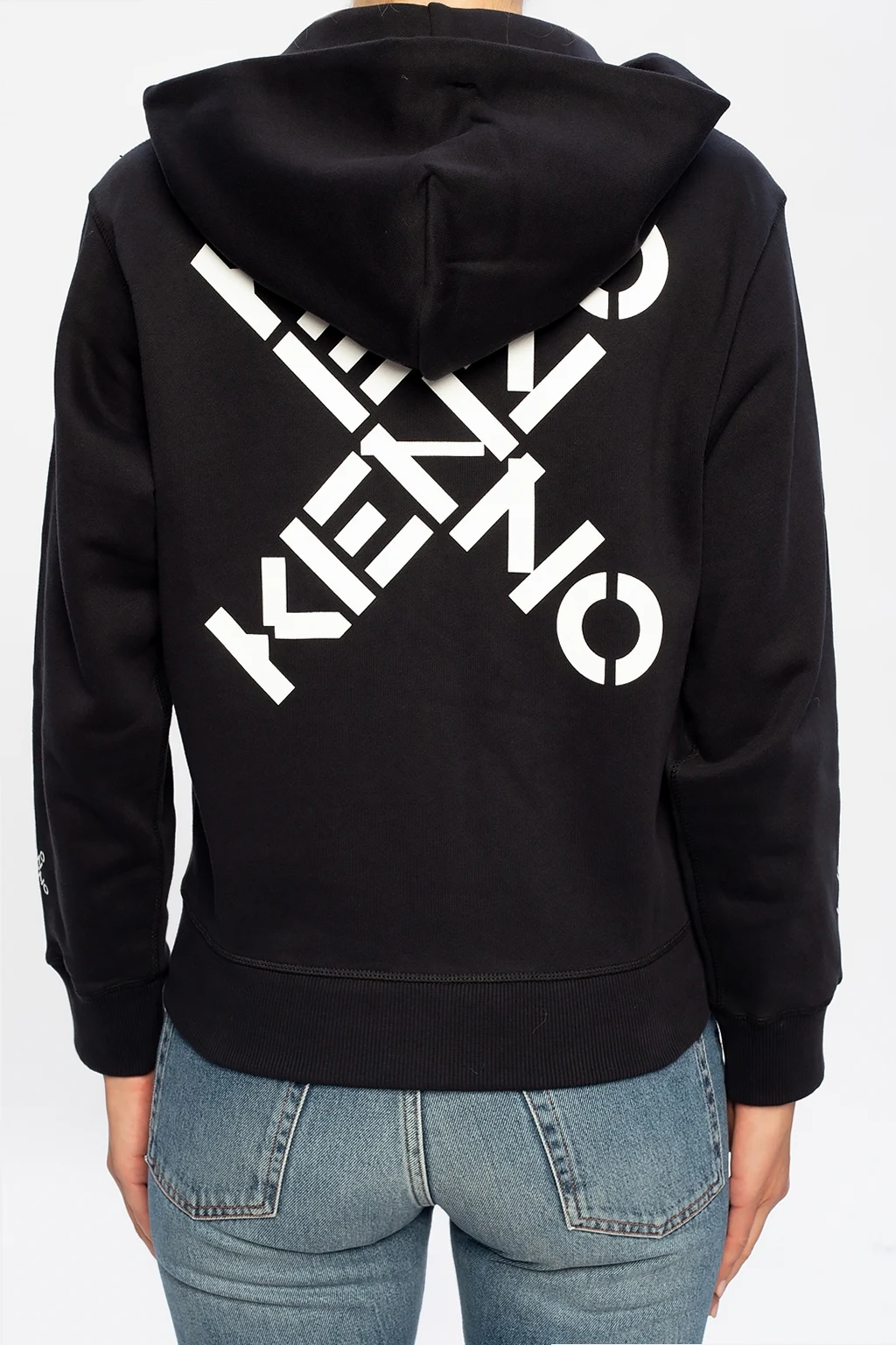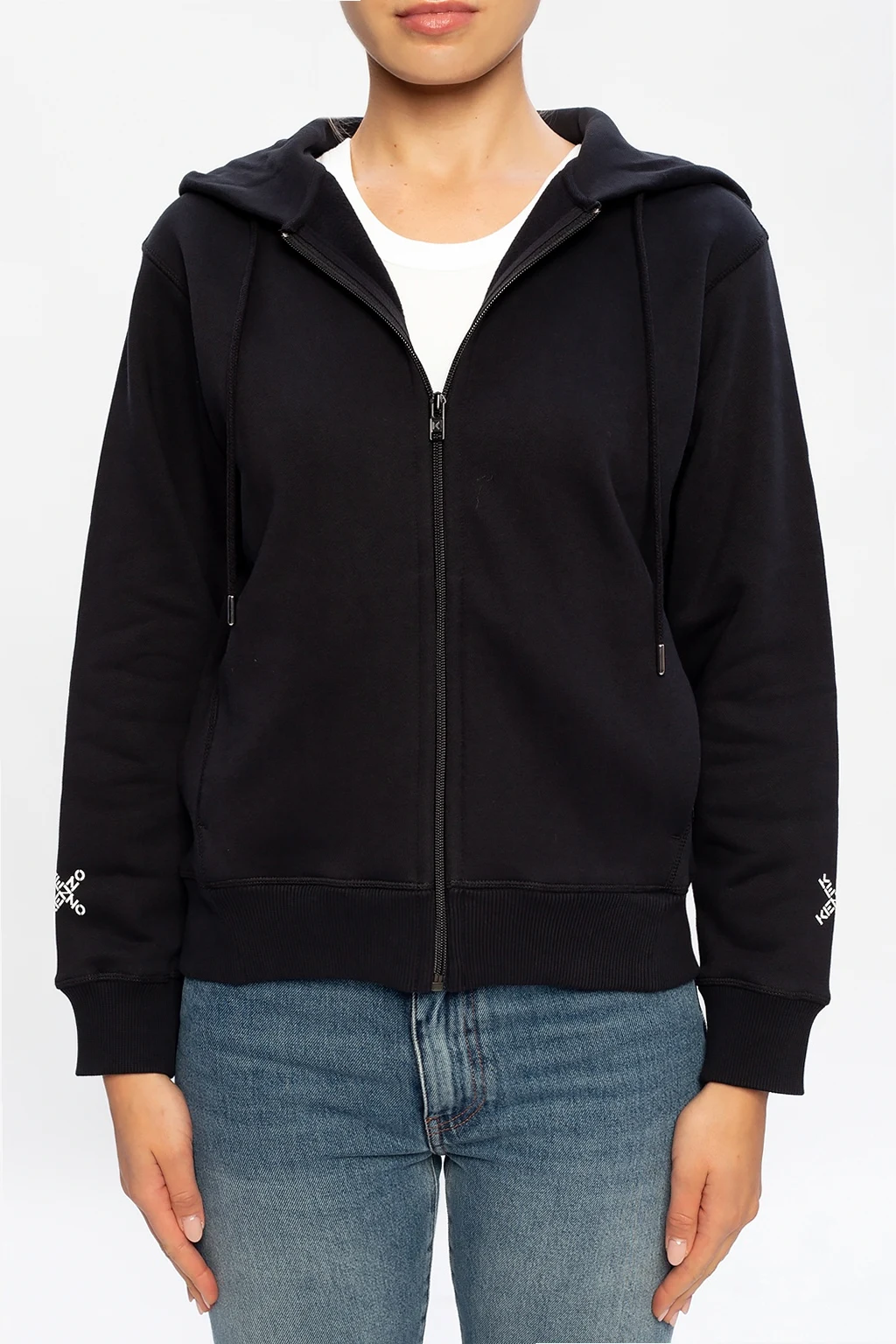 Black sweatshirt with a drawstring hood from Kenzo. Cut from cotton jersey, this style showcases white logo print on the back and sleeves and is complete with zip fastening, two pockets and and rib-knit trims.