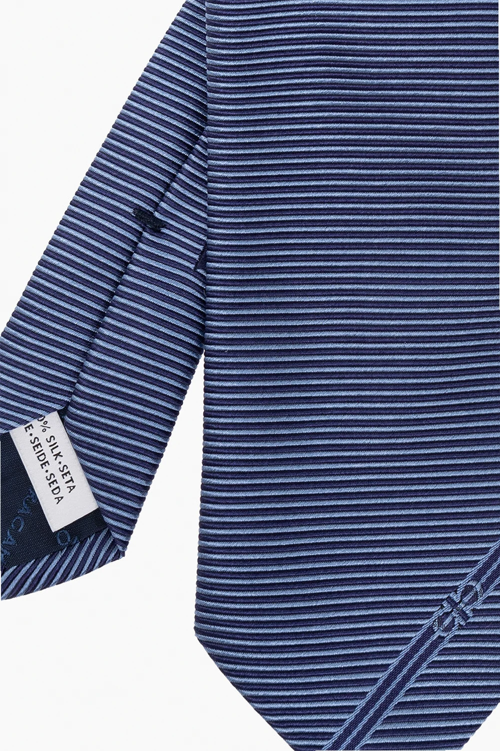 Navy and blue tie with pinstripes and a logo from FERRAGAMO. Made of silk.