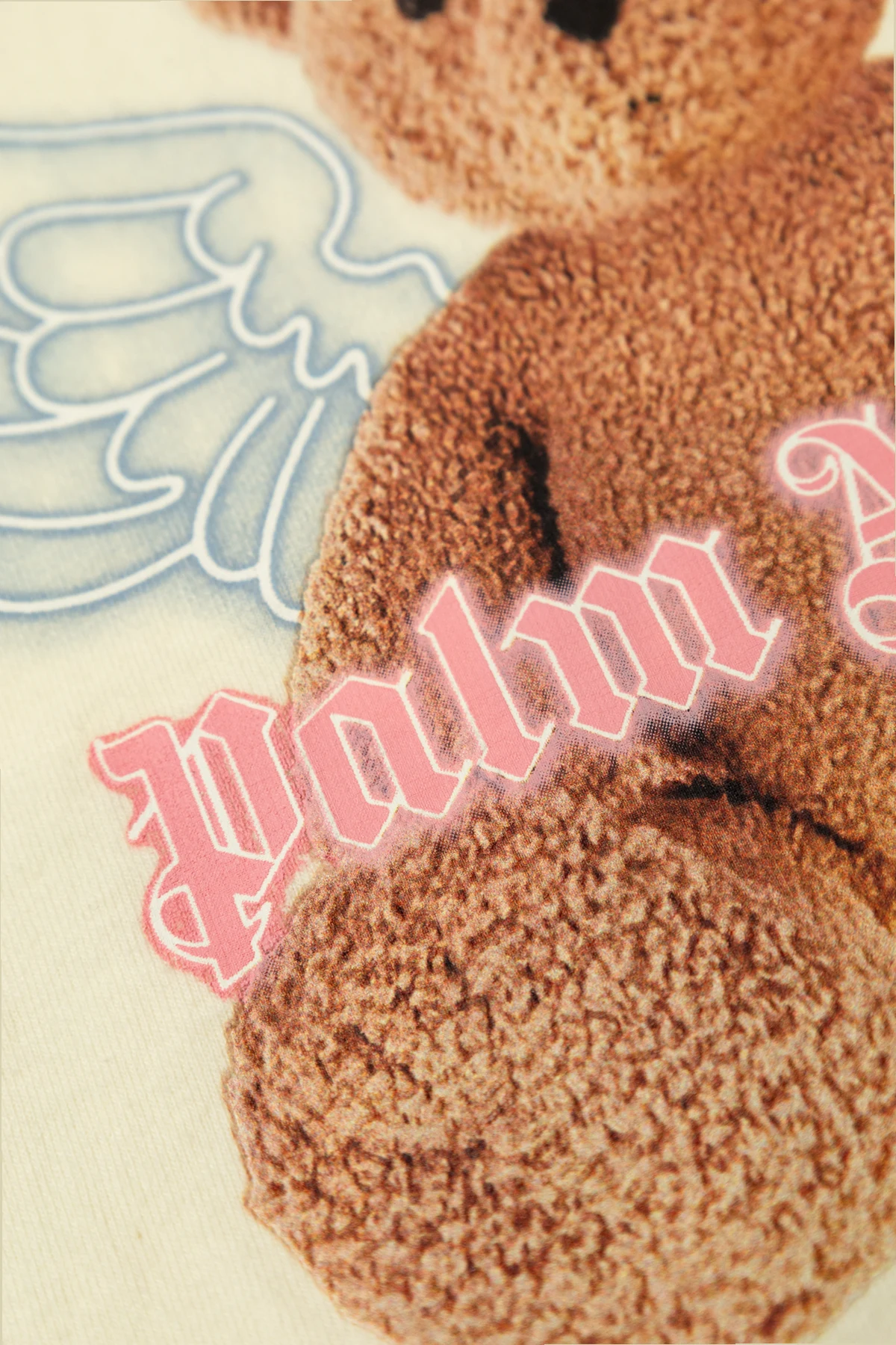 Es zeichnet sich durch einen klassischen Schnitt mit kurzen Ärmeln und einem Rundhalsausschnitt aus. Auf der Vorderseite des T-Shirts befindet sich ein großer Aufdruck, der einen Bären mit gestickten Engelsflügeln darstellt. Durch die Mitte des Bären verläuft der Schriftzug "Palm Angels", der im gotischen Stil in pinker Farbe ausgeführt ist und dem T-Shirt einen einzigartigen und exklusiven Charakter verleiht.