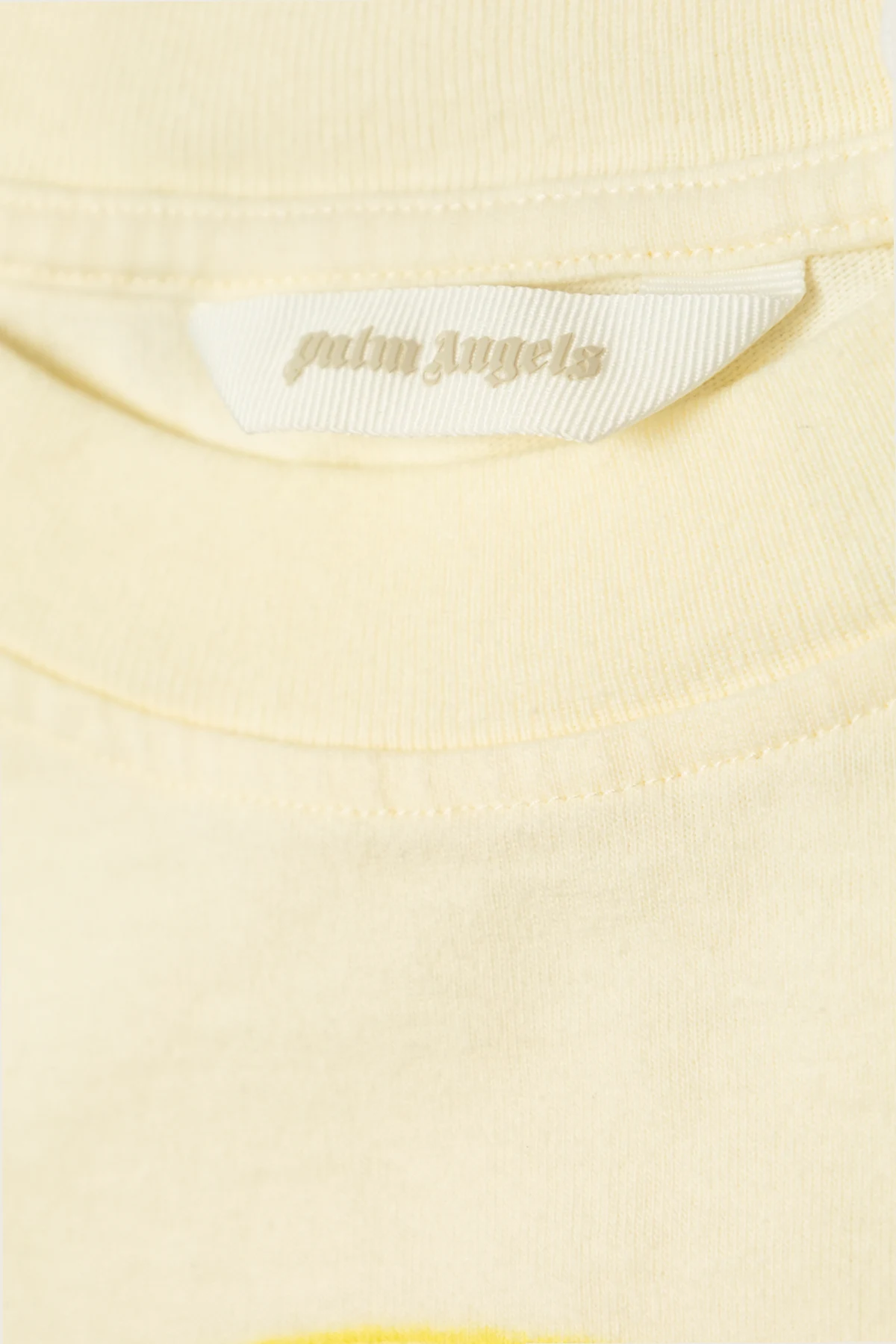 Das T-Shirt ist in dominierendem Cremefarbton gehalten, und die gestickten Flügel sowie die aufgedruckten Schriftzüge machen das Design besonders. An der Innenseite, am Ausschnitt, befindet sich ein Etikett mit dem Markennamen "Palm Angels".