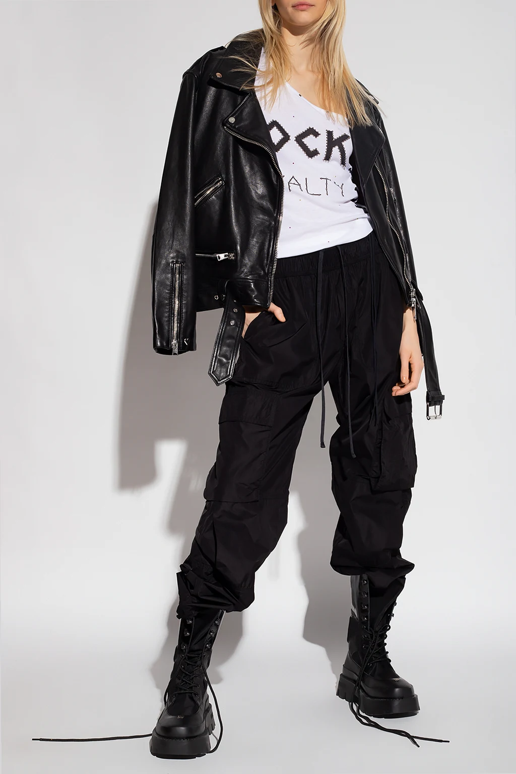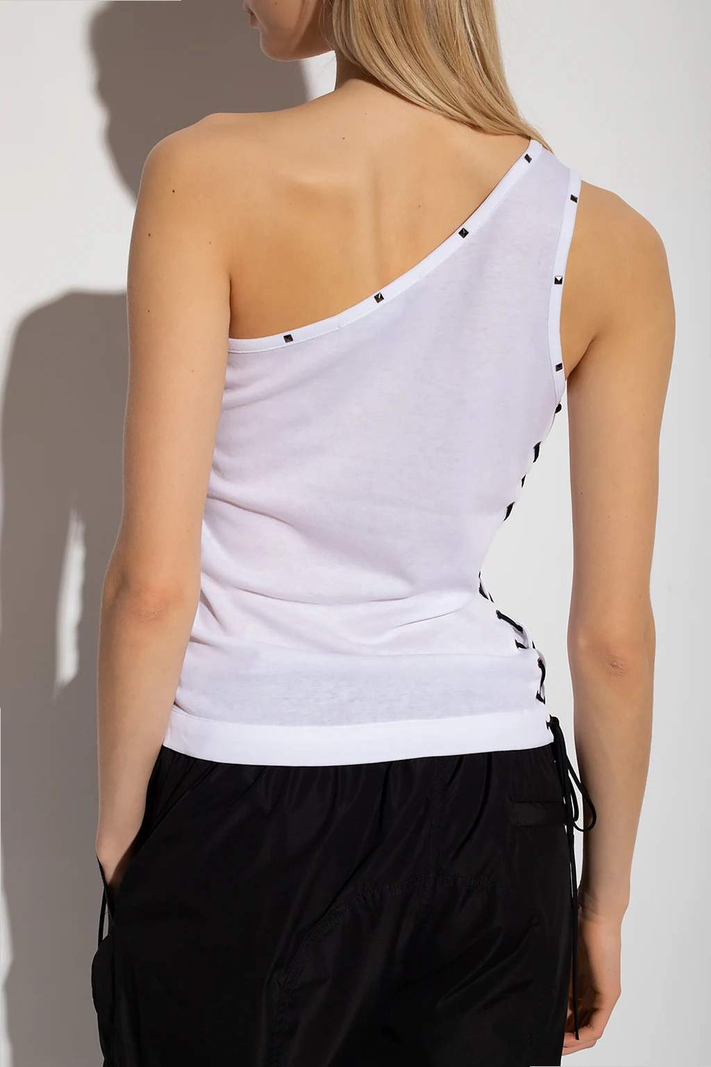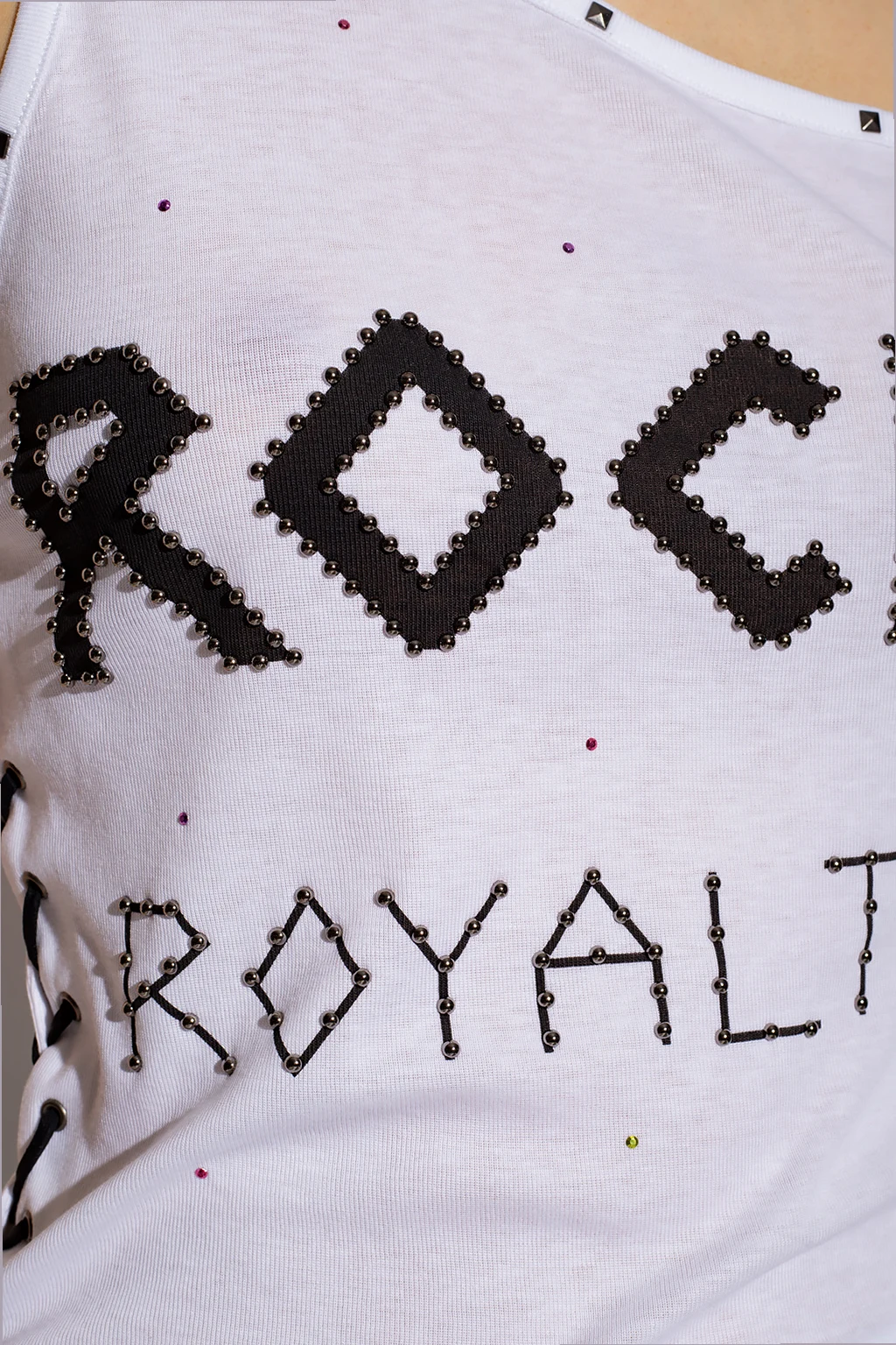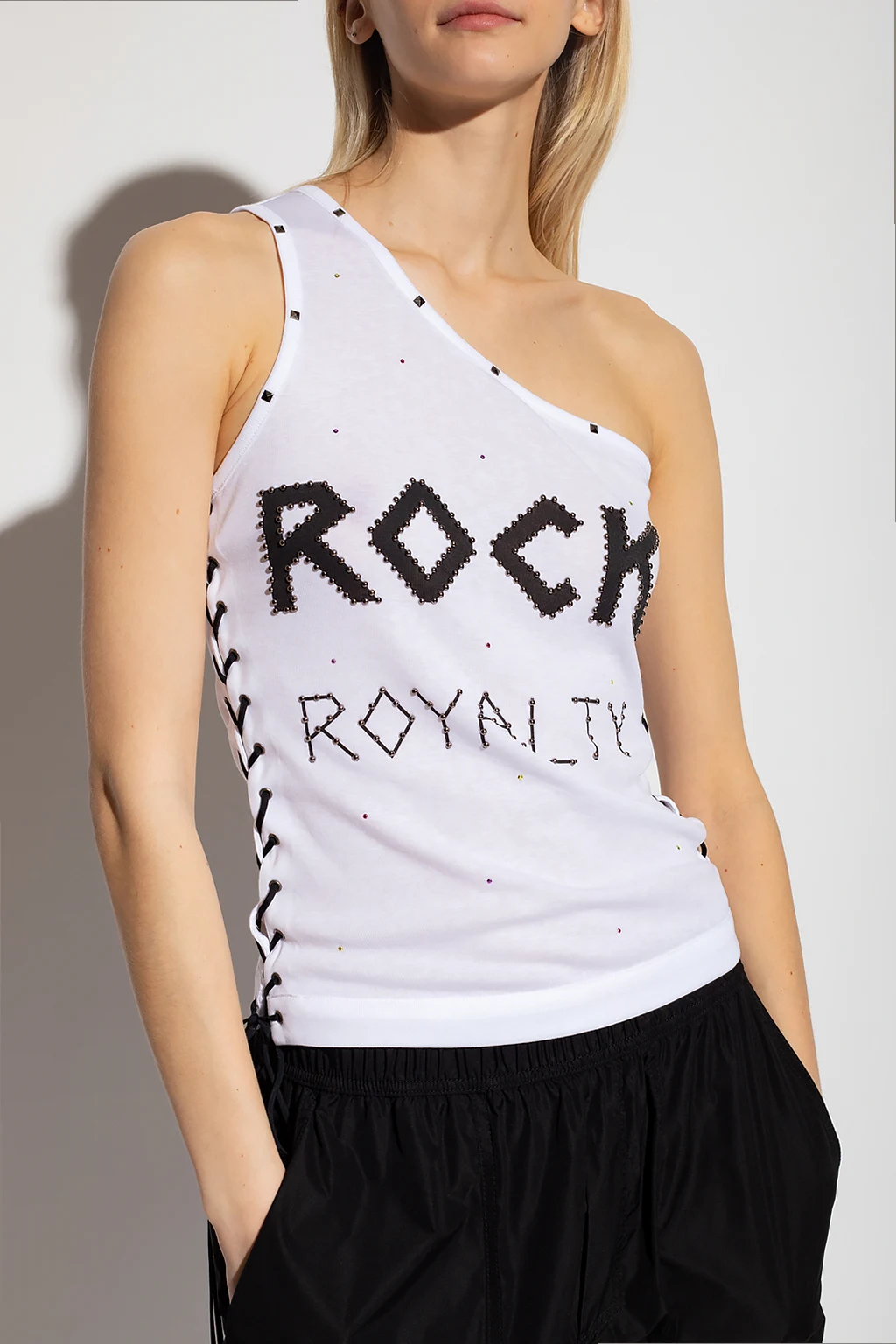 White one-shoulder top from Stella McCartney. Embellished with a black ‘Rock Royalty’ print, this style features stud detailing at the collar, tie closures on the sides and an elasticated bottom hem.