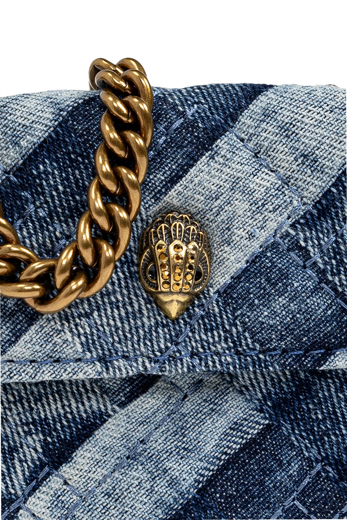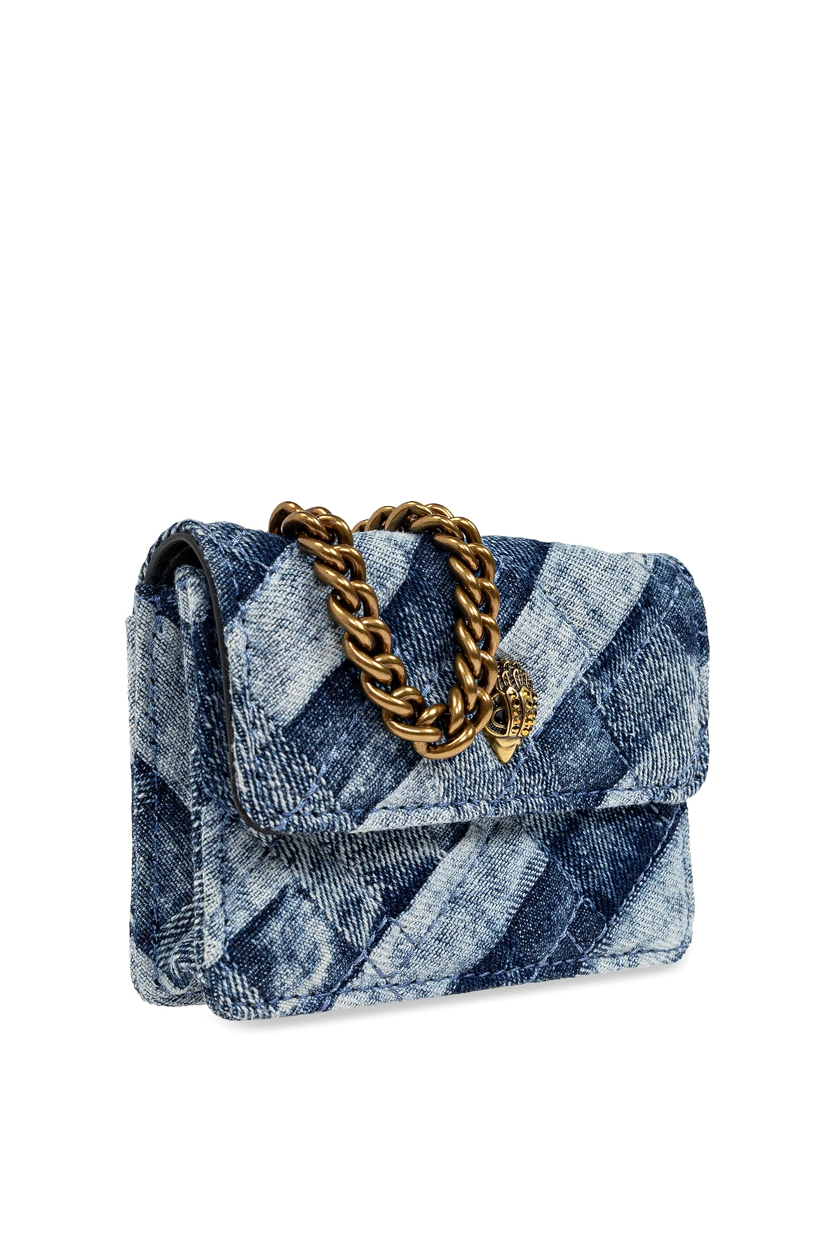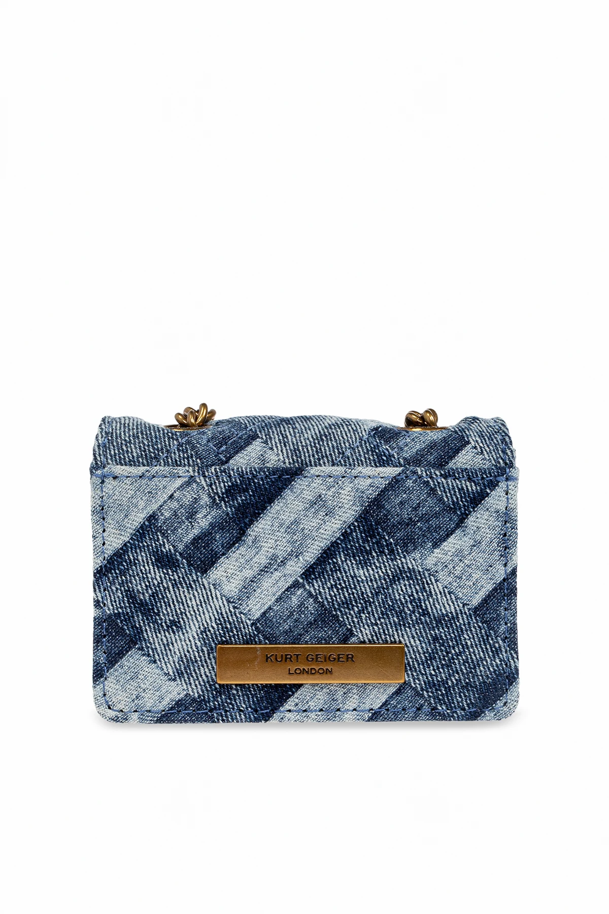 Gefertigt aus einem Material mit Jeansoptik, besticht die Brieftasche durch ein diagonales, geometrisches Muster in Blautönen. Das Vorderteil ziert ein dekoratives Element in Form eines Tierkopfes sowie eine dicke, goldene Kette, die als Schulterriemen dient. Auf der Rückseite befindet sich ein dezentes "Kurt Geiger London" Logo, das den exklusiven Charakter des Produkts unterstreicht.