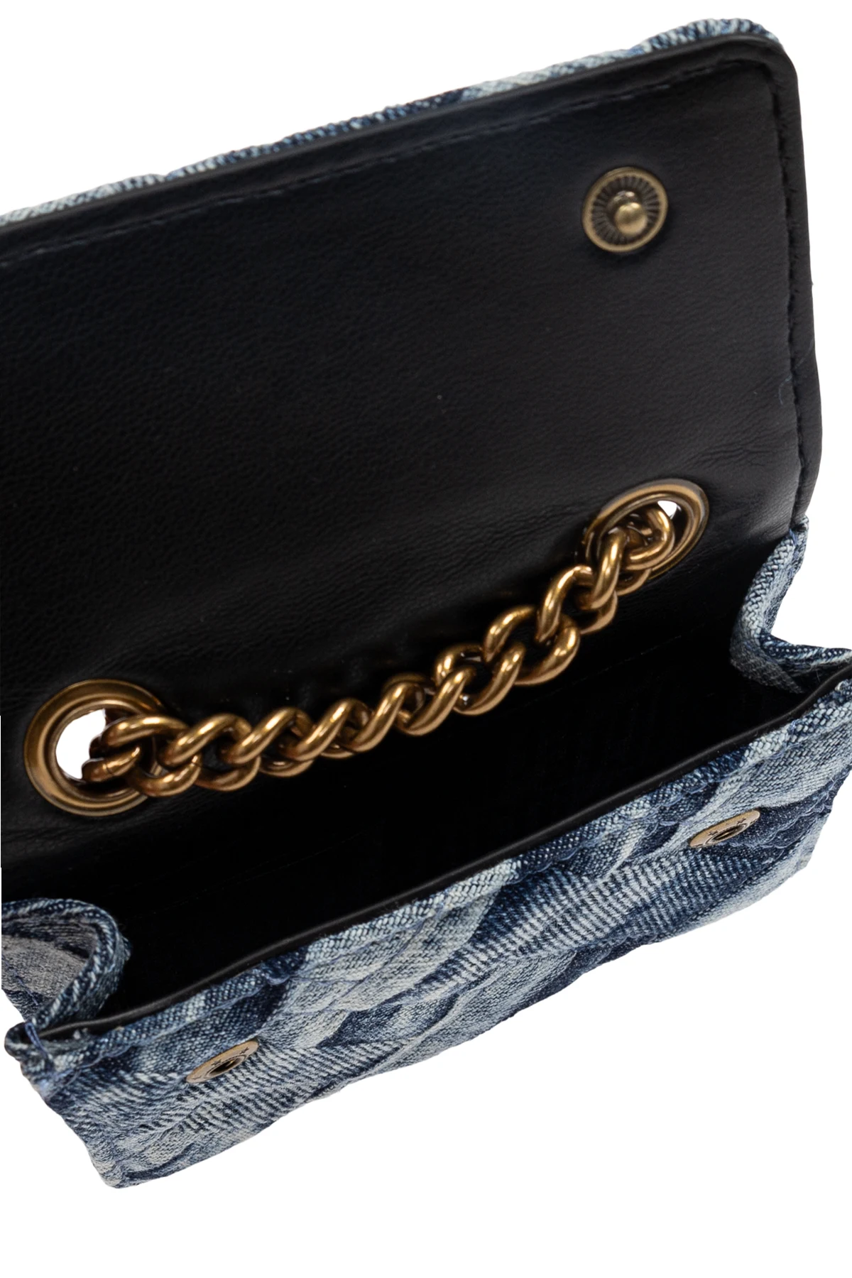 Das Innere der Brieftasche, in Schwarz gehalten, verfügt über magnetische Verschlüsse und Kettenelemente, die außergewöhnliche Funktionalität bieten. Die rechteckige Form mit einer Klappe, die mit einem Magnetverschluss geschlossen wird, verleiht ihr Eleganz und Benutzerfreundlichkeit.