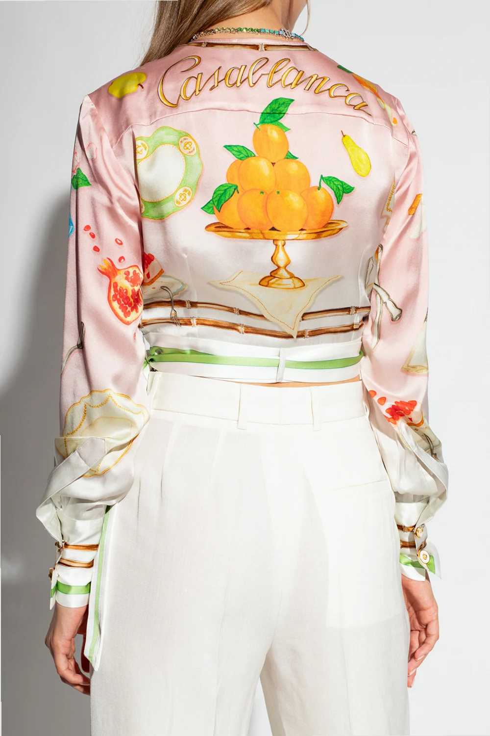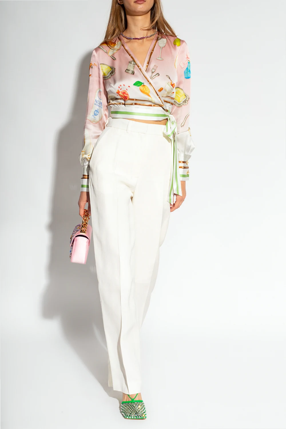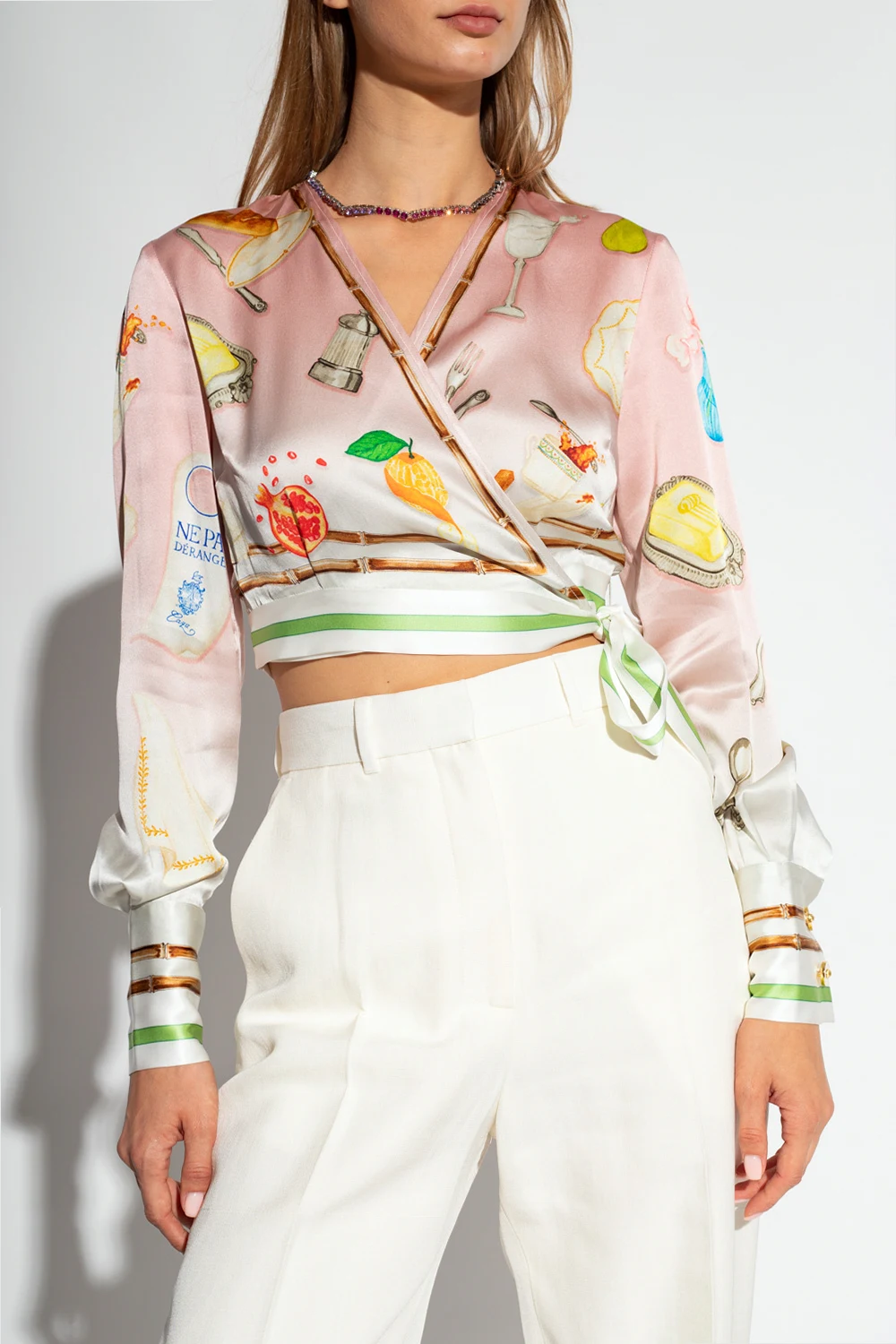 Pink and white top from Casablanca. Made of silk satin with a cropped fit, this item showcases a colourful ‘Ne Pas Deranger’ print, a plunging wrap neckline, white and green tie detailing at the waist and long sleeves with button cuffs.