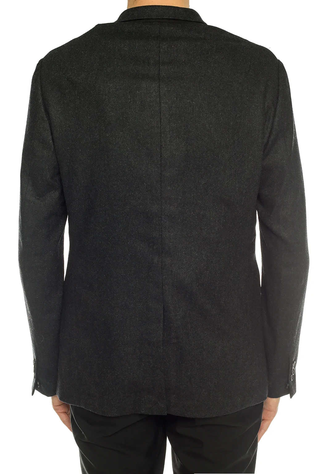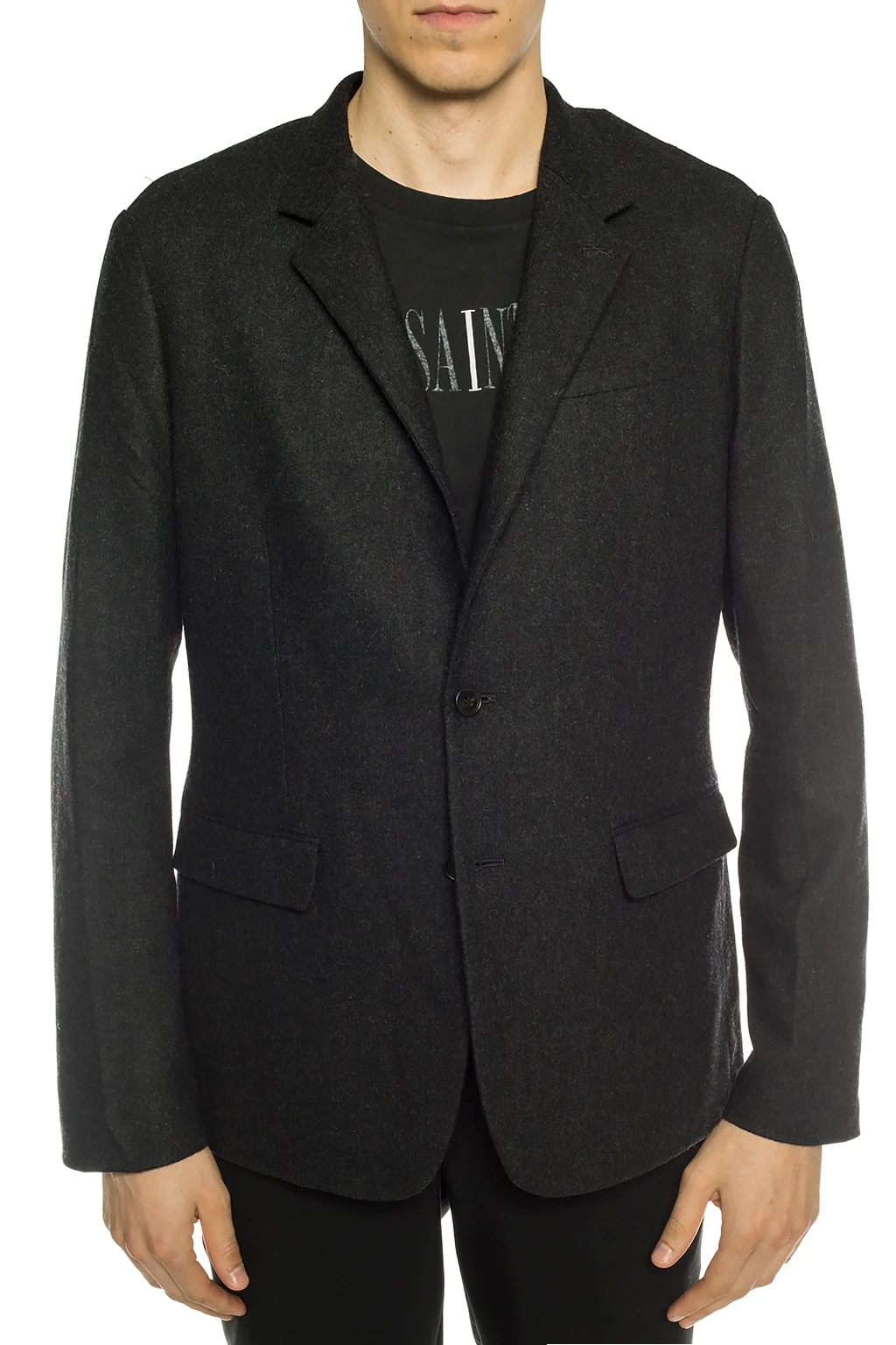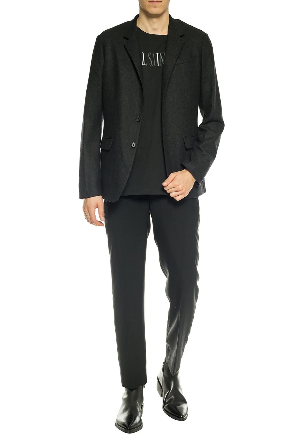 Black ‘Arbatus’ blazer with notch lapels from AllSaints. Made of wool. Button fastening. Two slip pockets with flaps on the front. Vents at the back.