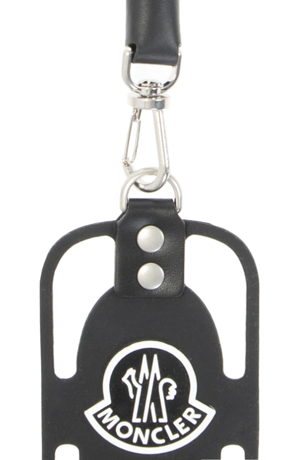 Black phone case from Moncler. Decorated with a raised logo in white, this item comes with a decorative black and white lanyard with a silver-tone snap hook.