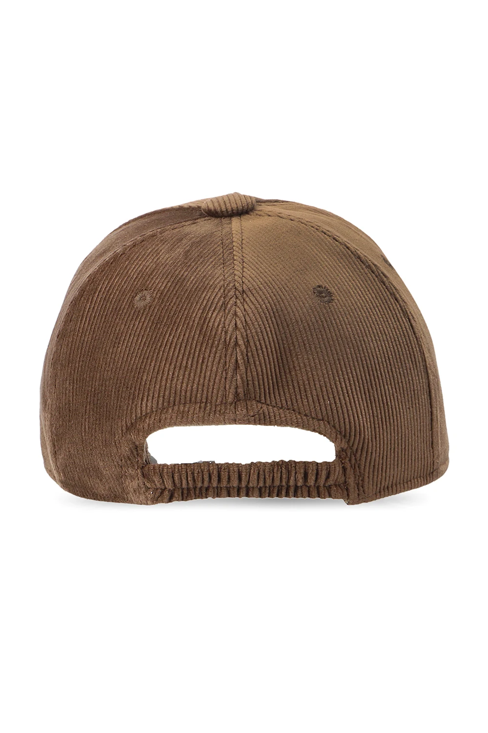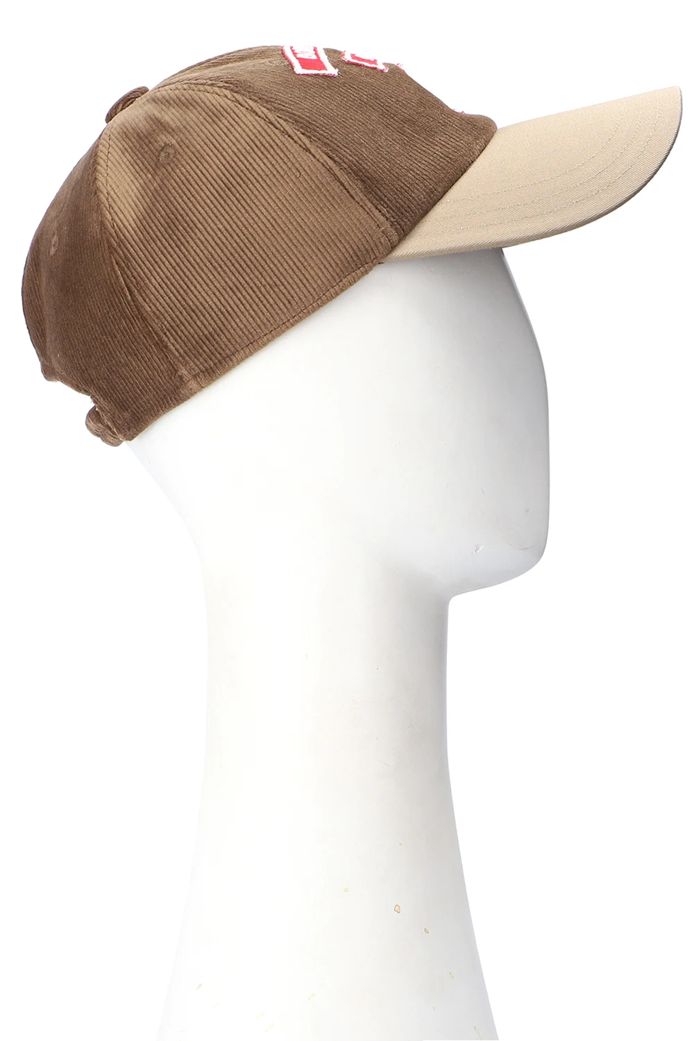 Brown and beige corduroy baseball cap from Bonpoint. Emblazoned with red and white patches, this item features an elastic band on the back.