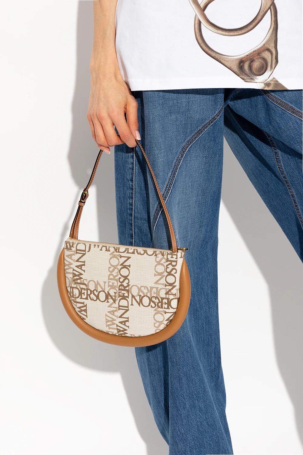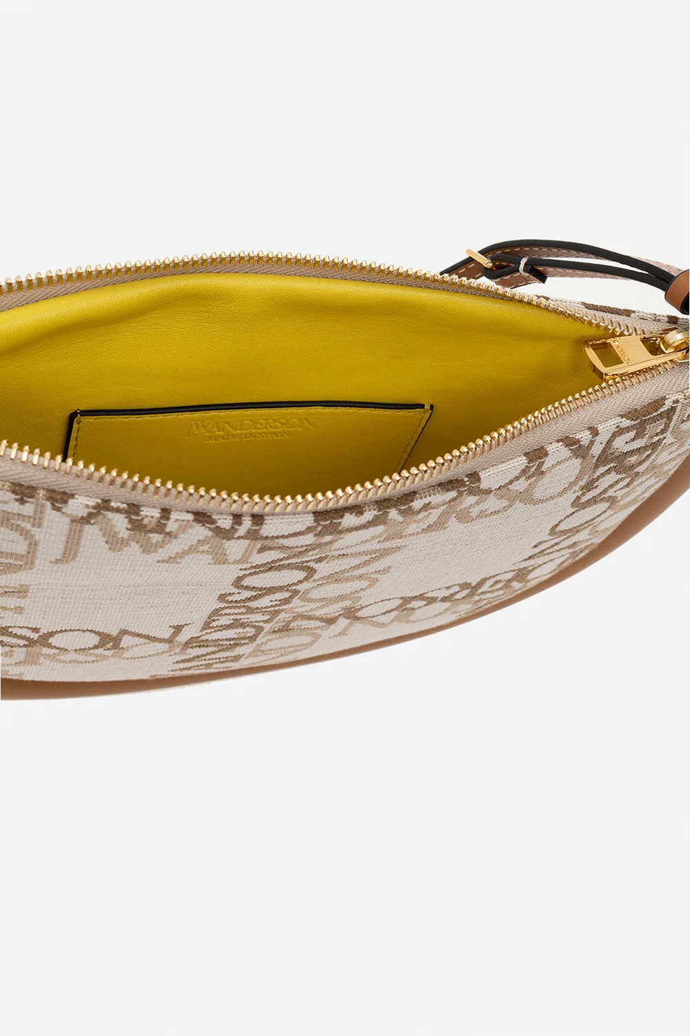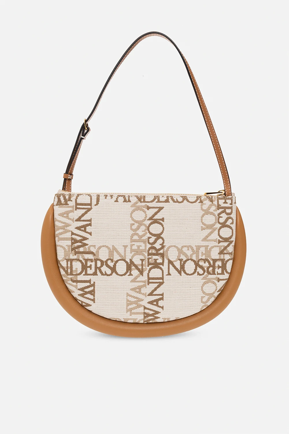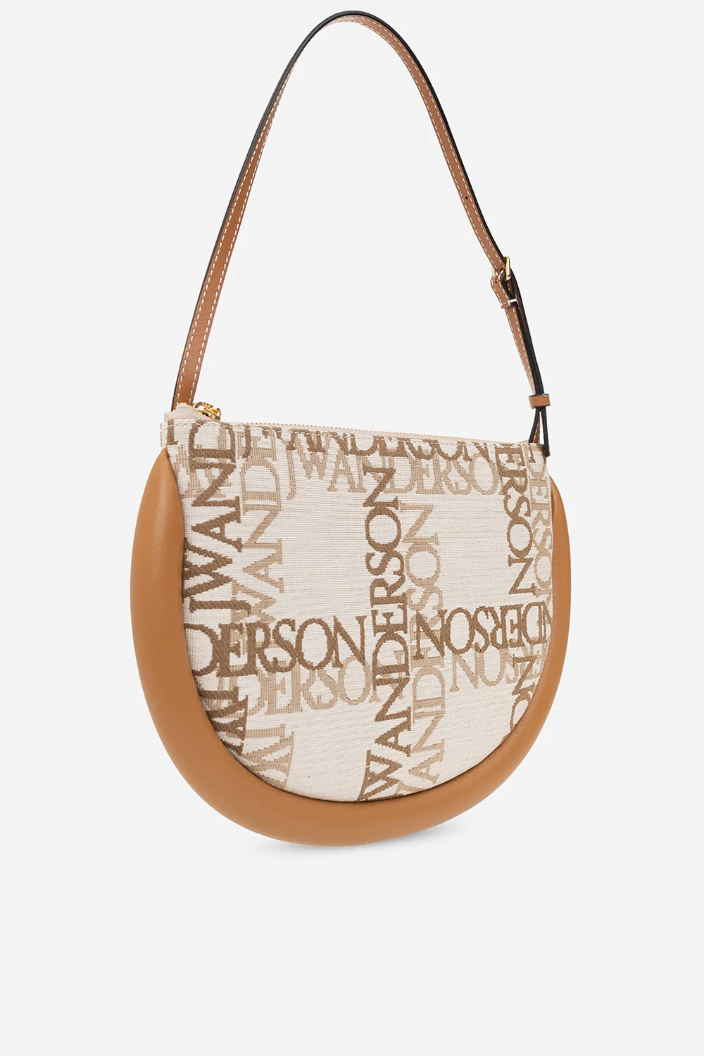 Cream, beige and brown ‘Bumper Moon’ shoulder bag from J.W. Anderson. Crafted from cotton canvas with a jacquard logo pattern and leather trimming, this model features a zip fastening, detachable, adjustable shoulder strap, gold-tone metal hardware and one internal compartment with leather lining and one card slot.