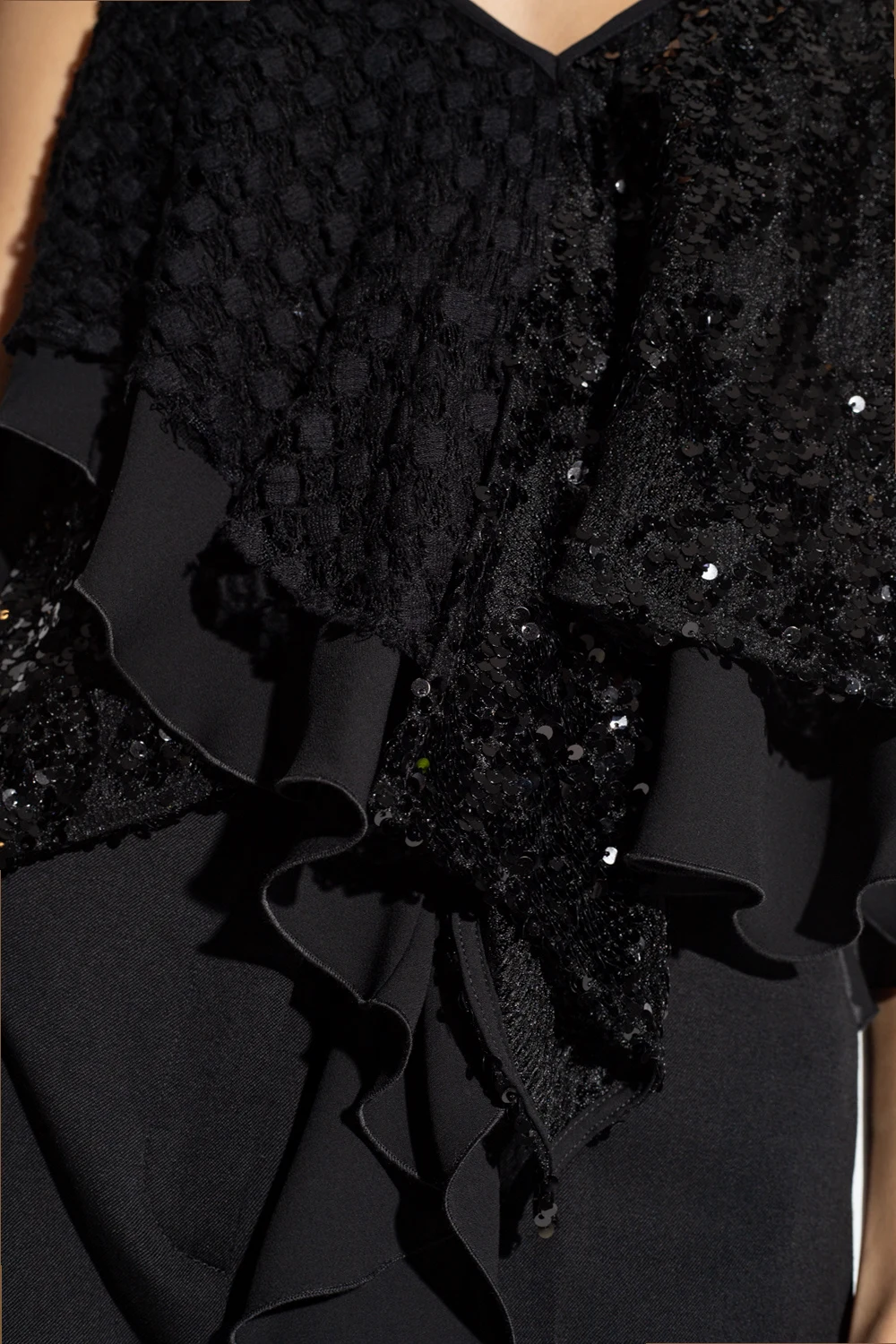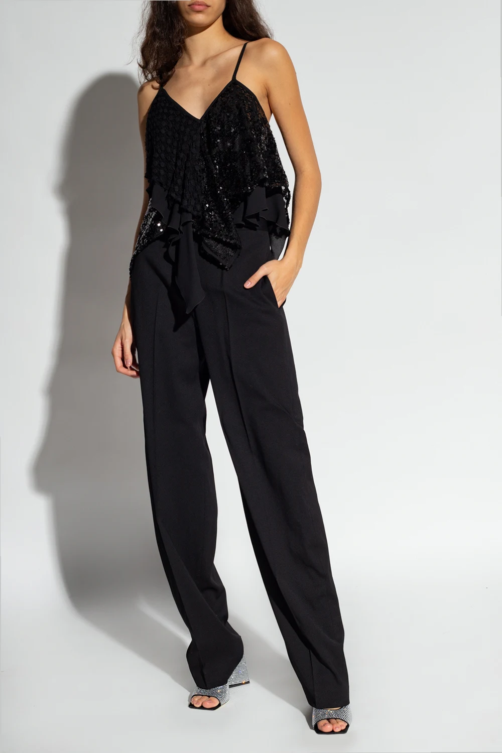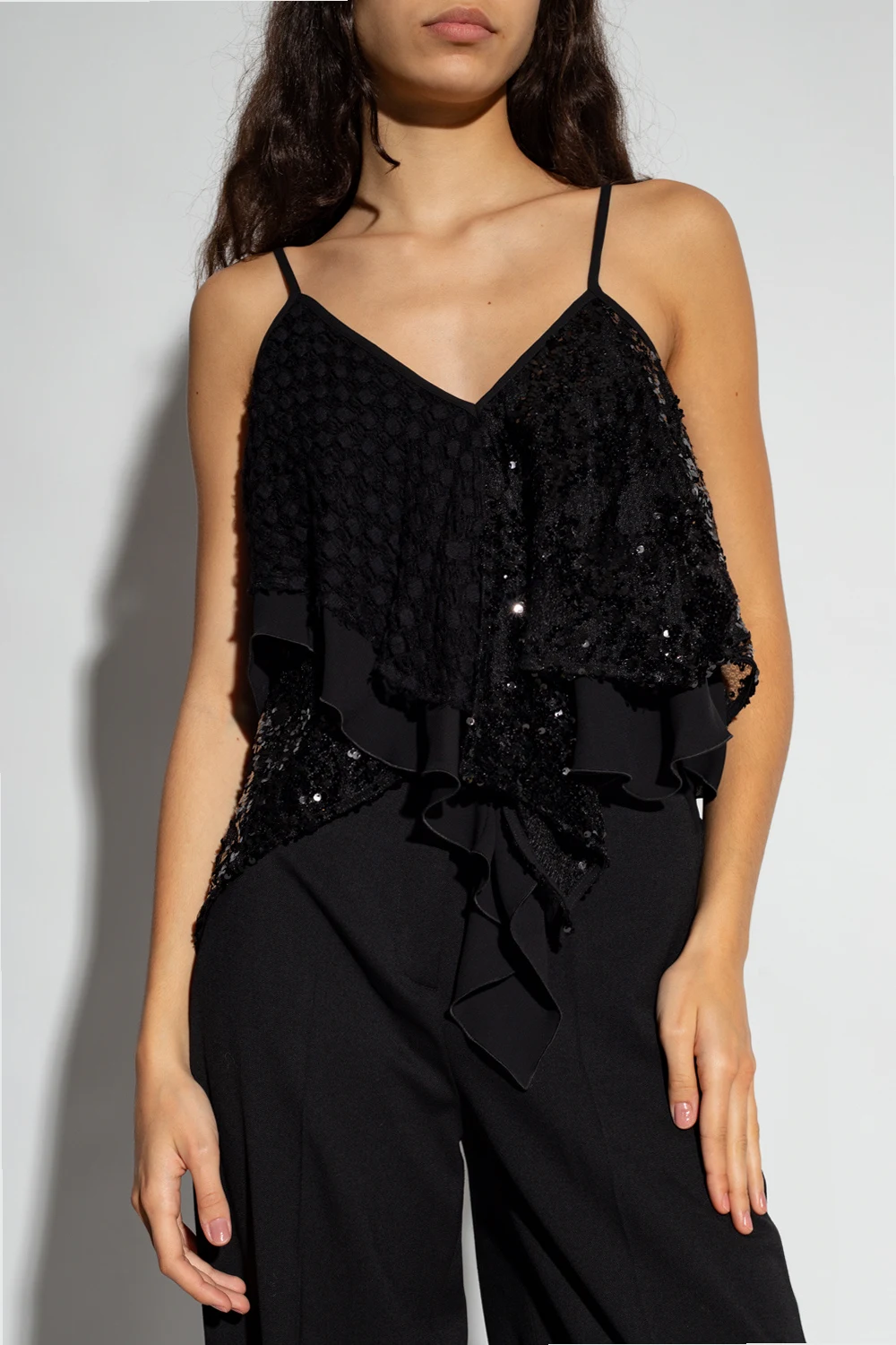 Black ‘Thelma’ tank top from The Attico. Crafted in contrasting fabrics and spruced up with glossy sequins, this style features a cropped, asymmetrical fit, lace accents, a V-neckline, ruffle detailing and a back hook & eye closure accentuated with silver-tone logo hardware.