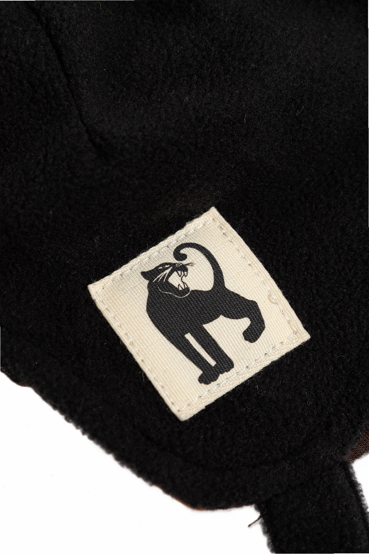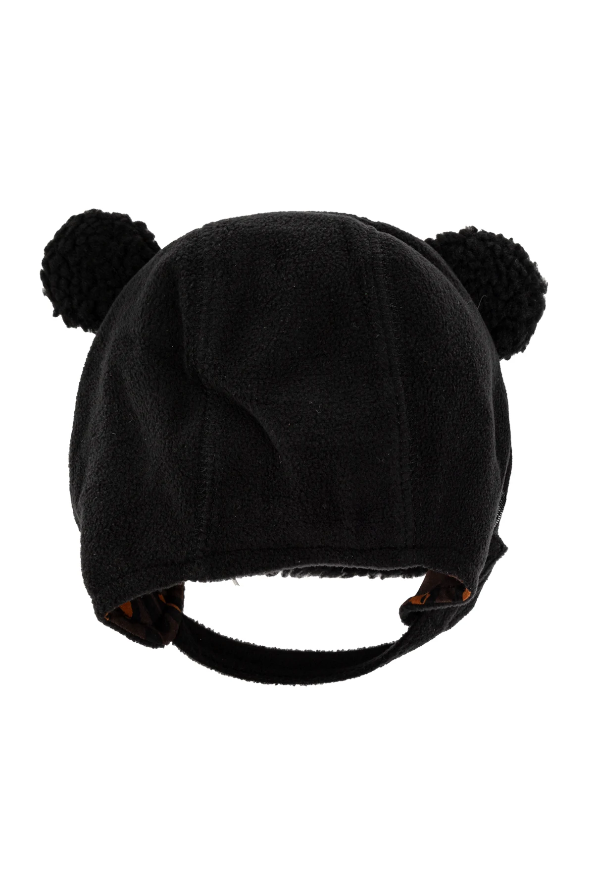 Innen ist die Mütze mit einem Muster in orange-schwarzen Motiven versehen, was ihr einen stilvollen Akzent verleiht. Der Kinnriemen mit Klettverschluss sorgt für einen sicheren und stabilen Halt der Mütze auf dem Kopf des Kindes. Auf einem der Ohrenschützer befindet sich ein rechteckiger Aufnäher mit dem Bild einer Katze, der das Logo des Designers oder der Marke sein könnte und dem Ganzen einen subtilen Charakter verleiht.