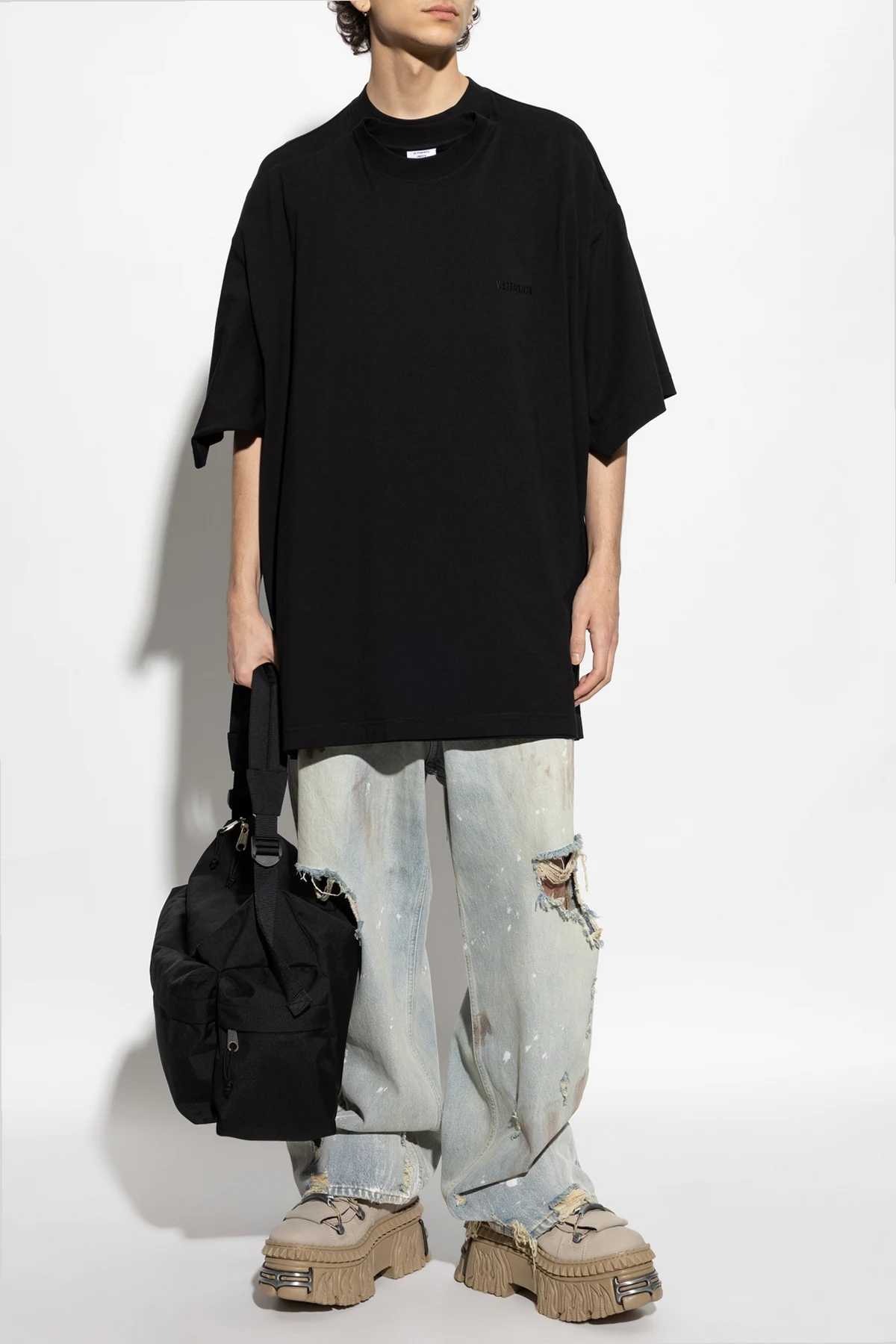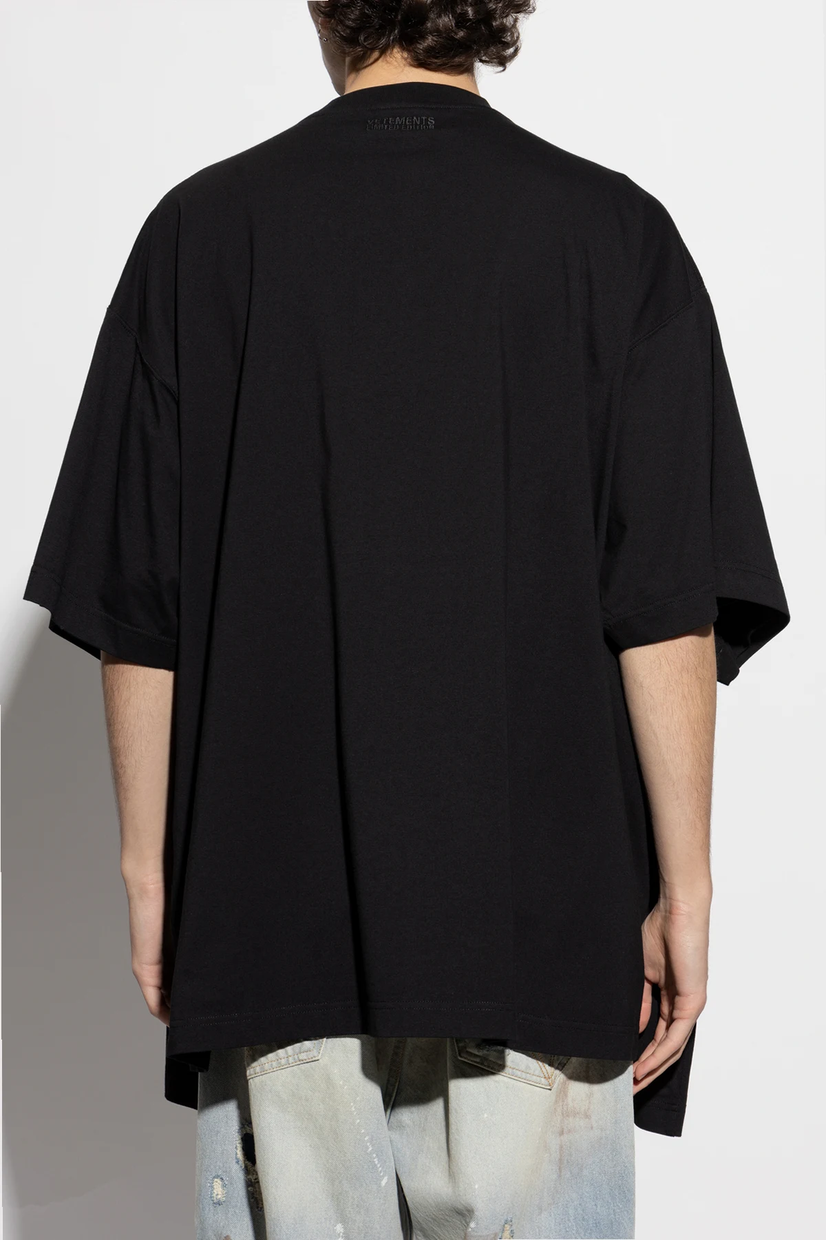 Wir präsentieren Ihnen das zweilagige Oversize-T-Shirt der renommierten Marke VETEMENTS, das die Verkörperung von modernem Stil und Komfort ist. Hergestellt aus hochwertigster Baumwolle, zeichnet sich dieses schwarze T-Shirt durch Weichheit aus, die den ganzen Tag über Bequemlichkeit garantiert.