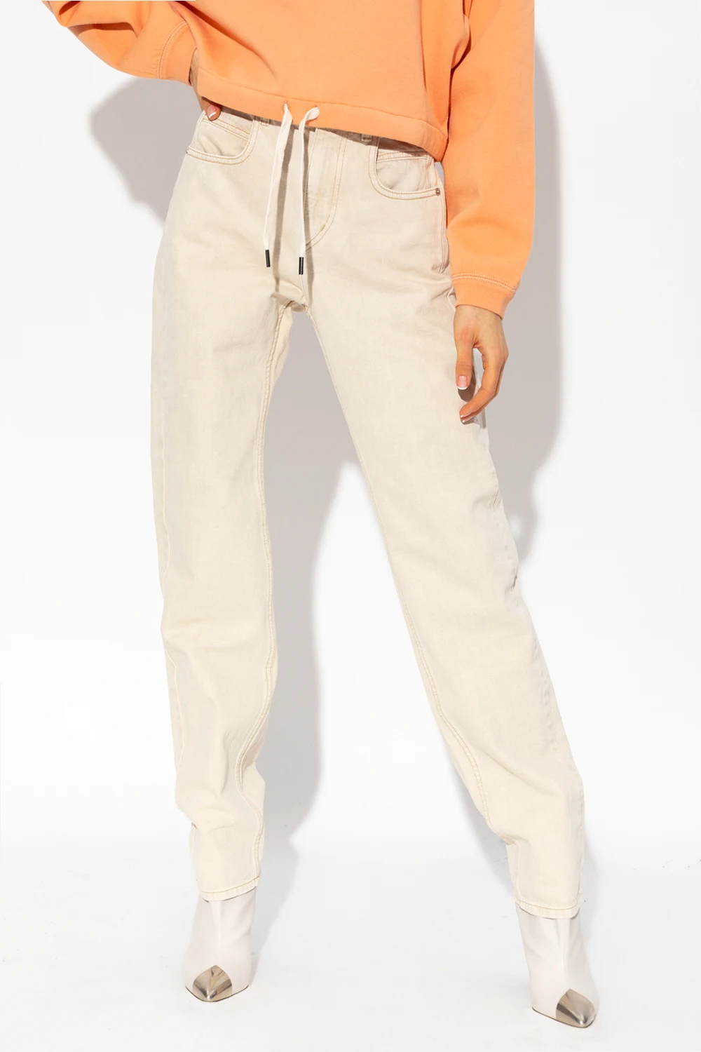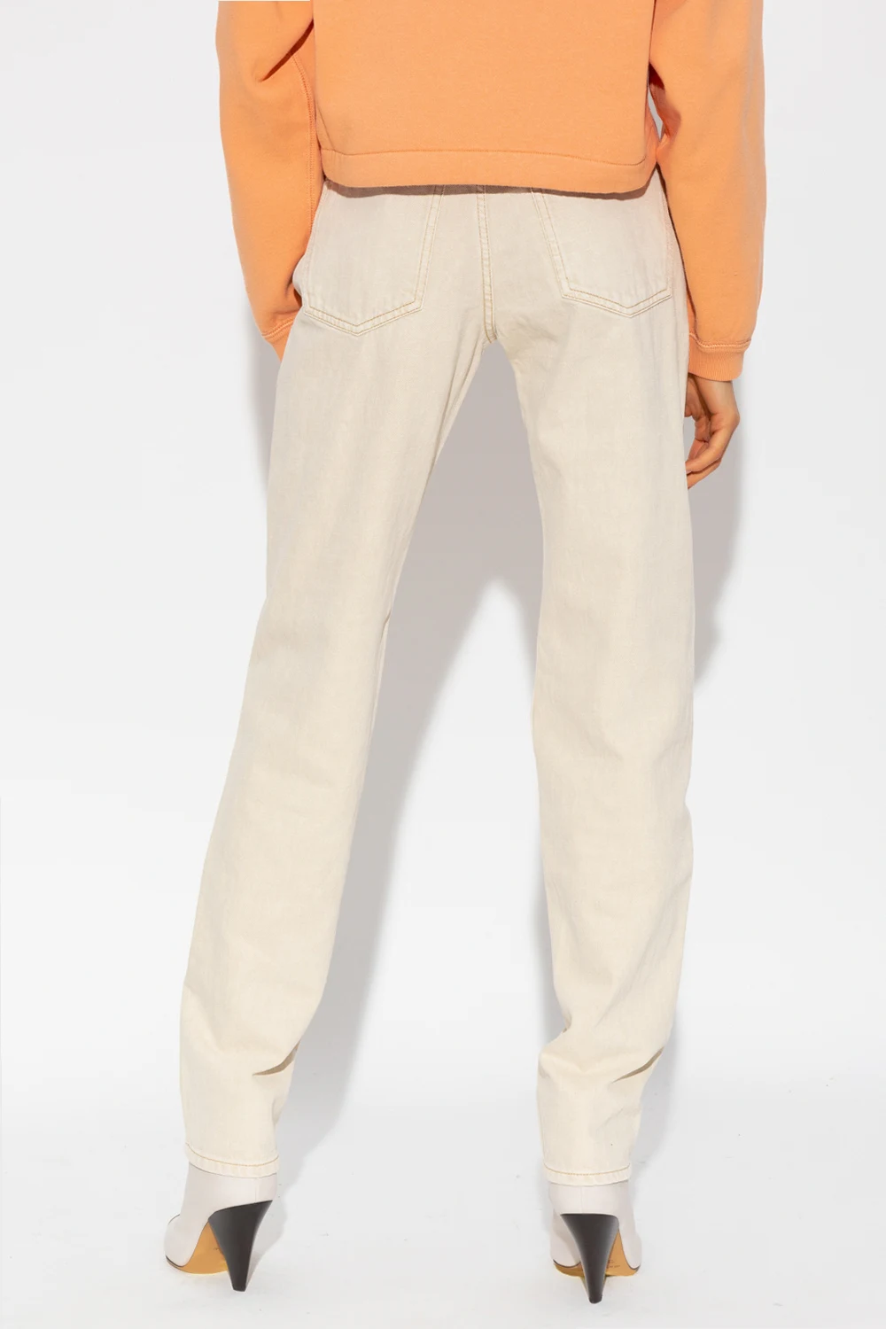 Cream ‘Vendelia’ high-waisted jeans from Marant Étoile. Fastened with a zip and button, this pair features a white logo patch at the back, four slip pockets and straight legs.