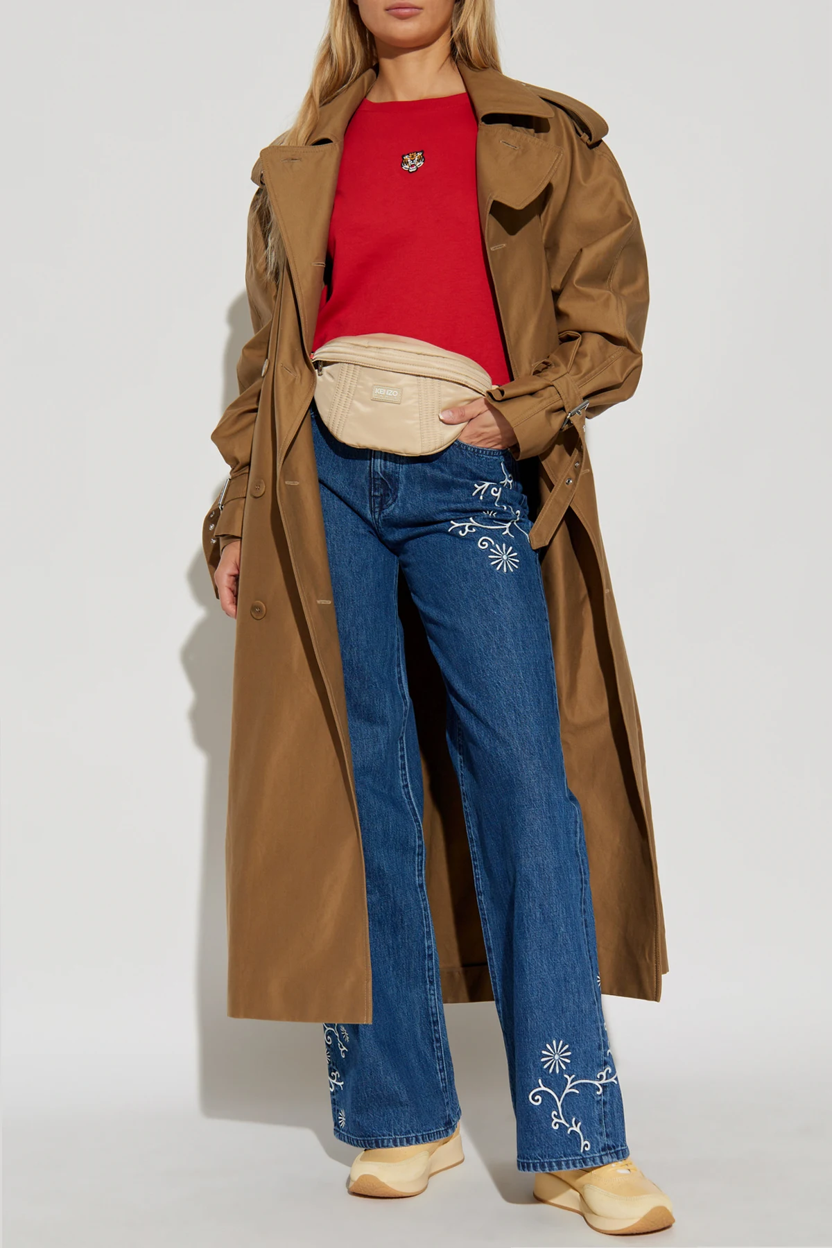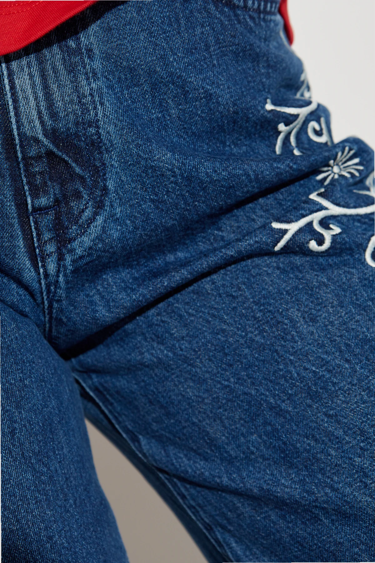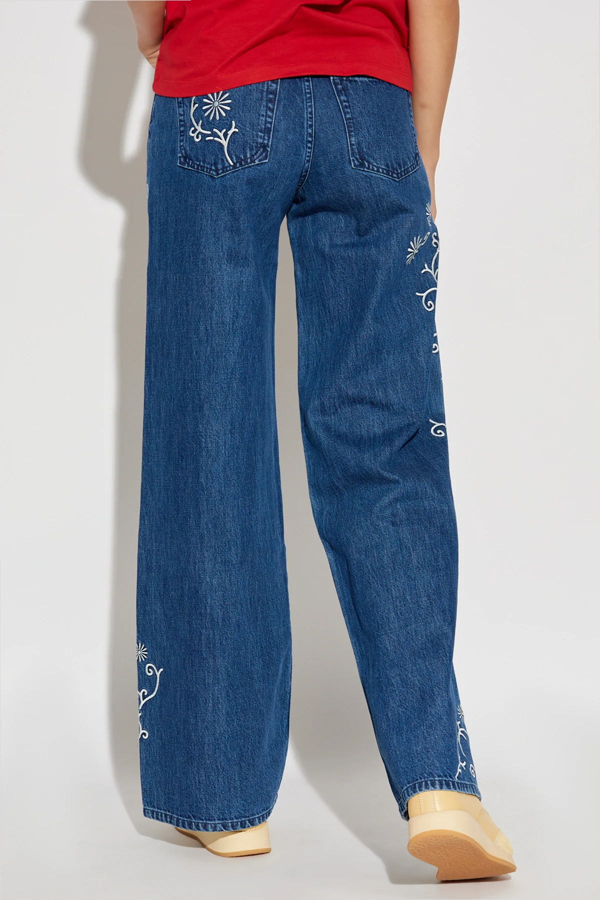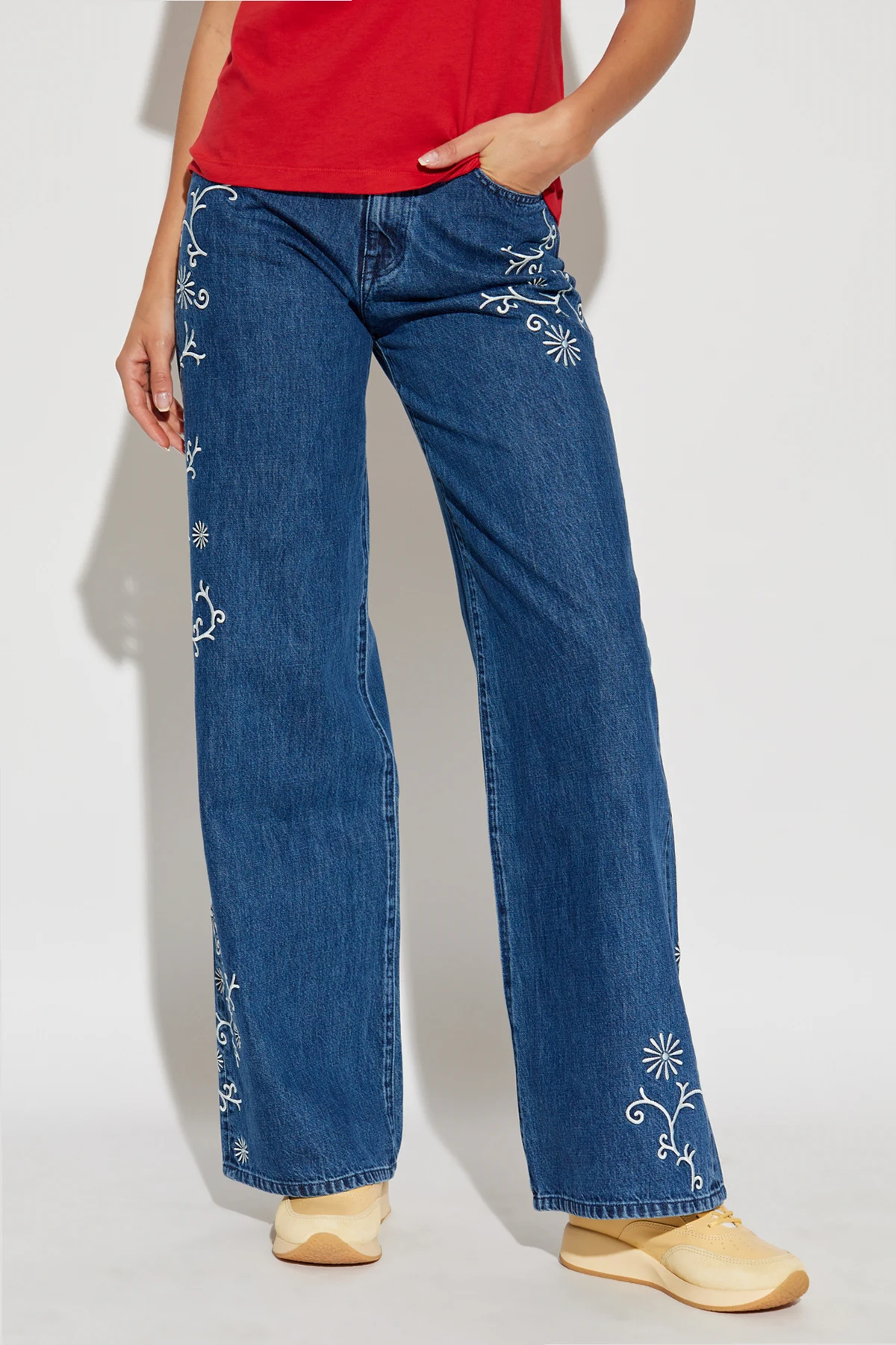 Weite Beine und eine Standard-Taille verleihen ihnen einen lässigen Look, ideal sowohl für den Alltag als auch für elegantere Outfits. Zarte, weiße Stickereien mit Pflanzenmotiven entlang der Seitennähte und um die Taschen herum verleihen den Jeans einen einzigartigen Charme und künstlerischen Charakter.