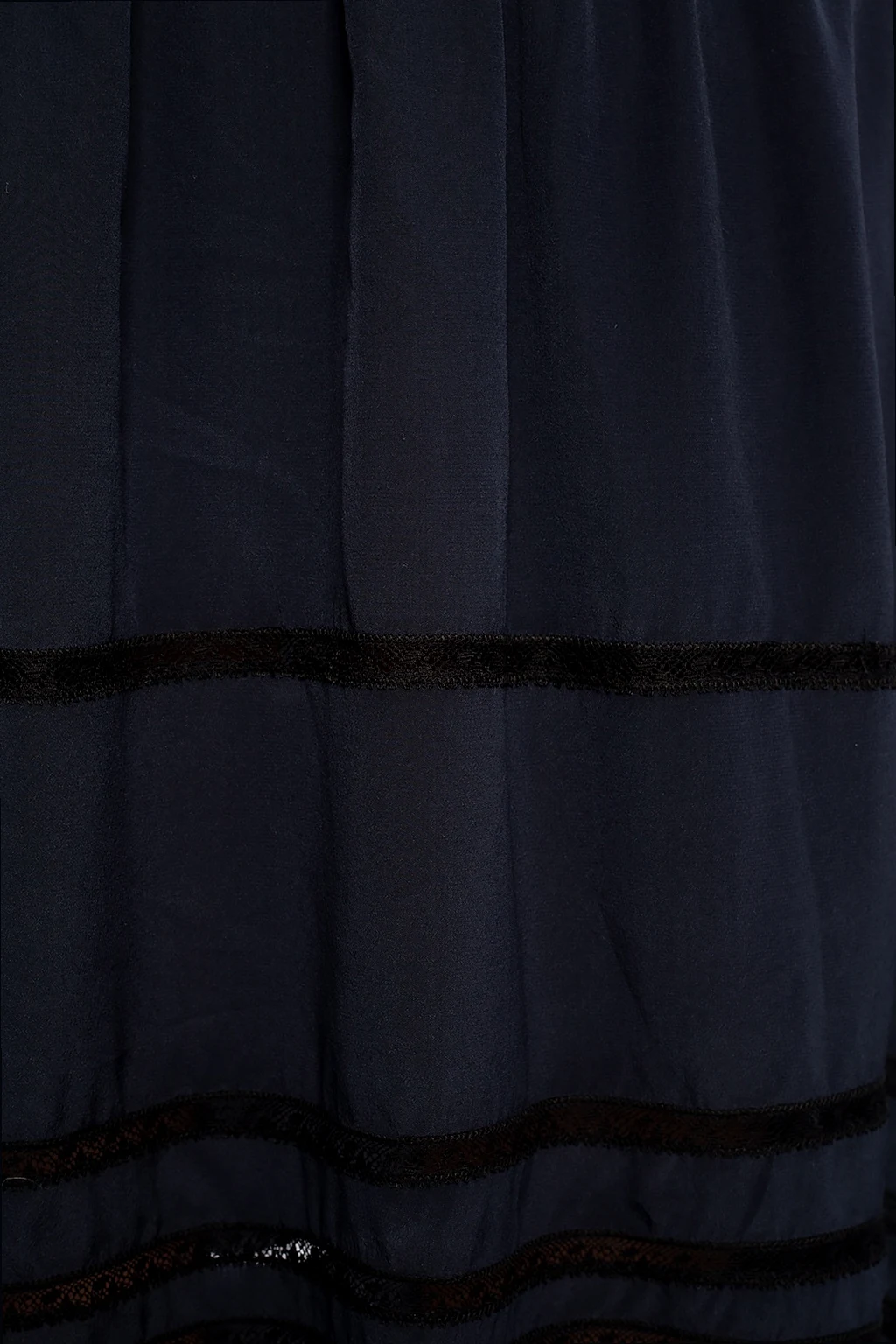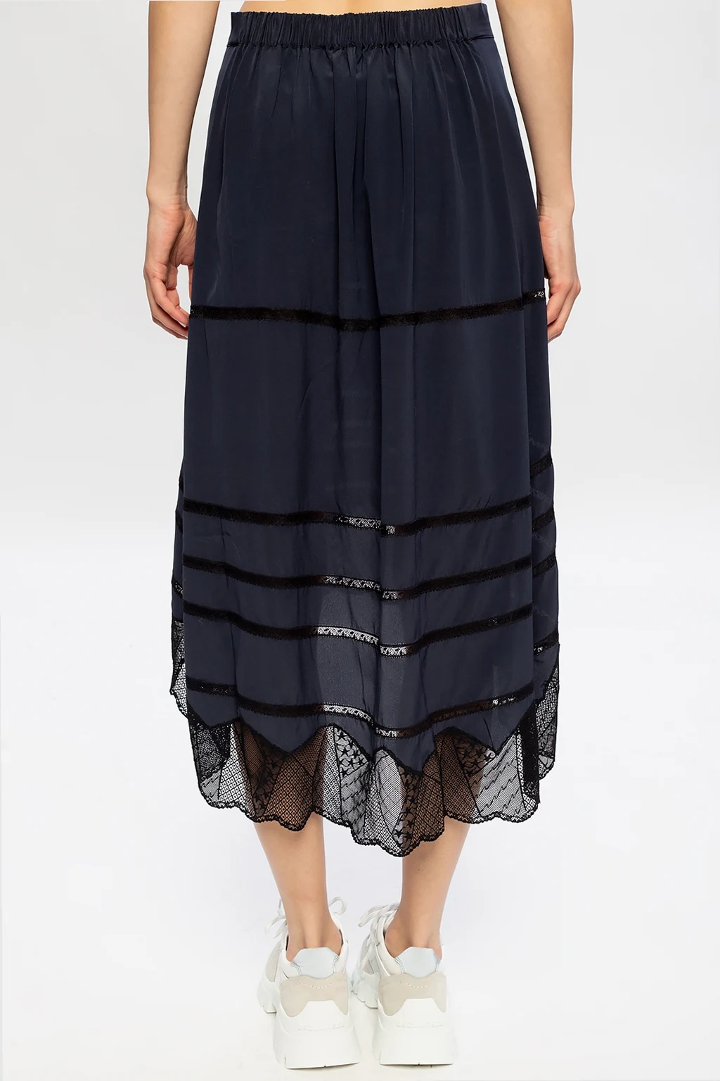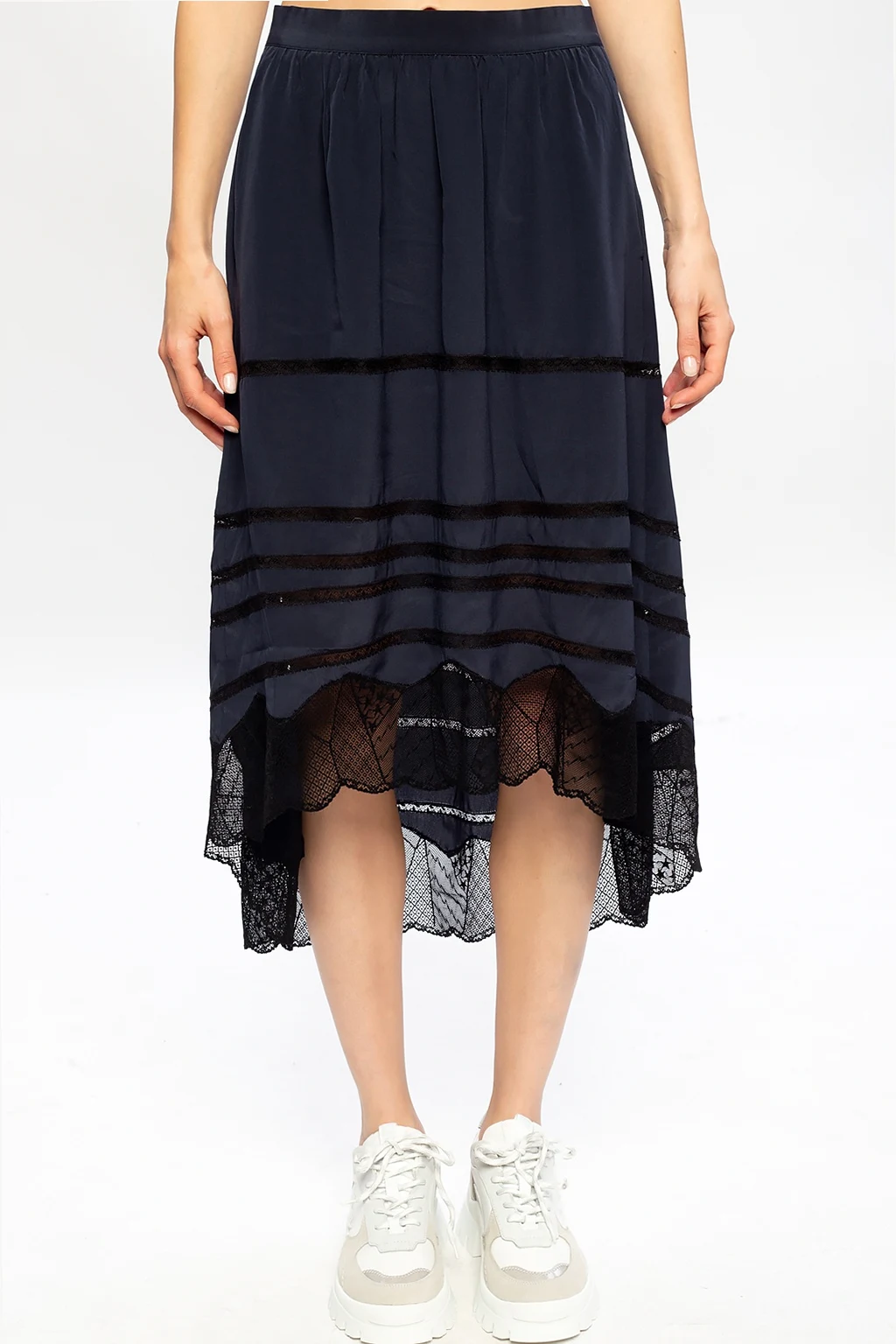 Navy and black asymmetrical skirt from Zadig & Voltaire. Crafted from silk, this garment is complete with an elastic waistband, lace trims in black and side pockets.