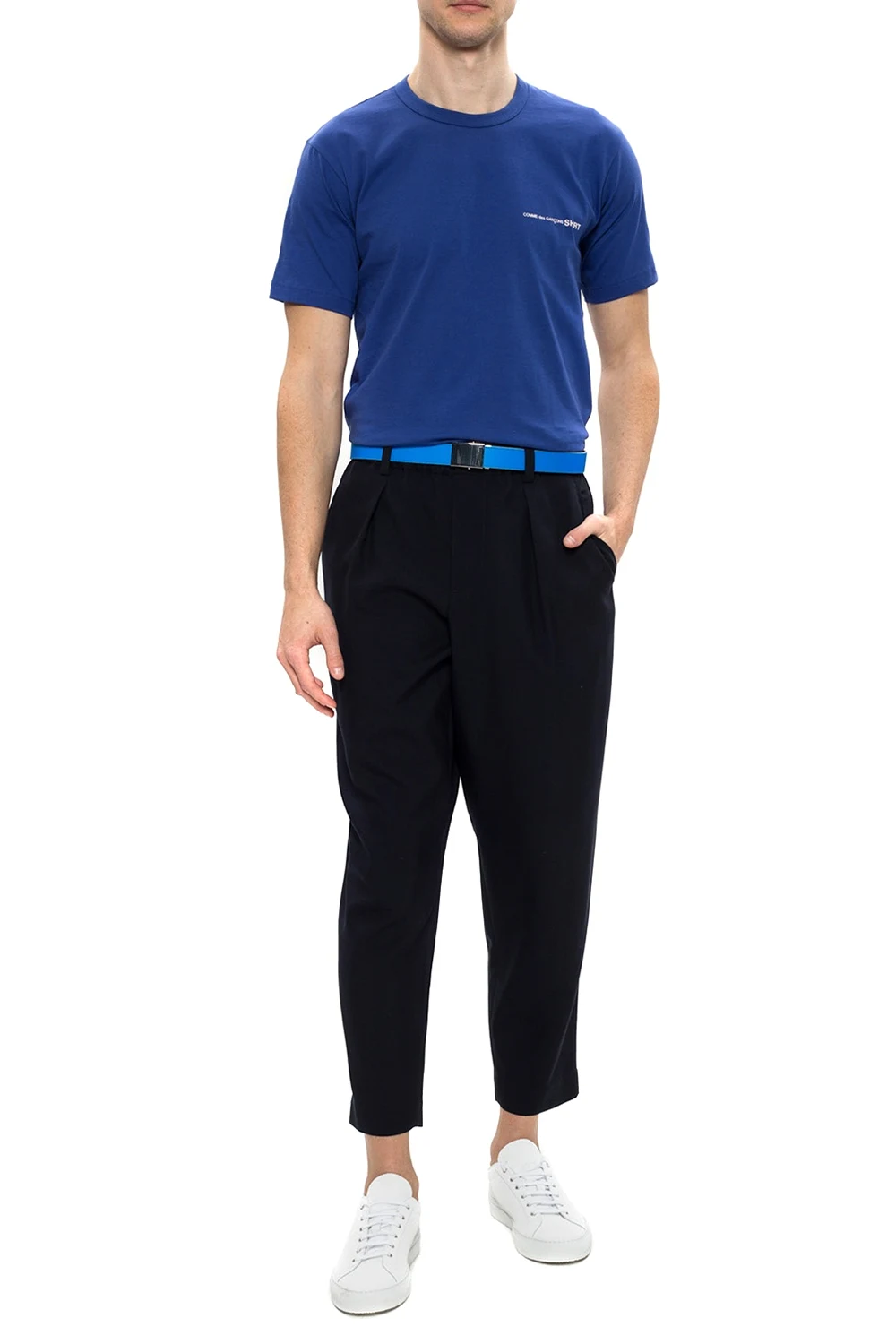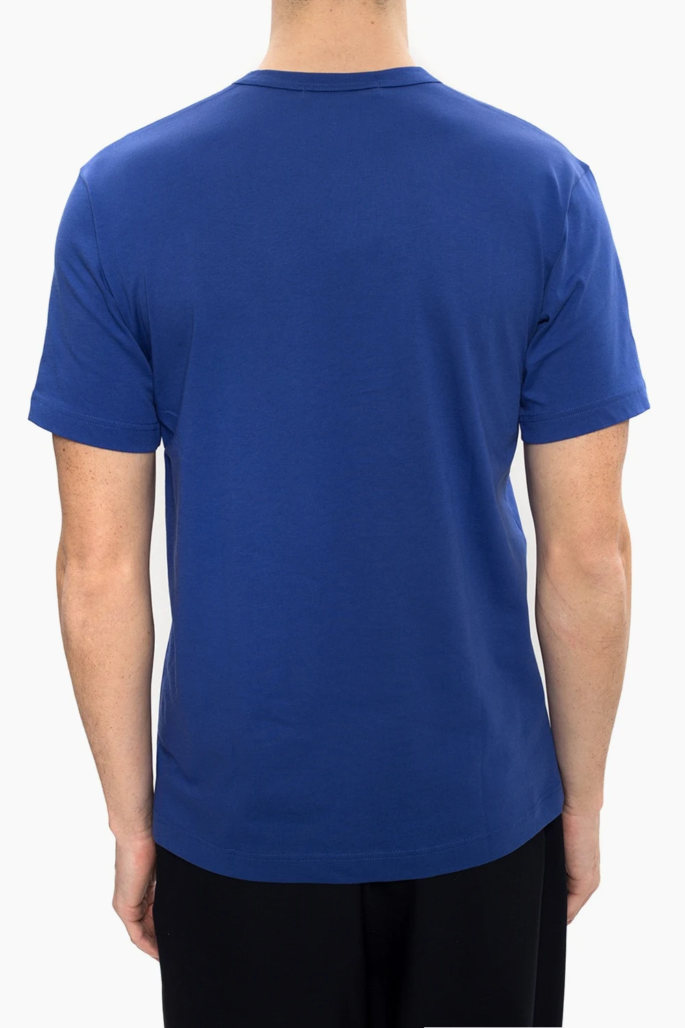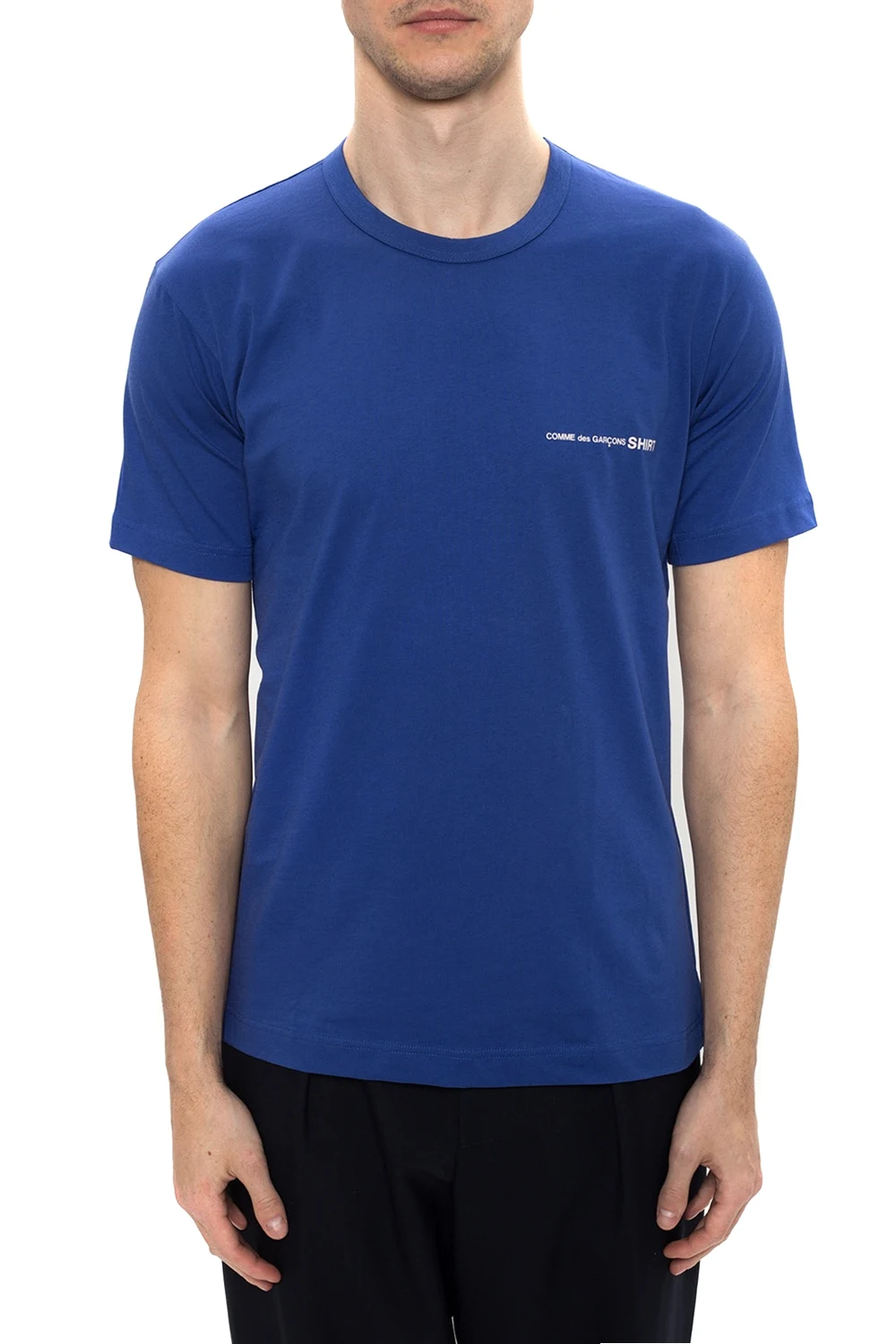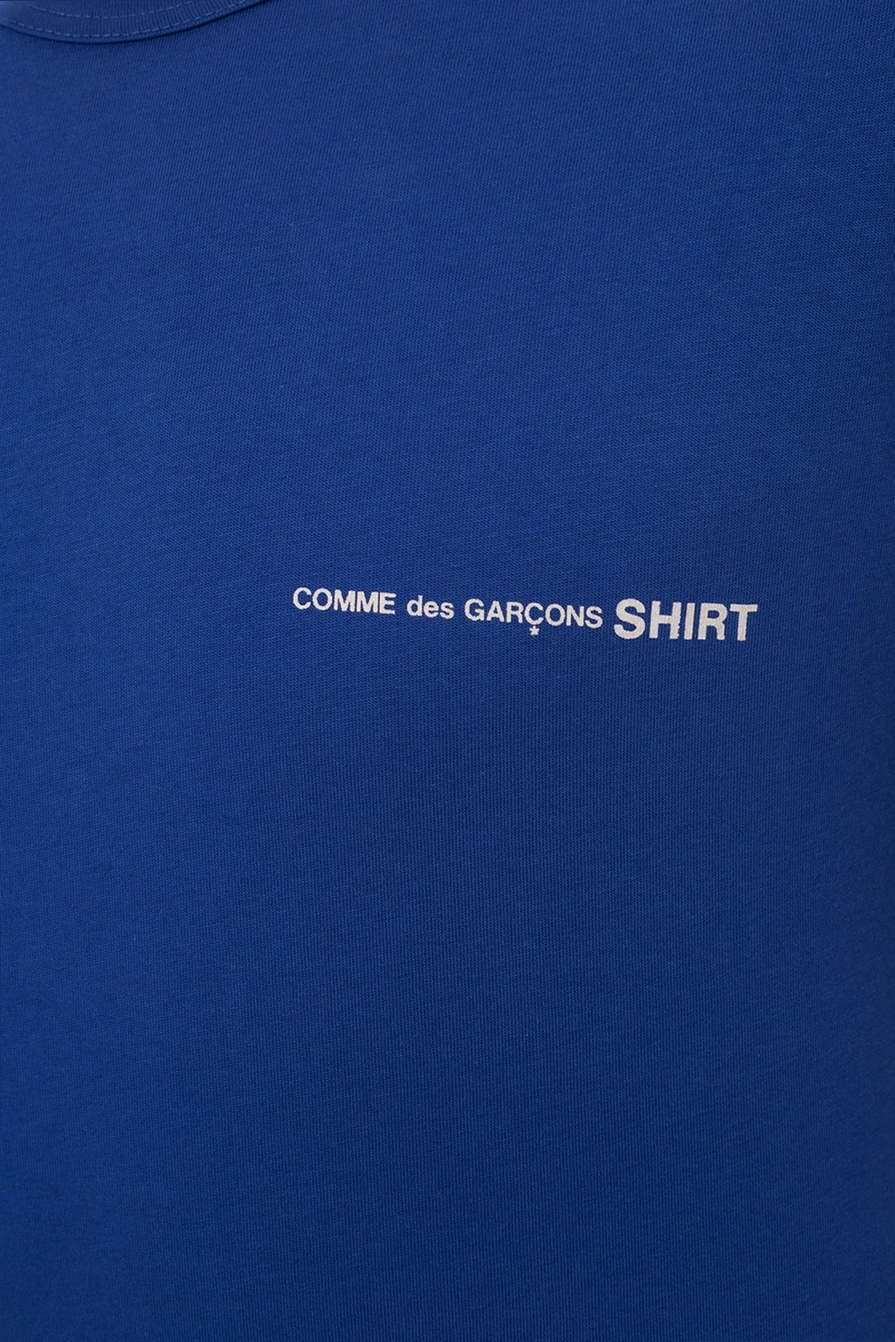 Blue T-shirt from Comme des Garçons Shirt. Made of cotton. White logo print on the front. Round neck. Short sleeves.
