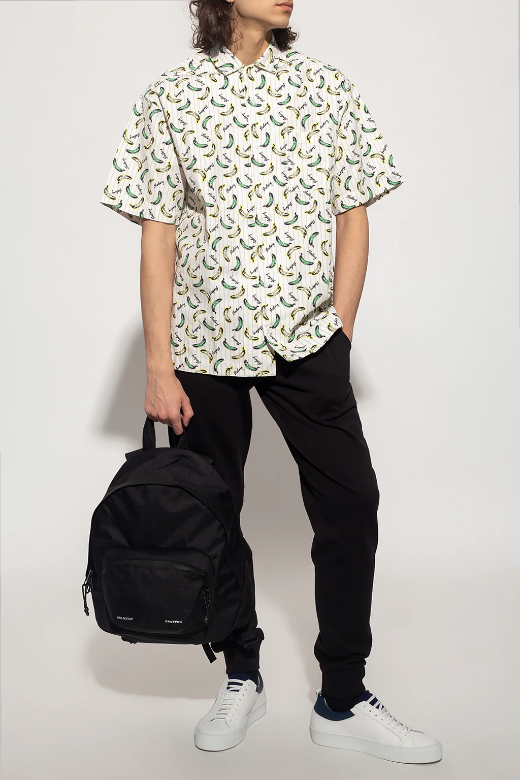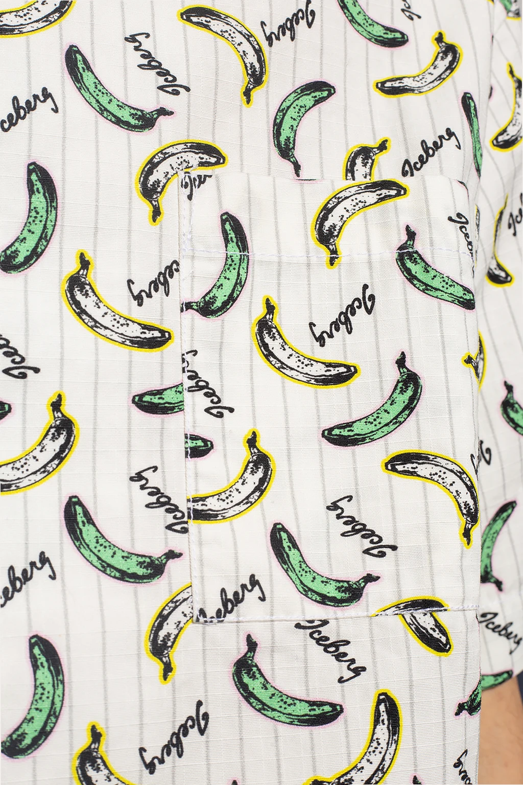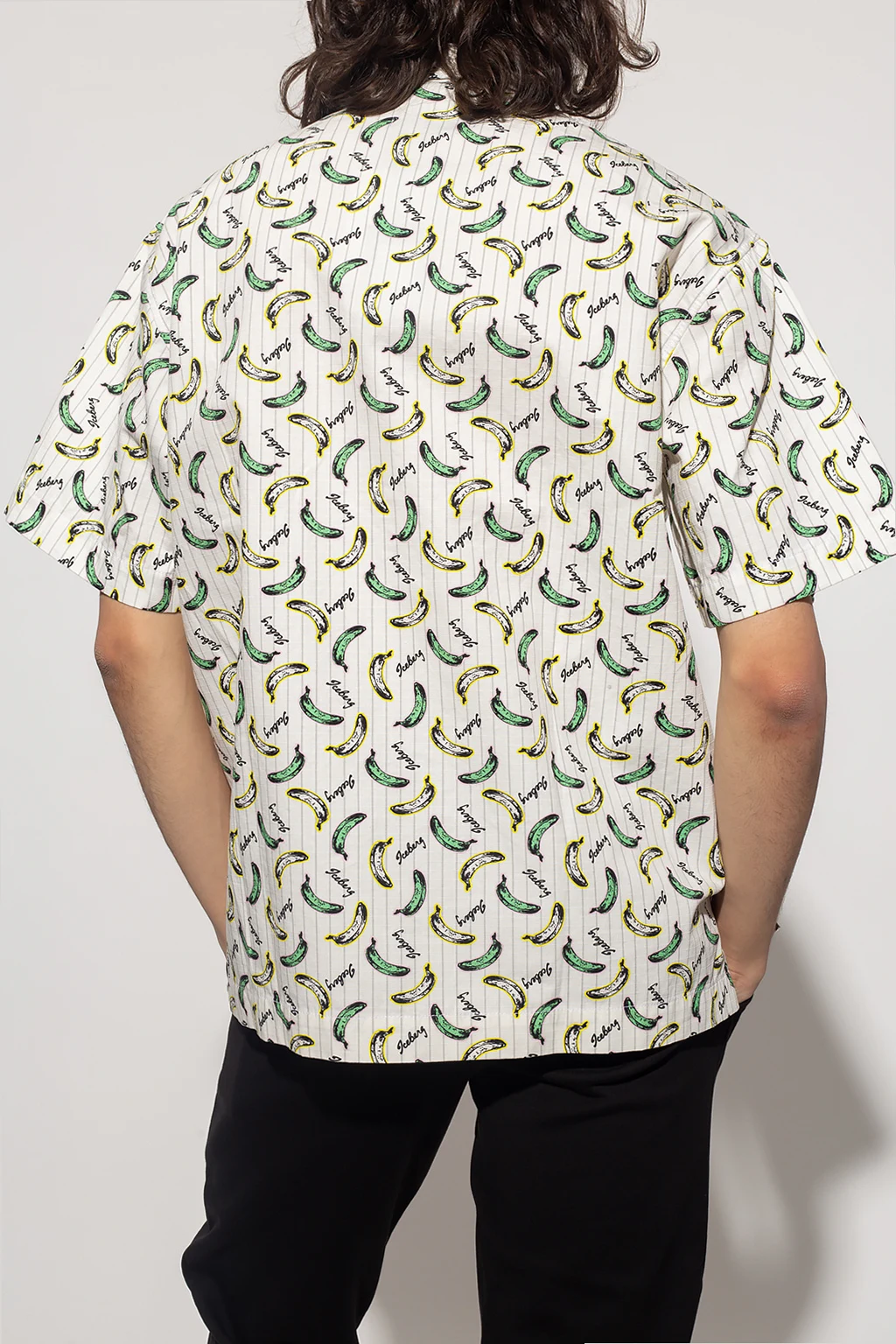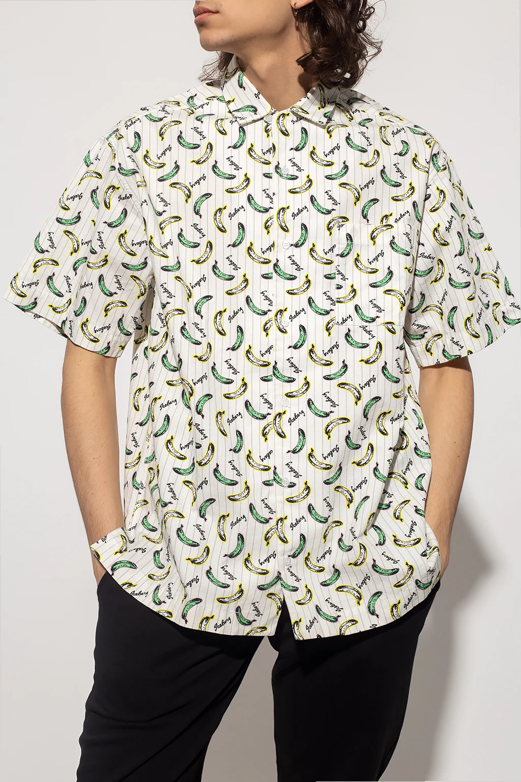 White shirt from Iceberg. Made of cotton, this style showcases a colourful graphic print with the brand's logo. It is complete with button fastenings, a slip chest pocket, short sleeves and side slits on the bottom hem.