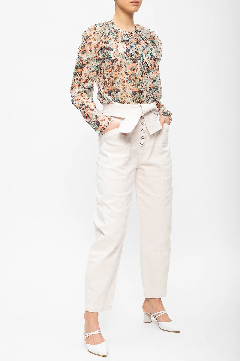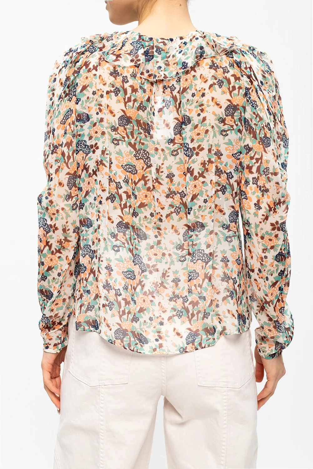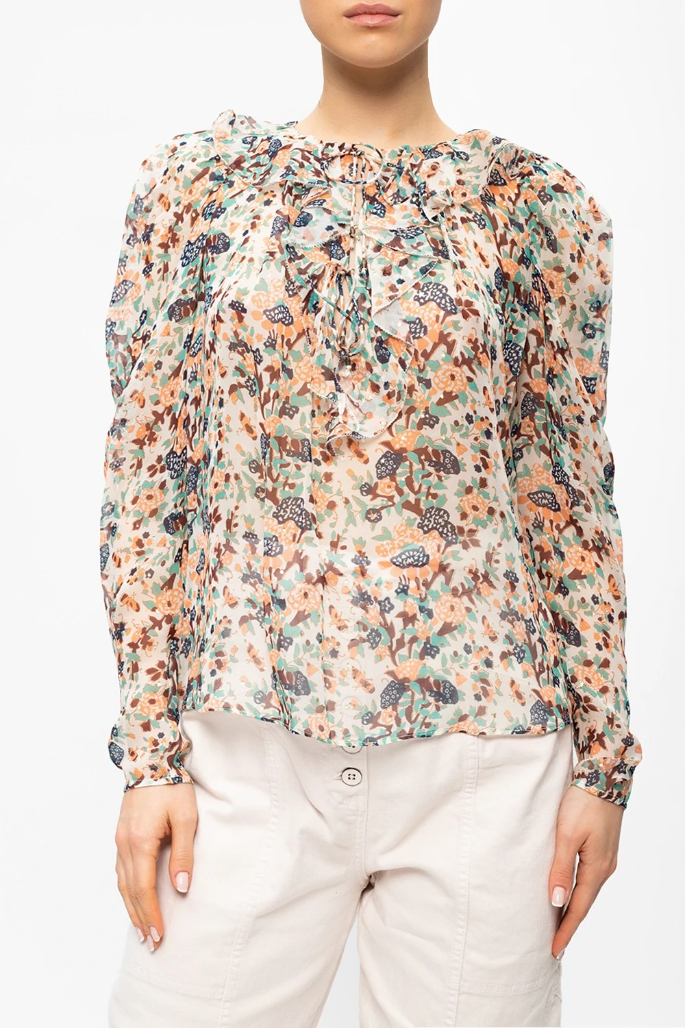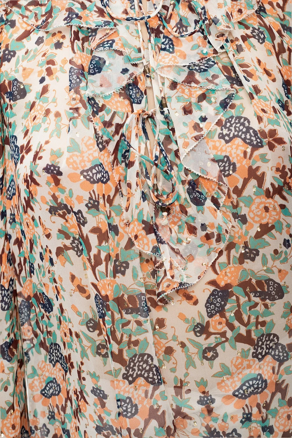 Multicolored, transparent ‘Astrid’ top from Ulla Johnson. Made of silk, this long sleeve design features tie fastening and a pattern inlaid with a gold-tone metallic thread.