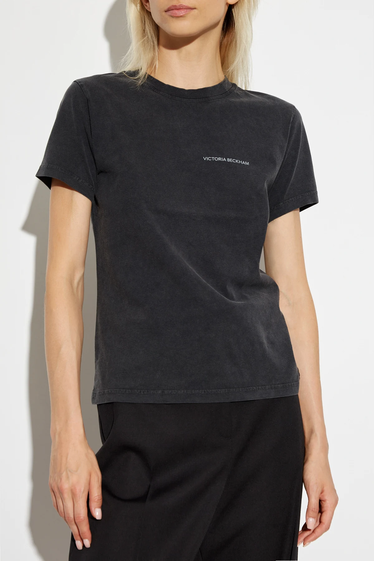 Das elegante Erscheinungsbild des T-Shirts wird durch den figurbetonten Schnitt und die kurzen Ärmel unterstrichen. Auf der Vorderseite, auf der linken Brustseite, befindet sich ein dezentes, weißes Logo "VICTORIA BECKHAM", das dem Ganzen Eleganz verleiht. Die Rückseite des T-Shirts bleibt glatt, was den minimalistischen Stil bewahrt.