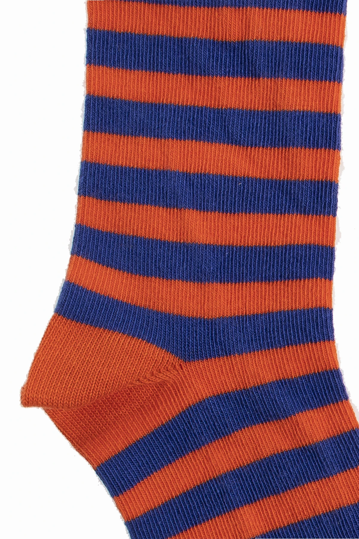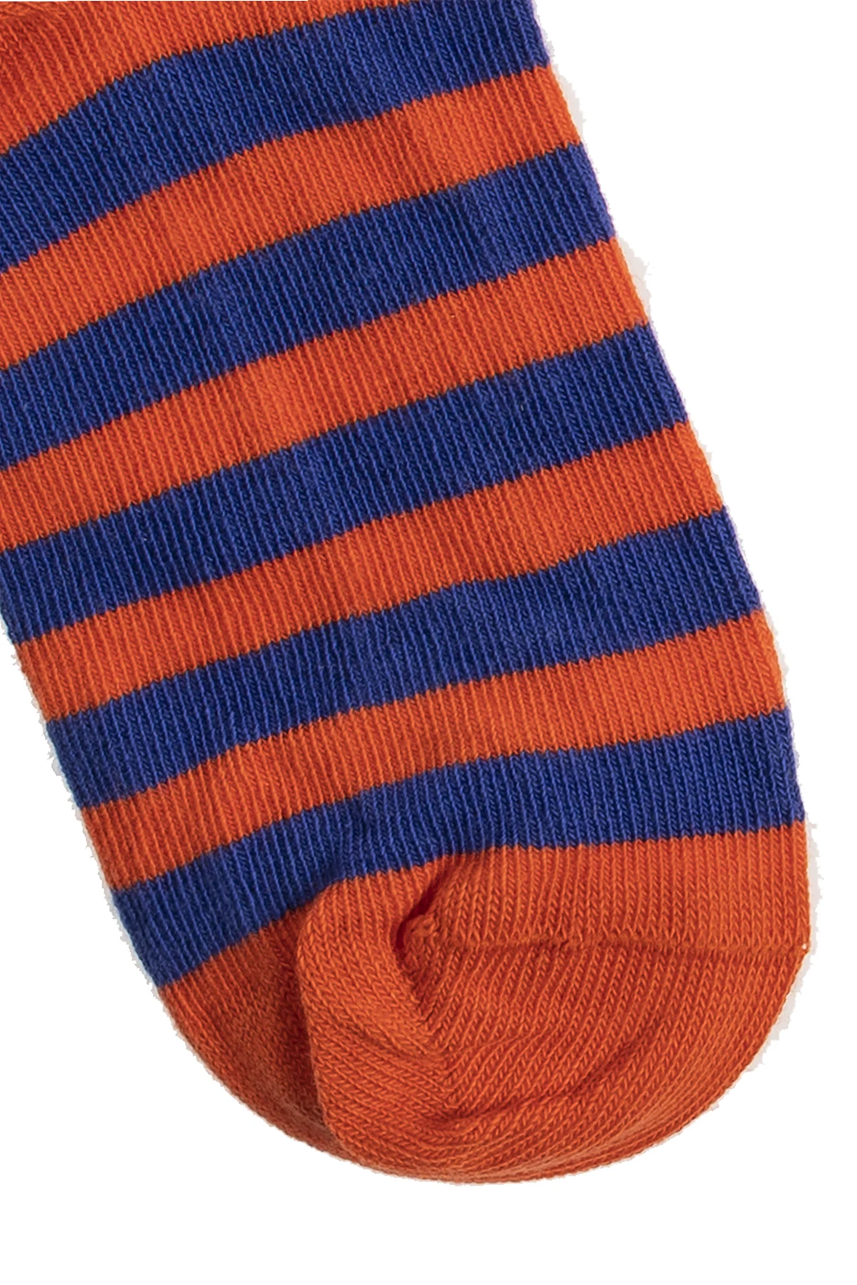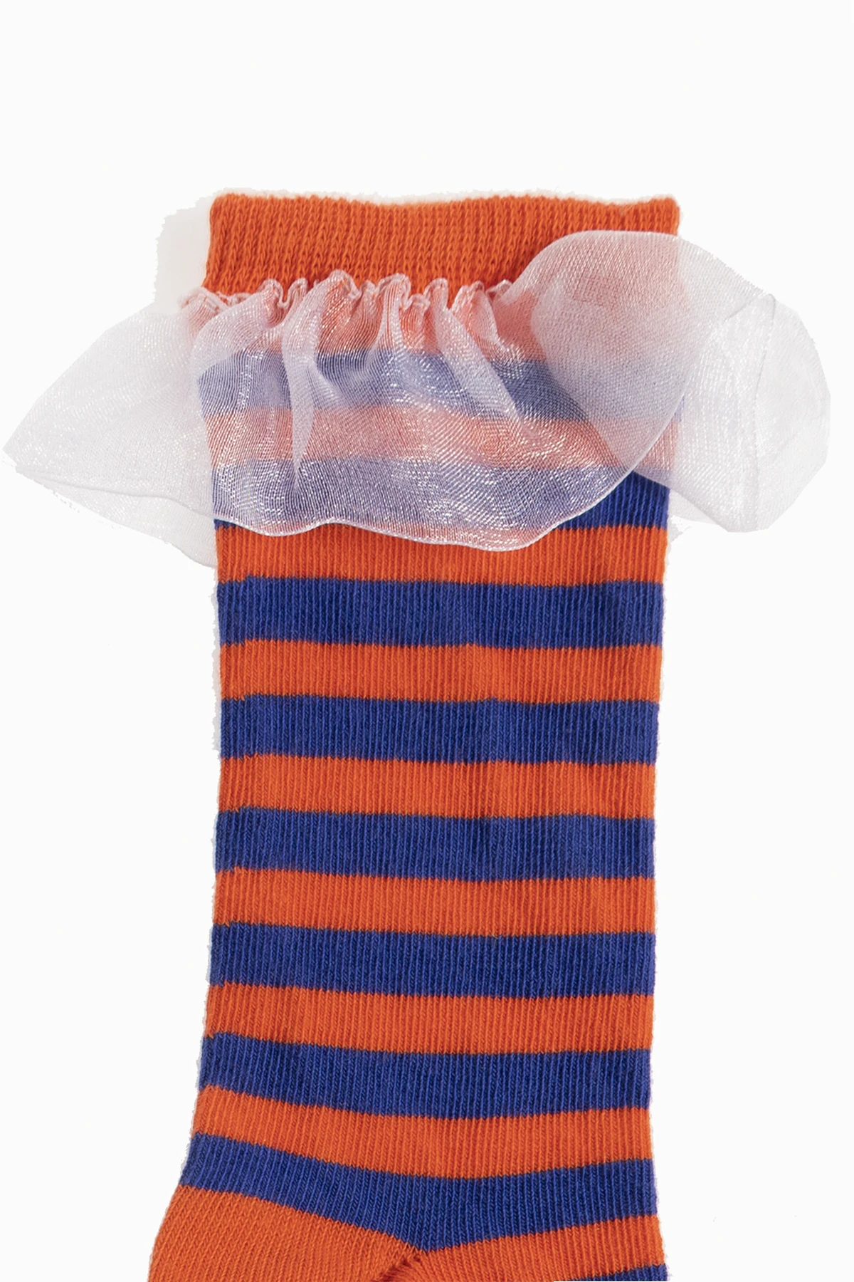 Red and navy socks from Mini Rodini. Crafted from organic cotton with the GOTS certificate, this pair features a stripe pattern, white ruffle and ribbed cuffs.